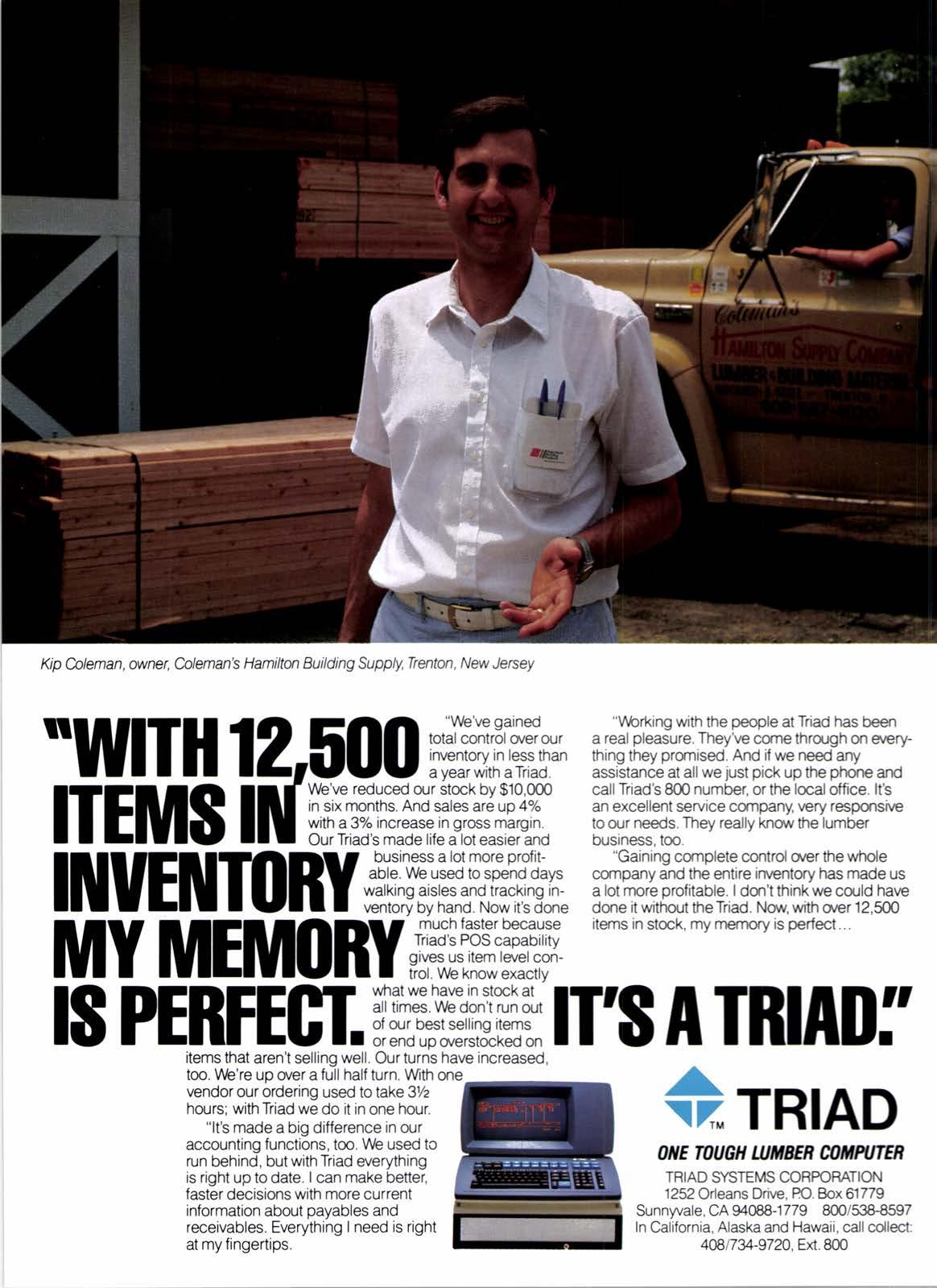 Vlrb've reduced our stock by $10,000 in six rnonths. And sales areup 4"/o with a 3% increase in gross margin. Our Triad's made life a lot easier and business a lot more profitable. V1b used to spend days walking aisles and tracking in\ entory by hand. Now its done