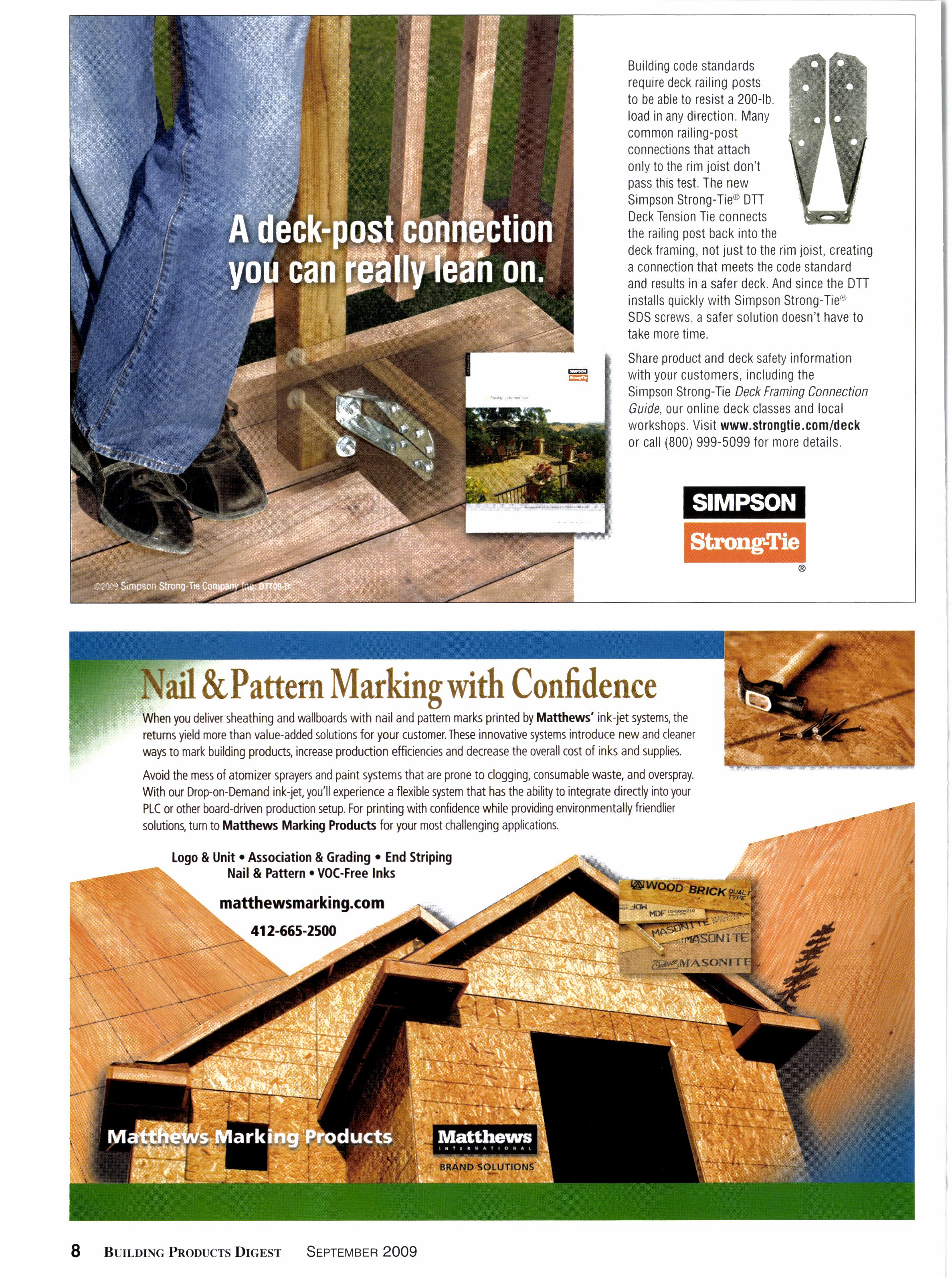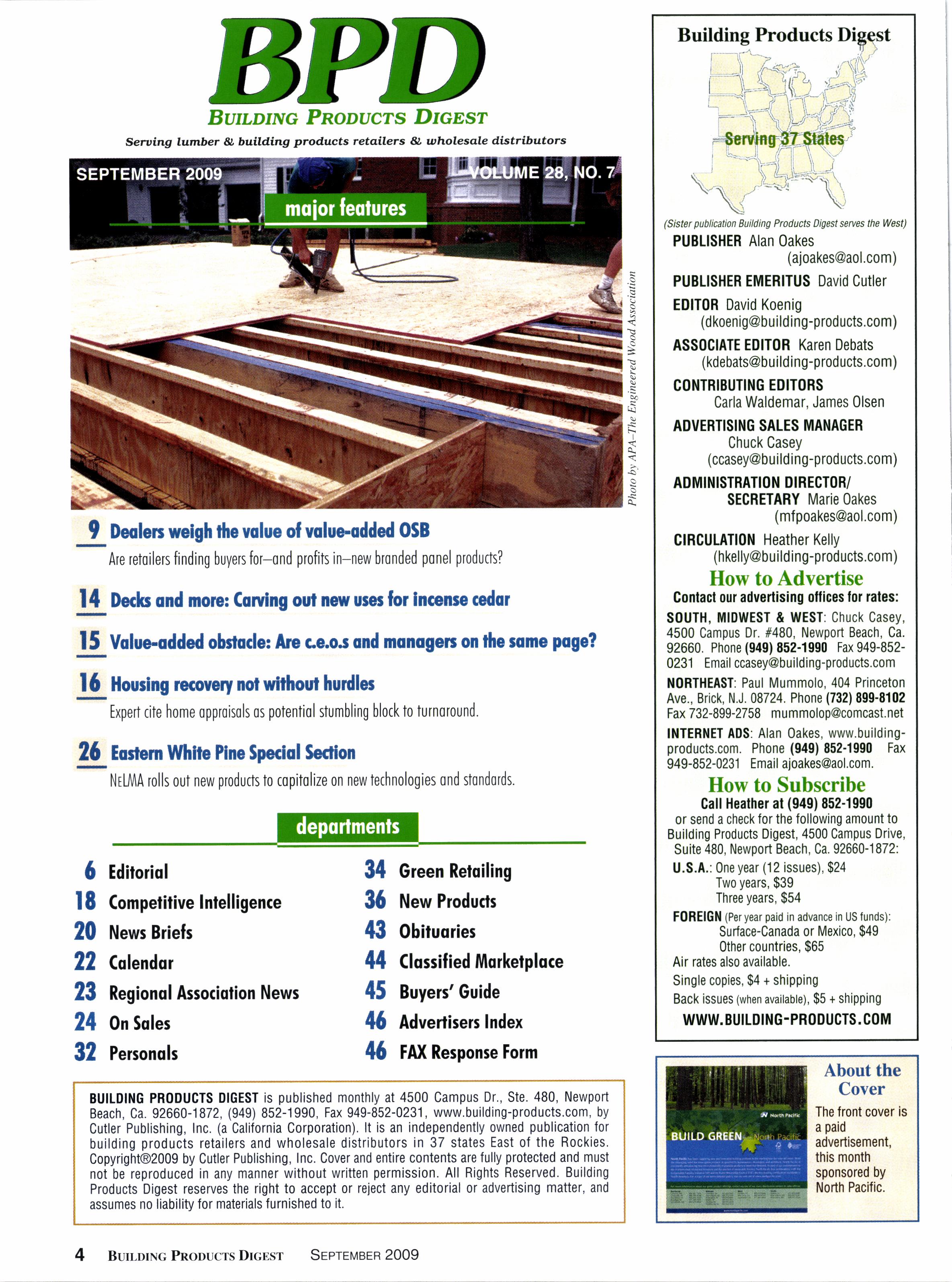 building products retailers and wholesale distributors in 37 states East of the Rockies. Copyright@2oo9 by Cutler Publishing, Inc. Cover and entire contents are fully protected and must not be reproduced in any manner without written permission. All Rights Reserved. Building Products Digest reserves the right t0 accept or reject any editorial or advertising matter, and assumes no liabilitv for materials furnished t0 it.