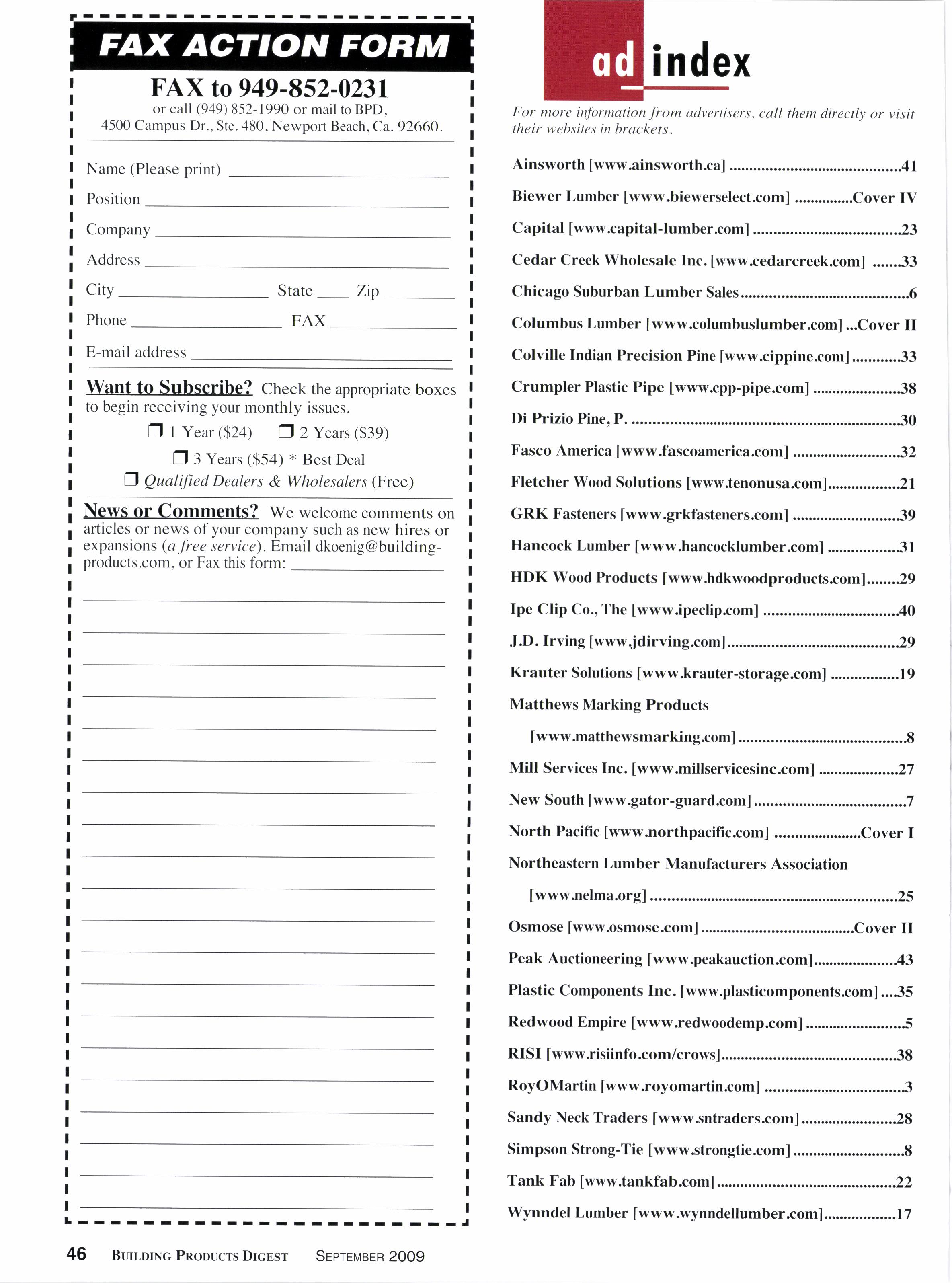 Ainsworth [www.ainsworth.ca] ....41 Biewer Lumber Iwww.biewerselect.com] ...............Cover IV Capital Iwww.capital-lumber.com] .....................................23 Cedar Creek Wholesale Inc. [www.cedarcreekcom] ......33 Chicago Suburban Lumber Sa|es........ Columbus Lumber [www.columbuslumber.com] ...Cover II Colville Indian Precision Pine [www.cippine.com]...........33 Crumpler Plastic Pipe [wwwcpp-pipe.com] .....................38