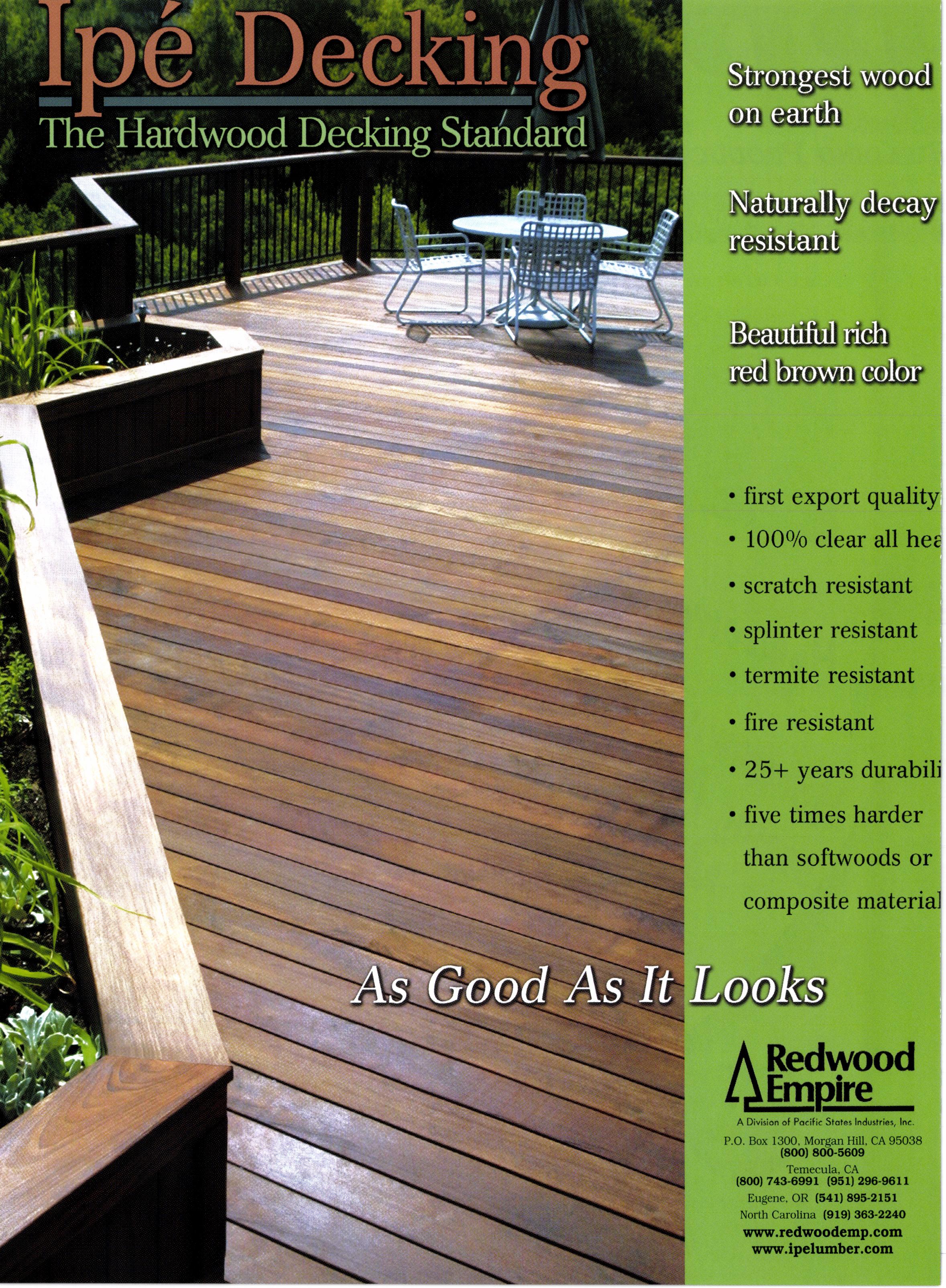 F**W | 't."-q ""w*lf;is;G Sare;s4g*:i w{cxs:J #i* ffi#$J SixrlrneL etsffiry ftrtr-rtrlilf3i $trr,rLri$illel sleh *ss! iv*cmzu: s$Jsx first export quality 1000/o clcar all hee scratch rcsistant splinter resistant termite resistant fire resistant 25+ years durabili fivc times hardcr [han softwoods or composite material 'F t J,s,#i($ " -*\ A Redwood llEmplre_ A l);v;rlon ol Parifir 5toter Indurrries. inr. I'].O. tirr lli00. l\4or{an Ilill. CA 950i18 (800) 800-5609 'I t nrccula. CA (8oo) 743-699r (95r) 296-961r Iiu{err'. OR [54f) 895-215f Norlh Clirrolina t919) 363-2240 www.redwoodemp.com www. ipelumber. com