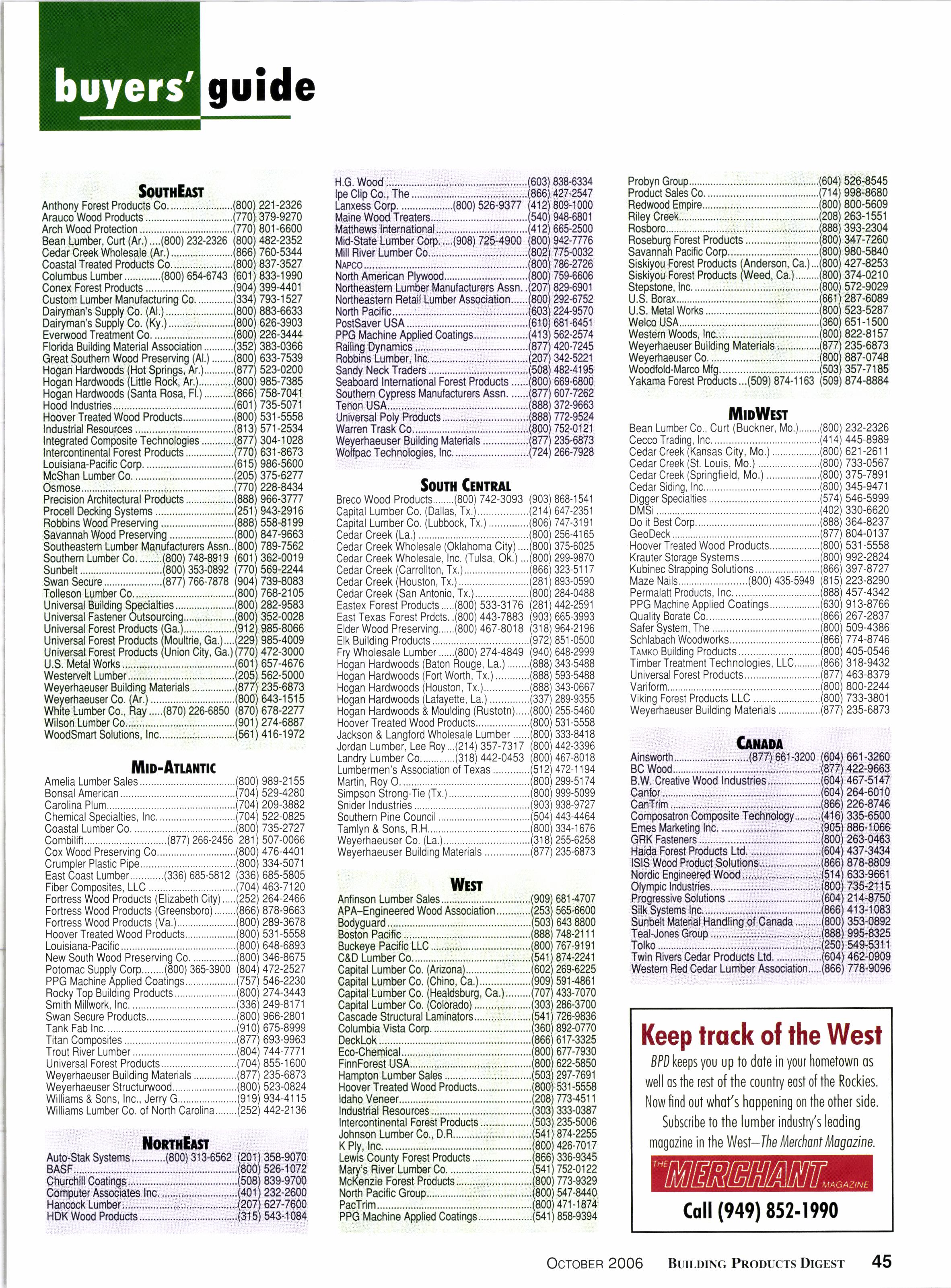 748-2111 767-9191 874-2241 269.0225 591-4861 433-7070 286-3700 726-9836 892-0770 617-3i125 677-7930 622-5850 297-7691 531-5558 7734511 333-0387 235-5006 874-2255 426-7017 336-9345 752-0122 773-9329 547-944fr 471-1874 858-9394 U.S. MetalWorks.... Welco USA.............. u1-2926 379-9270 801-6600 482-2352 760-5344 897-3527 833-'1990 399-4401 793-1527 883-6633 626-3903 226-3444 383-0366 633-7539 523-0200 985-7385 758-7041 735-507't 531 -5558 571-25€/304-1 028 631.8673 986-5600 375-6277 228-U34 966-3777 943-29't6 558-81 99 847-9663 789-7562 362-0019 589-2244 739-8083 768-2105 282-9583 352-0028 985-8066 985-4009 472-3000 657-4676 562-5000 235-6873 643-1 515 678-22n 274-6W7 416-1972 838-6334 427-2547 809-1 000 948-6801 665-2500 942-m6 n$0032 786-2726 759-6606 829-6901 292-6752 224-9570 681-6451 ffi2-2574 420-7245 342-5221 482-41 95 669-6800 607-7262 372-9663 n2-9524 752-0121 235"6873 266-nn 520{545 9S&8680 800-5609 263-1551 393-23ff 347-7260 980-5840 427-8253 374-0210 572-9029 287-6089 523-5297 651 -1 500 822-8157 235-6873 887-0748 357-7185 874-8884 Weyerhaeuser Building Materia|s.....,......... Weyerhaeuser Co. (Ar.) White Lumber Co., Ray .....(870) 22&6850 llhoWrsr Bean Lumber Co., Curt (Buckner, Mo.)........(800) 232-2326 Cecco Trading, Inc. .....................,...,.,.....,....(41 4) 445-8989 Cedar Creek (Kansas Cily, Mo.) .................,(800) 621-261 1 Cedar Creek (St. Louis, Mo.) .......................(800) 733-0567 Cedar Creek (Springfield, Mo.) ....................(800) 375-7891 Cedar Siding, Inc.................,........................(800) 345-9471 Digger Specialties... ......(574) 546-5999 DMS|..,...,..,.,........... ..,.,.{402) 330-6620 Do il Best Corp........ ......{888) 364-8237 GeoDeck............,,... ......(877) 804-0137 Hoover Trealed Wood Products..........,........(800) 531 -5558 Krauter Storage Systems..........................,..(800) 992-2824 Kubinec Strapping S01utions.............,.,.,......(866) 397-8727 Maze Nai|s...,.,..,................(800) 435-5949 (815) 223-8290 Permalatt Products, Inc..,.............................(888) 457 -4342 PPG i/achine Applied C0atin9s....,.,,...........(630) 91 3-8766 Quality Borare c0.... ,.,,..(866) 267-2837 Safer System, The.. ......(800) 509-4386 Schlabach Woodworks.,.......,,...,,.................(866) 774-8746 TAMKo Building Products...................,.,.,.....,(800) 405-0546 Timber Treatment Technologies, 11C..........(866) 31 8-9432 Universal Forest Products.................,.,........(877) 463-8379 Varif0rm......,.,.,.,..,,,. ......(800) 800-2244 Viking Forest Products 11C .........................(800) 733-3801 Weyerhaeuser Building Materia|s .,..............(877) 235-6873 Wilson Lumber Co.. Woodsmart Solutions. Inc......................,