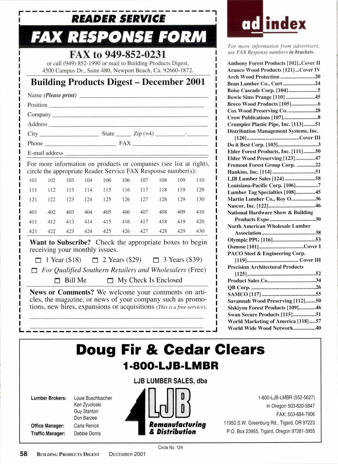 2002 Business lorecosft E-conmelce in the lunber indufi Experh foresee continued shokeout in the short{erm, but high upside in the long{erm. llow to develop on e-business slrdegy Fint $eps in identifying ond pursuing opportunities in the electronic oreno. 15 Sell ponelized builders with tine-soving engineercd prodwls Stresing cost reductions, such os with ewp, is key to morketing to ponelized construction. .': I 1 J . ;...- :- ::-:. 1$;8910 12 B ll "-,.- rt l0 17 t$:0:rPll:l * 'i._... u rN rl 48 ilew Produds 5l Obitories 56 Clossllied torketplcce 57 Buyers'0uide 58 ldYertisers lndex 58 IAX Response;olm