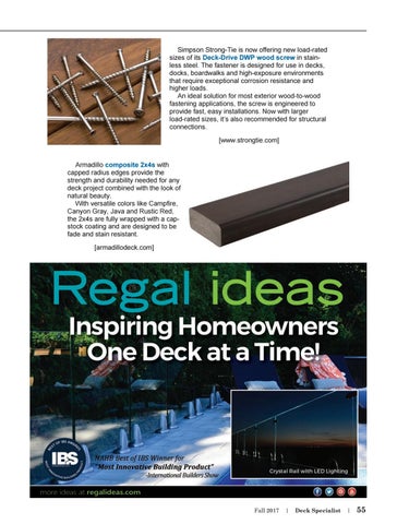 Simpson Strong-Tie is now offering new load-rated sizes of its Deck-Drive DWP wood screw in stainless steel. The fastener is designed for use in decks, docks, boardwalks and high-exposure environments that require exceptional corrosion resistance and higher loads. An ideal solution for most exterior wood-to-wood fastening applications, the screw is engineered to provide fast, easy installations. Now with larger load-rated sizes, it’s also recommended for structural connections. [www.strongtie.com]