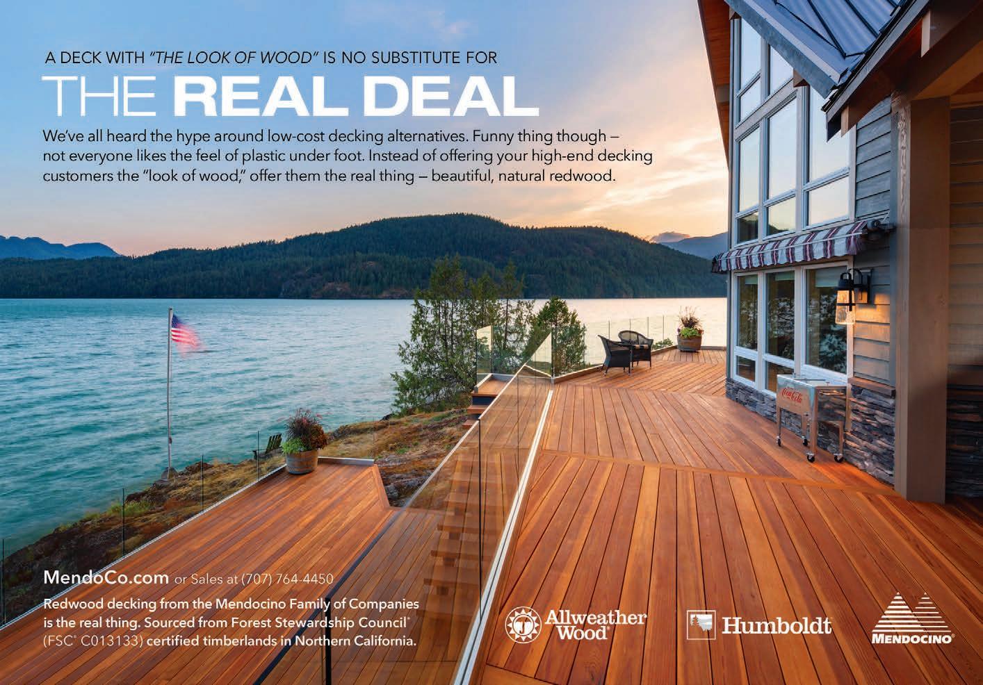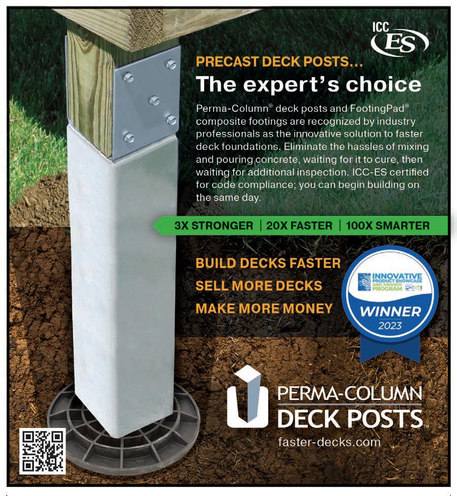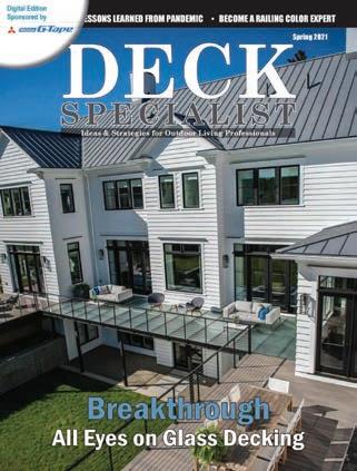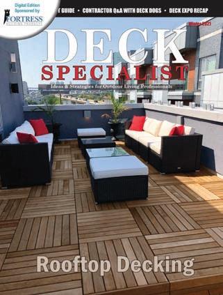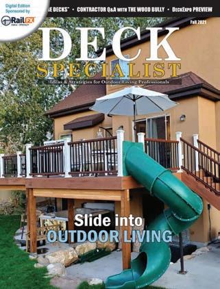 POSTMASTER Send address changes to Deck Specialist, 151 Kalmus Dr., Ste. J3, Costa Mesa, CA 92626. Deck Specialist (USPS 224) is published six times a year at 151 Kalmus Dr., Ste. J3, Costa Mesa, CA 92626 by 526 Media Group, Inc. Periodicals Postage paid at Santa Ana, CA, and additional post offices. It is an independently-owned publication for U.S.-based builders and contractors that specialize in decking and other outdoor living projects. Copyright®2025 by 526 Media Group, Inc. Cover and entire contents are fully protected and must not be reproduced in any manner without written permission. All Rights Reserved. We reserve the right to accept or reject any editorial or advertising matter, and assumes no liability for materials furnished to it. Opinions expressed are those of the authors or persons quoted and not necessarily those of 526 Media Group, Inc. Articles are intended for informational purposes only and should not be construed as legal, financial or business management advice.