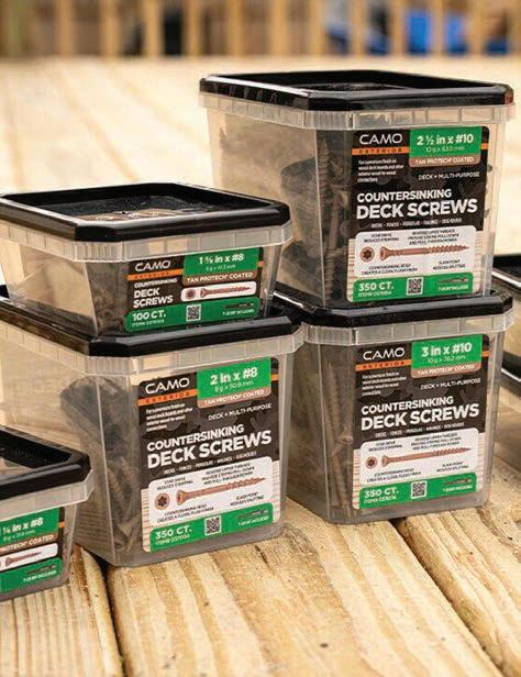CAMO Fasteners has expanded its line of premium exterior screws with its new Countersinking Deck Screw. Engineered with a nibbed countersinking head for a flush, professional look and reverse upper threads for serious pull-down power, CAMO Countersinking Deck Screws drive fast and hold strong. Finished with CAMO’s proprietary PROTECH coating, they’re built to resist corrosion from the elements and the chemicals in treated lumber.