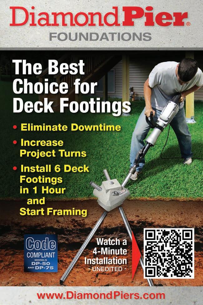 Speed and accuracy of framing are also important to Clint Webb of Webb Decks, Godfrey, IL. He uses what he calls “ghost framing” to temporarily assemble the entire deck frame before pouring the concrete piers. “With ghost framing, the inspector can check the entire frame, including hangers, fasteners, and connections, at the same time they inspect pier depth,” Webb says. The result is fewer delays and faster project turnaround.