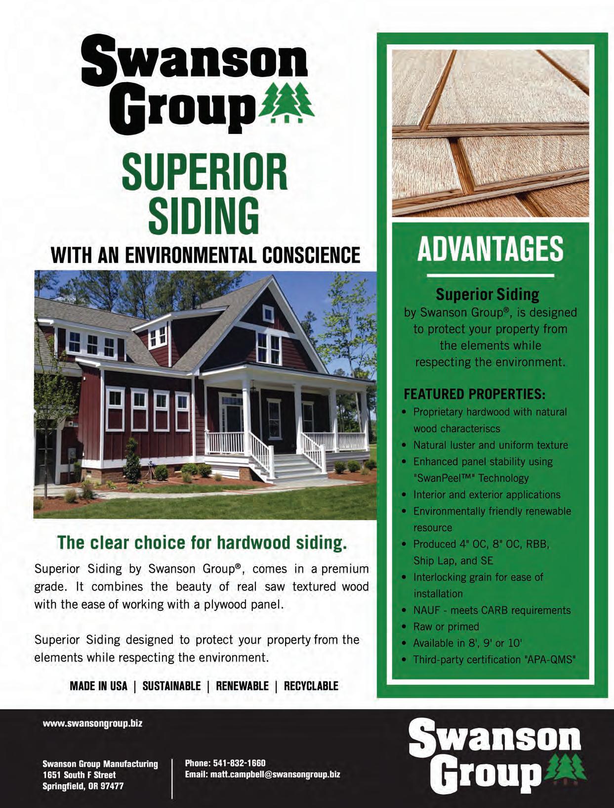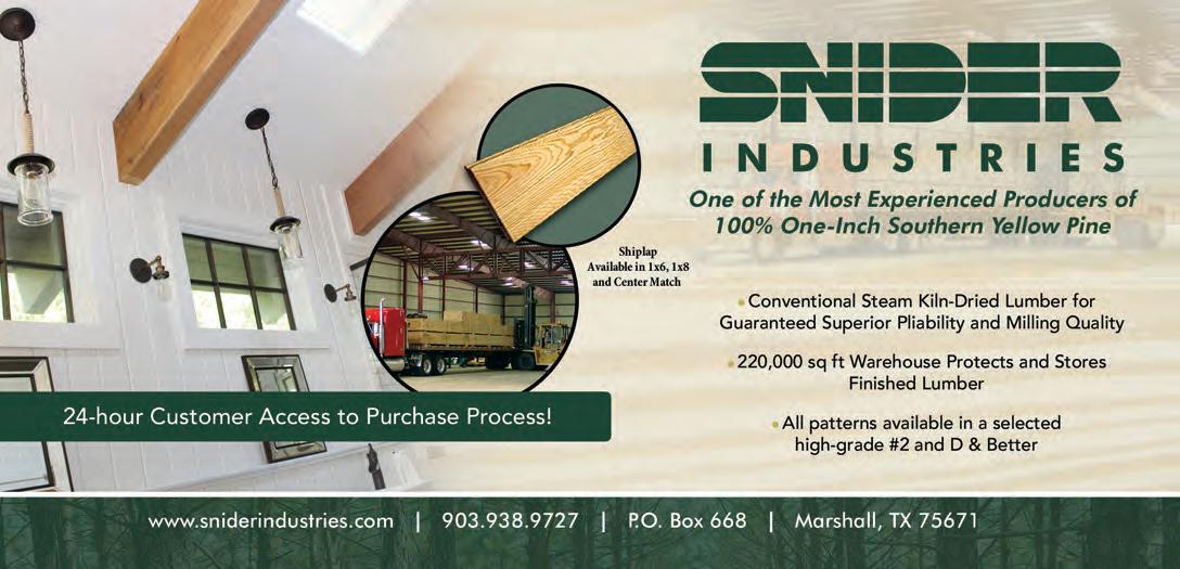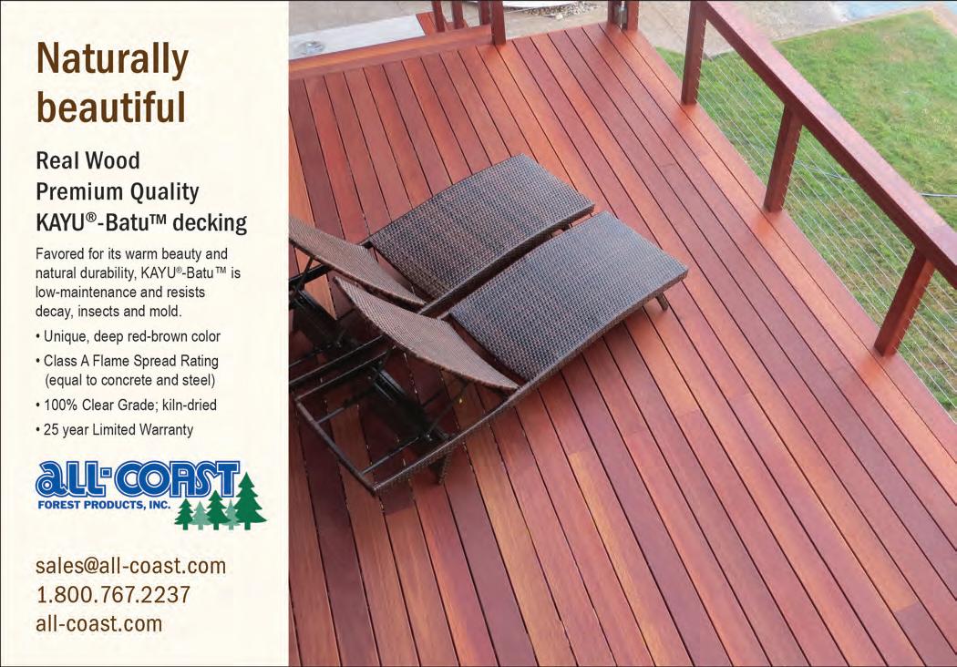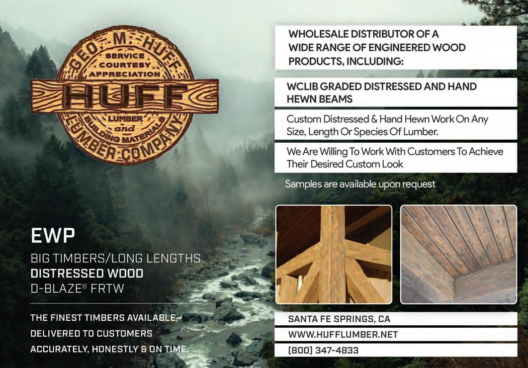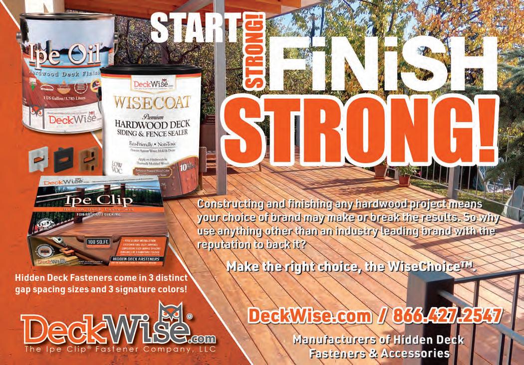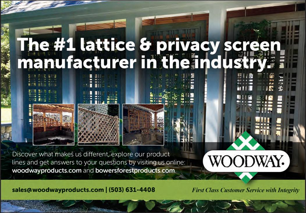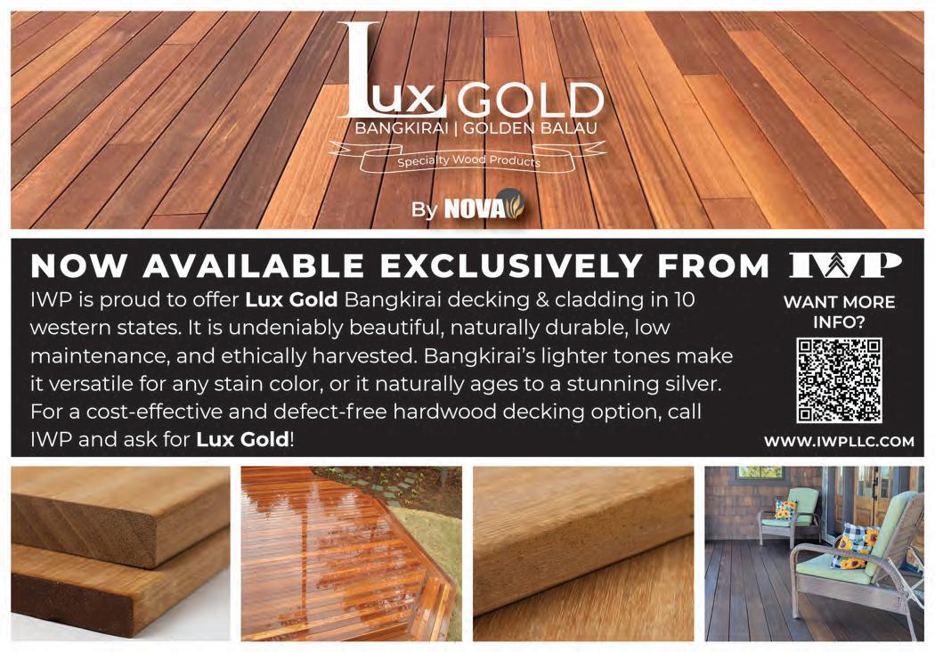 building-products.com may 2023 • the merchant magazine • 65 58 Pelican Bay Forest Products www.pelicanbayfp.com 19, Cov. III Redwood Empire www.buyredwood.com 13 Simpson Strong-Tie www.strongtie.com 55 Siskiyou Forest Products www.siskiyouforestproducts.com 34 Snider Industries www.sniderindustries.com 46 Straight Line Transport www.straight-line-transport.com 51 Sure Drive USA www.suredrive.com 45 Swanson Group Sales Co. www.swansongroup.biz 52 Thunderbolt Wood Treating www.thunderboltwoodtreating.com 30, 41 Timber Products www.timberproducts.com 57 Utah Lumber www.utahlumber.com 27 Vista Railings www.vistarailings.com 39 Watkins Sawmills www.watkinsawmills.com Cover II West Fraser www.westfraser.com/osb Cover I Western Forest Products www.westernforest.com 29 Western Wood Preserving Co. www.westernwoodpreserving.com 35 Western Woods, Inc. www.westernwoods.com 7 Weyerhaeuser www.weyerhaeuser.com/distribution 48 Woodway Products www.woodwayproducts.com ------------| ADVERTISERS INDEX PAGE 5 Accoya www.accoya.com 56 All-Coast Forest Products www.all-coast.com 23 Allweather Wood Treaters www.allweatherwood.com 33 Arxada www.wolmanizedwood.com 25 Barrette Outdoor Living www.rdielevationrail.com 50 Big Creek Lumber www.bigcreeklumber.com 47 California Cascade Industries www.californiacascade.com 32 Capital www.capital-lumber.com 59 DeckWise www.deckwise.com Cover IV Digger Specialties www.diggerspecialties.com 21 Do it Best www.doitbestonline.com 3 FastenMaster www.fastenmaster.com 54 Huff Lumber Co. www.hufflumber.com 23 Humboldt Sawmill www.mendoco.com 36-37 International Wood Products www.iwpllc.com 31 Jones Wholesale Lumber Co. www.joneswholesale.com 9 MoistureShield www.moistureshield.com 49 MOSO Bamboo X-treme www.moso-bamboo.com 43 NAWLA www.nawla.org Deck Building Solutions 866-767-1850 www.suredrive.com • sales@suredrive.com 253-863-8191 • 800-472-7714 westernwoodpreserving.com Our facility includes 12 acres of treatment, drying and storage areas, and produces top quality treated wood products for residential and commercial consumers in the wholesale market. Best Value. Superior Quality. Environmentally Responsible.