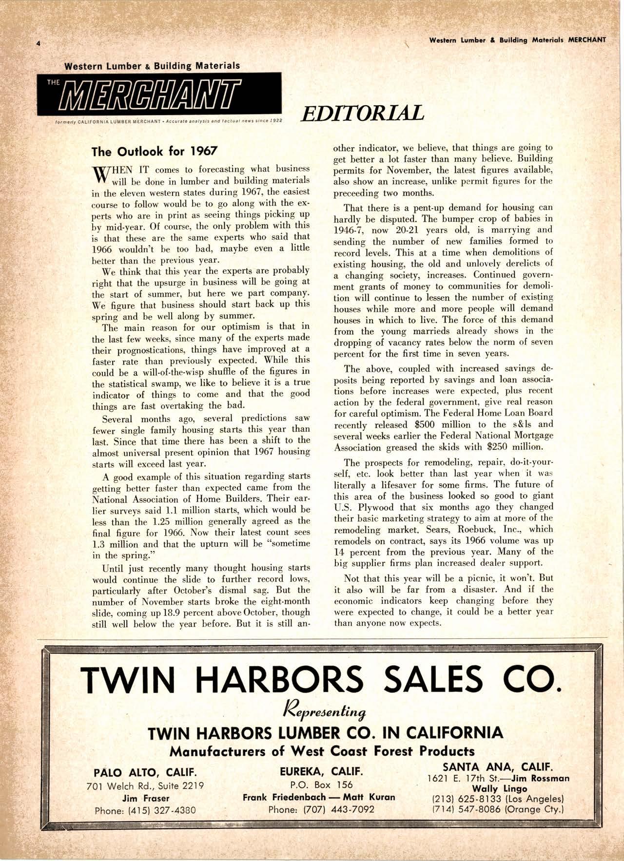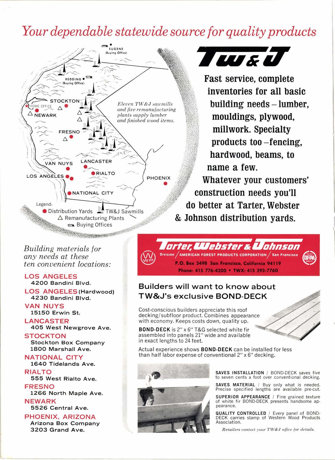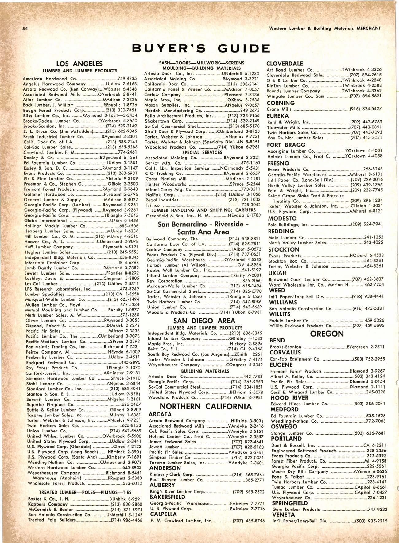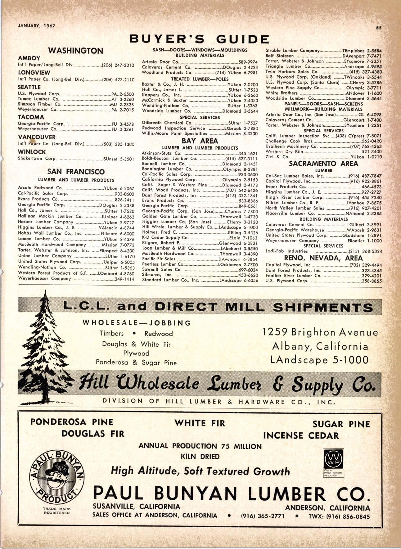 ...----.---.--...--.-.------SUttcr l-7520 Kopporr Co,, Inc. --..---Yukon 6-266O McCormick & Baxter .-.YUkon 2-4033 Wcndling.Nothqn Co. ..--...------.----.-.....SUtter l-5363 Woodsidc tumber Co. .-.----------.--.Dlomond 3-5644 SPECIAI SERVICES Gilbreoth Chcmicol Co. .-.------.-.--.--..-SUtter t-7537 Rcdwood Inspectioh Servicc -..--..--EXbrook 2-7880 Willis-Moore Poinf Speciollies -------ltlssion 8-3200 BAY AREA IU,IABER AND IU'YIBER PRODUCTS Alkinson-Stutz Co. -----.------------------------.-.-345-l 621 Boldt-Beocom Lumber Co. .--.------.--------(41 51 527-31 1 | Bonnell Iumber Co. ---.---------.------.-Dlonond 2-l 451 Bonnington Lurnber Co. ------..-------..OLympic 8.288 I Col-Pocific Soles Corp. --------933-0600 Colifornio Plywood Corp. .-------------..--Otympio 2-5153 Cofif. Sugor & Weslern Pine .--------Dlomond 2-4178 Cofif. Wood Products, Inc. .---------{7071 512-d/.26 Donl Foresl Producfs, Inc. ----------.(4151 322-1841 Evqns Products. Co. --.-..-.---.--.---.-.-...--.--.---533-8866 Gcorgio-Pocifl c Corp. ...---.-...-...--.-.--..---..--8219-0561 Gcorgio-Pocific Corp. (Son Joset.-.-.---CYpress 7-7OOO Goldcn Gole Lumber Co. -.---.-.---.-THornwotl l-4730 Higgins [umber Co. (Son Josel ...--.-.CHerry 3-3120 Hill Whsle. lumber & Supply Co.....LAndscope 5-1000 Holmcs, Fred C. .......-.-.....-..-.----.-..--.--.KEtlo9 3-5326 K-D Cedcr Supply Co. .-.Etgin 7-1063 Kilgorc, Roberl P.-.---.-.-...-----..-----G[cnwood 6-083 I loop lumber & Mill Co..-------..--.-.lAkchursr 3.5550 MocBcolh Hordwood Co.-.-......-..---..-..THornwoll 3-4390 Pociflc Fir Soles .-----------....-...--.---.-...DAvenDort 6-8854 Peerlers Lunbcr Co..-.......-.--...-.--...IOckhoven 2-77O0 Sowmill Sof cr Co. --...-.-.- -.-.----697 -6031 Sif norco, nc. .---.-.....--.---.--l--.---.--- ----153-6620 Slondord tumber Co., lnc. ------..-.---l.Andscope 6-6356 Slroblc tunbcr Compony.-..---.-..-..-TEnplcbor lolf Stolocn .---...DAvonport 7 .--...--.589-9971 r.{-,...'^v3r.rvr. Torler, Webrler & Johnton .-.....---.--.SYcqmorc 7 Trionglc Iumbcr Co...-.-....-.....-....-.-[Andrcop. +959ti Twin Horborr Solcr Co. .--.*.-.-.-(4151 327-f3t0..1 U.S. Plywood Corp. (Ooklondf .--.-.TWinoob 3.55,41. U.S. Plywood Corp. lSonto Cloro) ...-.CHcrry 3-52!6:; Western Pinc Supply Co....-......-..-...Otympic 3J7ll While Brothers .-......-ANdovcr l.l6(tr.r Woodside [unber Co,.-.--.-..-.-.-.---..Dlomond 3-5lll4r r PANETS-DOON,S-SASH_SCREENS r IIWOnK-BUILDING MATERIAIS '.n Artcsio Door Co., lnc. (Son Josc)..---.---.....Gt 6-{018. .l;i Colovcros Cemcnl Co....--......---------.-Glcncourt l-ZdOO-" Torler, Wcbster & Johnson--.-.-..-.--.SYconorc l-2351 SPECIAT SERVICES Colif. lumber Inspection Svc.----(4081 CYpresr 7-8071 Choflenge Cook Bros.--.....- --.562-U2C Kvolheim Mochinery Co. ...-.-..----...-..- -----(7071 7 521363 .: Weilern Dry Kiln-----.------ --.----521-3/tO0 Ziel & Co. -.--------------..--Yukon l-O2lO SACRAMENTO AREA TUMBER Cql-Soc lumber Soler, Inc. .--.----------..(916) 187-7817 .i Copitol Pfywood, lnc..-...--.-----.-.-..-..-"------(916) 922-8861'".', Evons Producls Co. ..16&1523 Higgins lumber Co.. J, E. ---927-27A King's Rivirr Lumber Corp. .---.-.-....-....(916) 155-721O i. :l:, Nikkel lumber Co.. R. F. ------.-.---.-------lVonhcr 7-8575 -'' Norlh Vofley lumbcr Soles ....---.--.-.-.(9161 927-1207. :" Plocervillc tunber Co. ....--.-.....----.-.NAtionol 2-3385 BUIIDING IAATERIAIS Colqverqs Cemenl Co. Gtlbcrr 2-8991 Georgio-Pocifi c Worehoure .......------..WAbosh 2-9631 Unitcd Stote3 Plywood Corp. .-.-.---GLodstone 1.2891 Weyerhoeuscr Compony ---.------.-.--.....FRonfier l-10(X), SPECIAT SERVICES : !odi-Fob lnduslries ..:.....-.--..--.-........(2131 368-532,1,,l RENO, NEVADA, AREA Copif ol Plywood, nc,.....-..----- -.17021 329 1491 Donl Forest Producfsr Inc. ..........-..--.--..-.---..323-1345 Feothar River Lumber Co. ----329-1201 U.S. Plywood Corp. PONDEROSA PINE WHITE FIR INCENSE ANNUAT PRODUCTION 75 MITLION SUGAR PINE CEDAR High Altitude, Soff fexfure d Growlh L BUNYAN LUMBER CALIFORNIA AT ANDERSON, CAIIFORNIA i\ WHOLESAIE_JOBBING Timbers o Redwood Douglos & White Fir Plywood Ponderoso & Sugor Pine 1259 Aven u€' ::i Albohy, California LAndscape 5-1000 Brighton IA rl DIVI.SION OF HI.tt TUMBER & HARDWARE CO., INC.. i; fr i: l1rl.I,,'t,+,ti