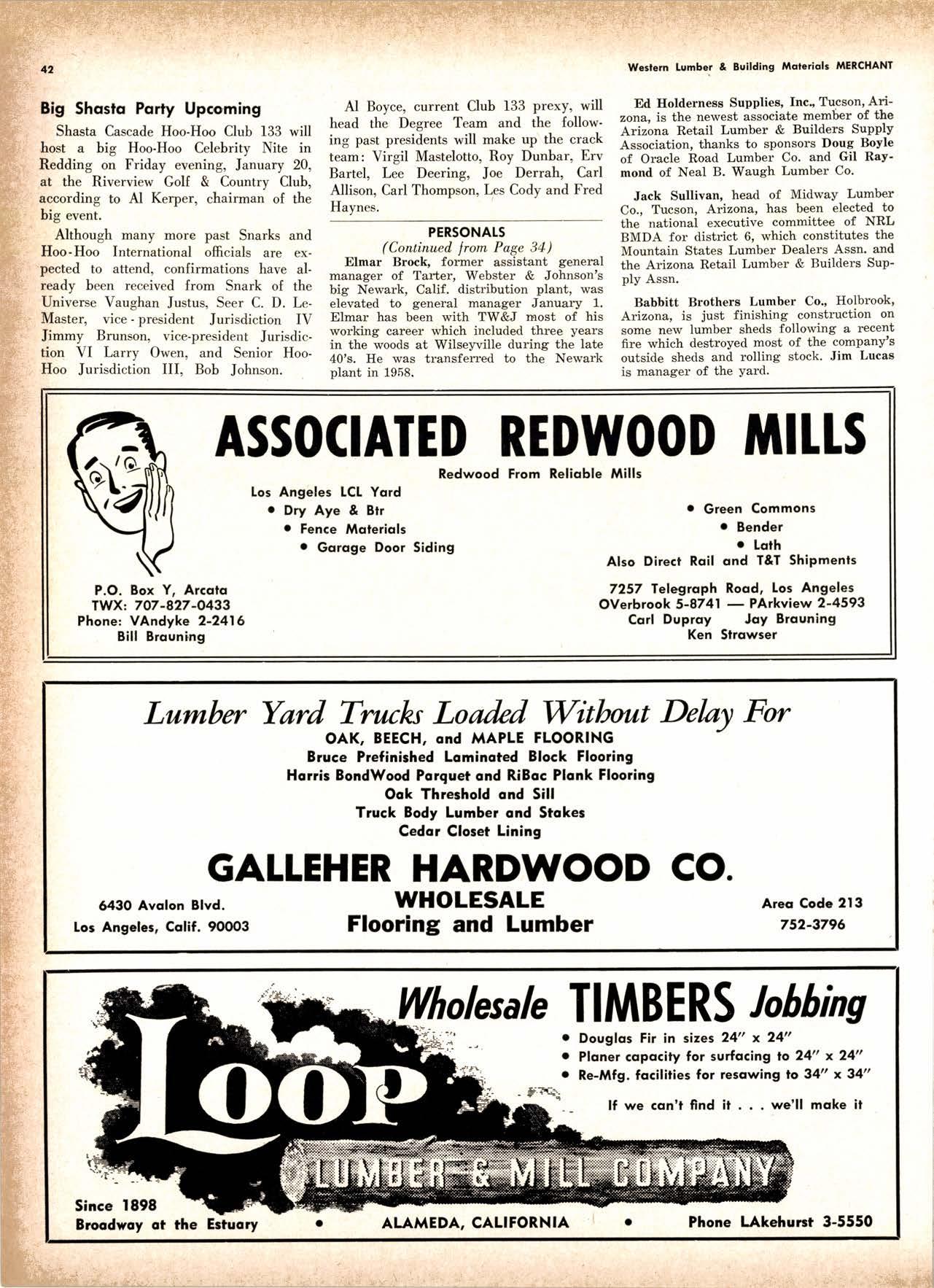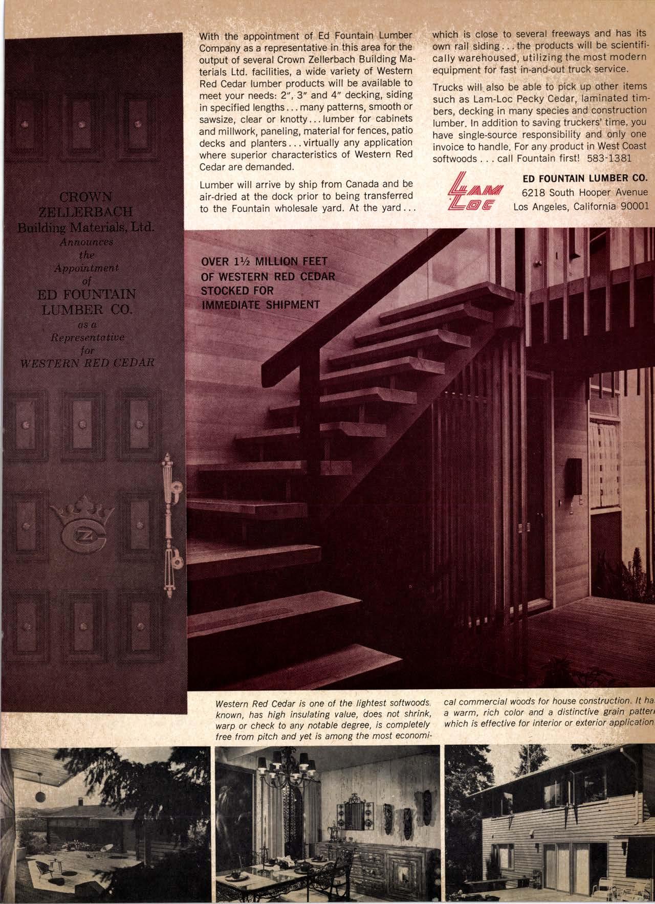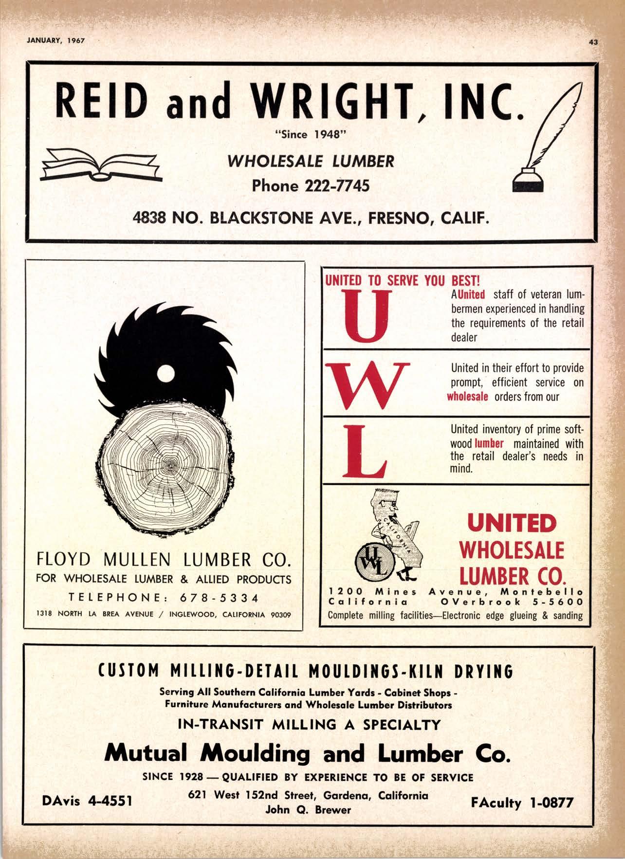 Old Growlh Redwood, Shorts P. E. T. Green Commons, Dry Uppers cotulPtETE cusTorri rt^lttlNc lorge Timberc qnd Wide Sizes Our Speciolty G ac R Lumber Co. .?n,:11" ,',f,:,:.TT',?; |.UMBER ilRRIERT from Be*ol y' ESPECIALTY ADAPTAEIE TO CUSTOMER NEEDS y' scrENTrFrcAttY DESIGNED FOR ALL TYPES OF WOIK y' lauxcto Fot EAsE OF HANDTING LetUs Prove This ls the Cqrt for You! Coll or write for free brochure BTRI(()I MAilUTAfiUNIilO (OMPAIIY | | 285 Goss Slreel, Sun Volley, Colif. Phone: 875-l 163 THE KEY CORPORATION 19 1 No. Lilac. Box 189. Ri'aln, Calil. Telephone Area Code 714 ' 875-2060 THE "KEY'' TO WHOLESALE LUMBER Cqll US FOf sierro siding-boord & botfs-thick buft siding-ponelins STERN RED CEDAR SUTTLE KELLER LUTTBER CO., INC. WE &. Avenue 2757 North Duilee Gllbert 3-8909 El Monte, Golifornio