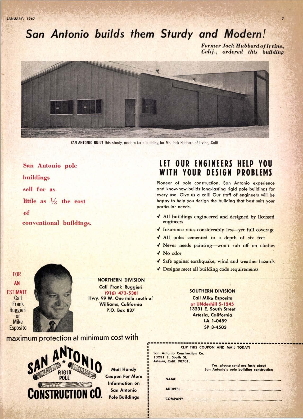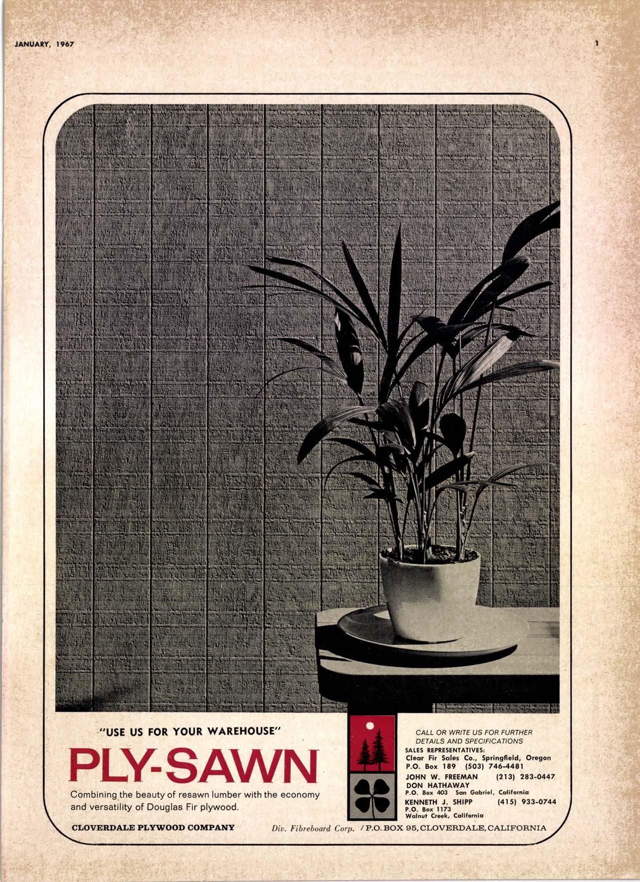 JANUARY, I967 ,,USE US FOR YOUR WAREHOUSE" CALL OR WR/TE US FOR FURTHER DETAILS AND SPFC/F/CATIONS 5AtES R,EPRESENIATIVCS: Clecr Fir Soles Co,, Springfield, Oregon P.O. Box I 89 l503l 746-4481 JOHN W. FREETI^AN 1213t. 283-0447 DON HATHAWAY P.O. Box rt03 50 Gobriel, Colifornio KENNETH J. SHIPP 14151 933-0744 P.O. Box Il73 Wolnuf Creek, Colifornio PLYSAA/N CLOVISDAI,E PLYWOOD COMPANY Dit. Fibreboard Corp. /P.O.BOx 95,CLOVER'DALE,CALIFORNIA