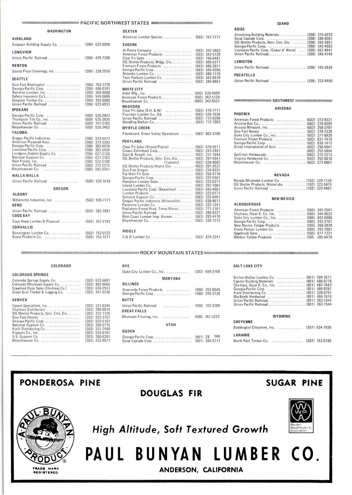 Lumber& Plywood CO RVALLIS Eonnington Lumber Co. Evans Products Co. DEXTER Ame,ican Lumber Species EUG CiIE Al Peirce Company American Forest Products Clear Fir Sales 0G Shelter Products, Mldgs. Div.. Fremont ForestProducts Georgia-Pacilic Corp. Rolando Lunber Co. Twin Harbors Lumber Co. l.rnion Pacitic Railroad 1503) 147-7777 (s03) 342-3663 {503) 342-5t28 (503)i464481 (503) 995-6371 (503) 686-29r 1 (503) 345-4356 {503)686-il78 {503) 342-6579 (503t 345-846r WHITE CITY Alder lvlfg.. Inc. (503) 8264088 American Forest Products . (503) 342.5128 Weyerhaeuser Co. (503) 342-5531 MCO FO RD ClearFirSales(S.H.&W) Fountain Lumber Co., E;. ...:.. Union Pacitic Bailroad Wendling Nathan C0........ MYRTLE CREEK Fibreboard, Green Valley 0perations PORTI.AiIO ClearFirSales(BoundPrairie)... (503)6i9-5511 Crown Zellerbach Corp... ... (503) 243-2401 Dant&Russell,lnc. (503) 221-1644 DG Shelter Products, Sery. Ctrs. Div.. {503) 297-4841 (Tualatin) (503) 638-8663 DG Shelter Products Hearin Div. {503) 297-2531 Duo'Fast0regon (503) 234-9321 Farwest Fir Sales - (503) 256-4710 Georgia-PacificCorp...... ... (503) 2?2-556,| Hampton Lumber Sales (503) 223-6271 Inland LumberCo. (503) 297-1001 Louisiana Pacific Corp. (Beaverton) . {503) 643-4861 Lumber Products (503) 223-8171 National Gypsum Co. (503) 222-4001 0regon Pacific Industries(Wilsonville)...... (503) 638.9511 Paramino Lumber Co. {503} 223-1341 Publishers Forest Prod.-Times Mirror..... {503) 771-ll6l Union Pacific Failroad . (503) 288-8221 West Coast Lumber Insp. Bureau (503)29244i8 Weyerhaeuser Co. (503) 226-1213 RIDOIE C & D Lumber Co. -. -... 15031 814-2241 IOAHO BOISE Armstrong Euilding Materials. '2081 315.6222 Boi$ Casade CorD. (208) 385-9361 0G Shelter Products, Sery. Ctrs.oiv. (208) 343-3651 Georgia-Pacific Corp. (208) 343.4963 Louisiana Pacitic Corp. {Co€ur d'Alene} (208) 667-8441 UnionPacificRailroad... ..... (208) 345-4140 ACI FIC NORTHWEST STATES (206) 622-5098 (206) 425-7300 {206) 228-2550 {206) 763-r776 (206) 486.0i41 {206) 3644000 (206) 545,5698 (206) 292-5000 (206) 623-6933 (509) 535-294i {509) 535.2925 (509) i47-3165 (509) 535-2462 '2061 5724471 I2D6t 212-2283 (206) 3834578 (206) 383.2424 t206t 627-2126 (206) 627-3 t63 (206) 532-5r00 1206t 272-2275 (206) 383.3361 (509) 529-r610 (503) 926-7771 (503) 383.'r90r (503) 267-2r93 (503) 752-0123 (503) 753-r2',r 1 r.ErulsT0fl Union Pacilic 8ailroad........... POCATEITO Union Pacific Failroad 12081 743-2524 (208t 2324450 {503) 4i6-7711 (503) 53s-rs26 (503) 773-5388 (503) 772-7063 (503) 863-3796 |||||||l|||l|l||||||||||||ll||||l||l|||l|||||||||I||||n||s0uTHwEsTl|ll ARtZ0ilA PHOENIX American Forest Products .6021 272-9321 Arizona Box C0.... {602) 278-8295 ArizonaMillwork,lnc....... {602) 258-3797 Duo-Fast Navaio (602) 278-i329 Duke City Lumber Co.. Inc.. (602) 277-8929 Frsmont Forest Products (602) 931-i479 Georgia'Pacific Corp. (602) 339-.|413 Globe International of Ariz. (602) 258-4941 {602) 252-5854 Spellman Hardwoods. 1602l. 272-2313 Virginia Hardwood Co. (602) 252-6818 Weyerhaeuser Co. (602) 272-6861 iIEVAOA Nevada Wholesale Lumber Co. {702) 329-1 126 0G Shelter Produns, Nikkel div. (702) 323-5815 Union Pacific Railroad {702} 323-4881 itEwMExtc0 At BUOU E ROU E American Forest Products (505) 345-2541 Chytraus,0car E. Co. Inc. (505) 344-8623 Duke City Lumber Co., Inc. (505) 842-6000 Georgia-PacificC0rp....... 1505l, 242-2791 New lrexico Timber Products ......... (505) 268.3928 Frank Paxton Lunber Co. (505) 243-7891 Sagebrush Sales (505) 877-7331 Weldon Timber Products (505 265-6479