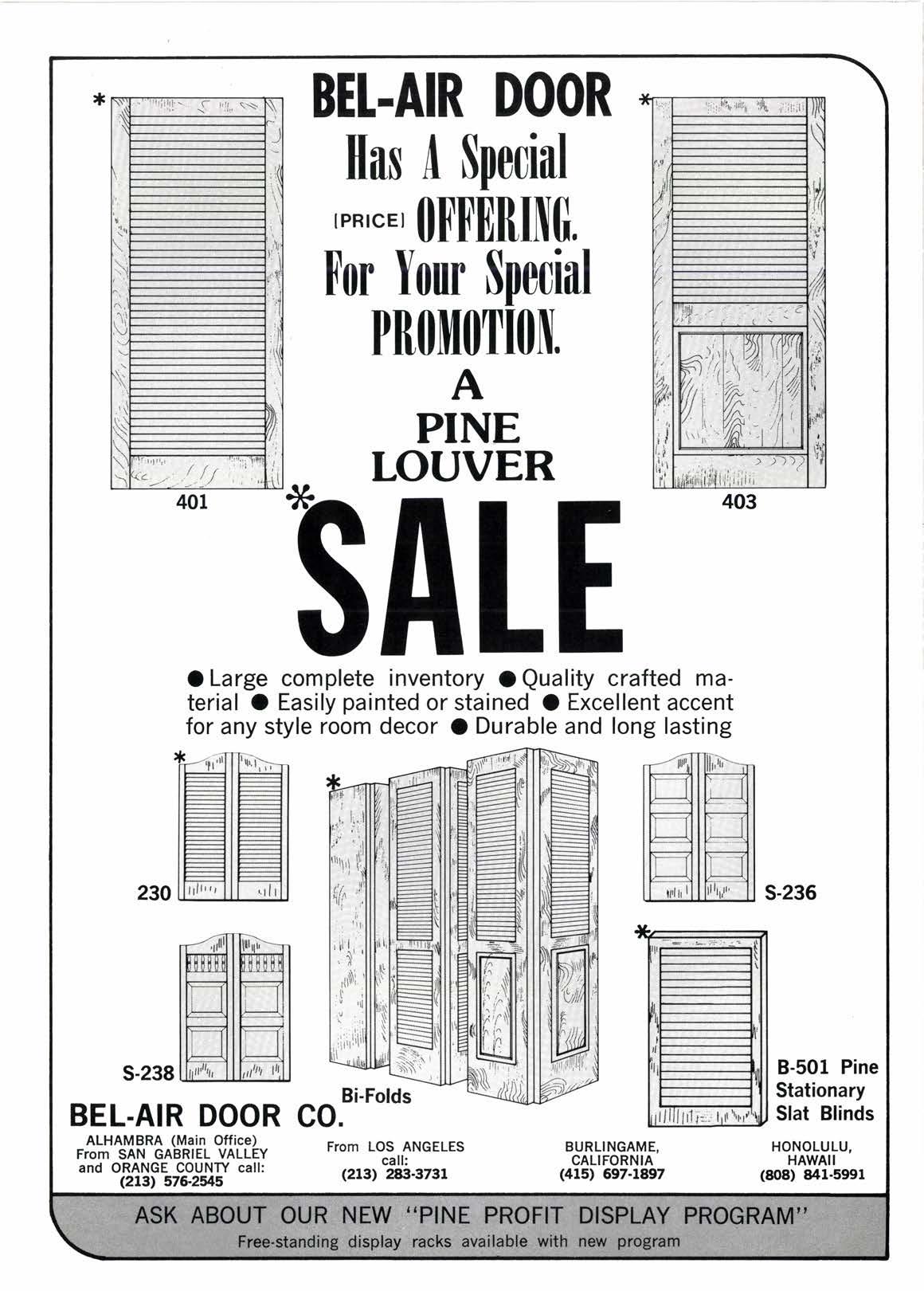 BEI.AIR DOOR Has A Special ,PR,.E, [|l'l'DBINff. tor Your Special PRO[[OTION. A PINE LOUVER ia_SALE O Large complete inventory O Quality crafted material O Easily painted or stained O Excellent accent for any style room decor O Durable and long lasting s-238 8-501 Pine Stationary Slat Blinds BEL.AIR DOOR ALHAMBRA (Main Office) From SAN GABRIEL VALLEY and ORANGE COUNTY call: (2r3r 576.2il5 Bi-Folds co. From LOS ANGELES call:(2r3) 28:r-3731 BURLINGAME, CALIFORNIA (415) 697.1897 HONOLULU, HAWAII (808) 84r-5991