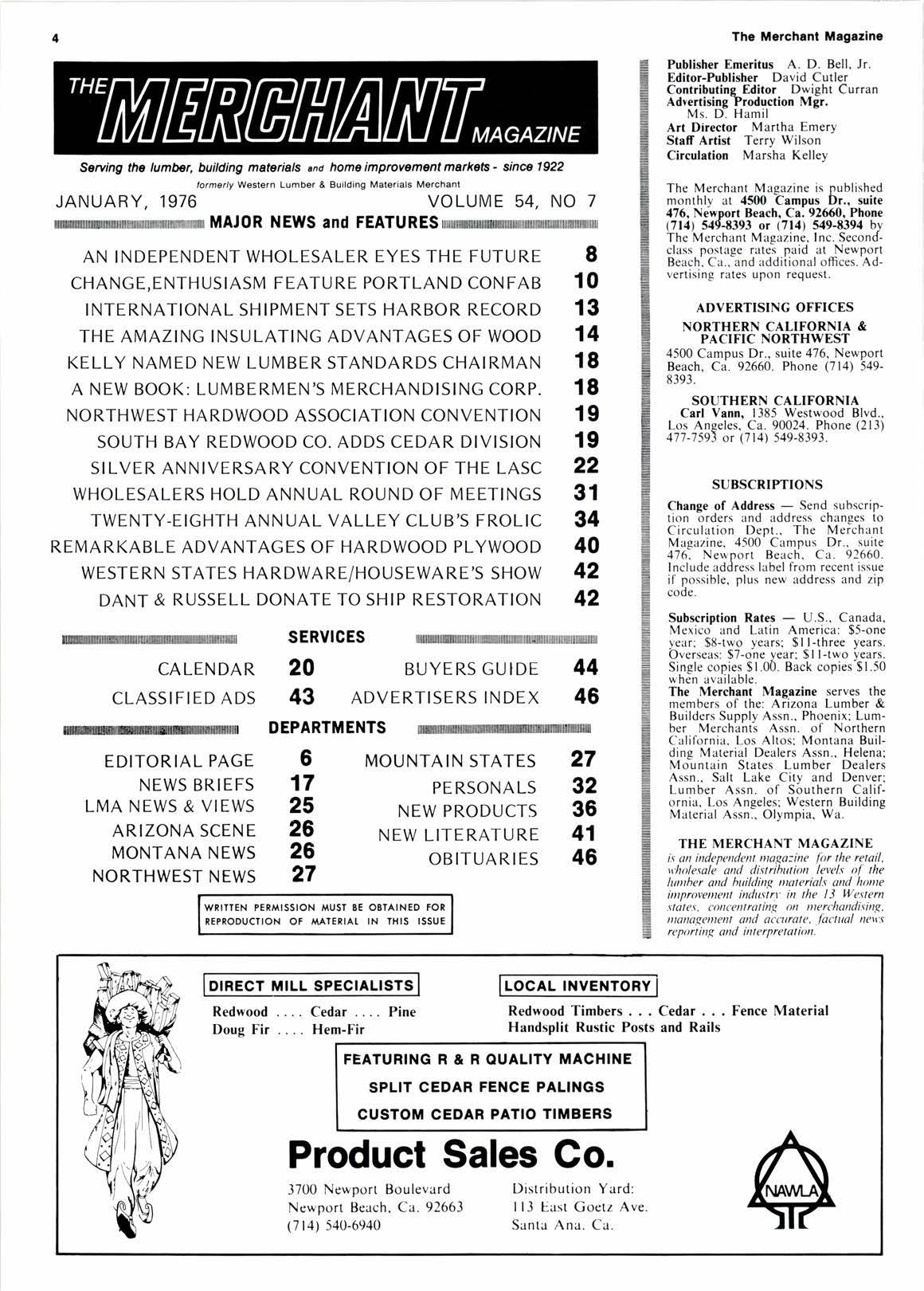 Serulng the lumbcr, building materials tnd homo improvement ma*oE - sinc€. 1922 lormetly Weslen Lumber & Building Materials Merchanl JANUARY, 1976 VOLUME 54, NO 7 MAJ0R NEWS and FEATURES AN INDEPENDENT WHOLESALER EYES THE FUTURE CHANGE,ENTHUSIASM FEATURE PORTLAND CONFAB INTERNATIONAL SHIPMENT SETS HARBOR RECORD THE AMAZING INSULATING ADVANTAGES OF WOOD KELLY NAMED NEW LUMBER STANDARDS CHAIRMAN A NEW BOOK: LUMBERMEN'S MERCHANDISING CORP. NORTHWEST HARDWOOD ASSOCIATION CONVENTION SOUTH BAY REDWOOD CO. ADDS CEDAR DIVISION SILVER ANNIVERSARY CONVENTION OF THE LASC WHOLESALERS HOLD ANNUAL ROUND OF MEETINGS TWENTY-EIGHTH ANNUAL VALLEY CLUB'S FROLIC REMARKABLE ADVANTAGES OF HARDWOOD PLYWOOD WESTERN STATES HARDWARE/HOUSEWARE'S SHOW DANT & RUSSELL DONATE TO SHIP RESTORATION SERVTCES 8 10 13 14 18 18 19 19 22 31 34 40 42 42 CALENDAR CLASSIFIED ADS EDITORIAL PAGE NEWS BRIEFS LMA NEWS & VIEWS ARIZONA SCENE MONTANA NEWS NORTHWEST NEWS BUYERS GUIDE ADVERTISERS INDEX 20 43 44 46 DEPARTMENTS 6 17 25 26 26 27 MOUNTAIN STATES PERSONALS NEW PRODUCTS NEW LITERATURE OBITUARIES 27 32 36 41 46 WRITTEN PERA,TISSION AAUST B€ OBIAINED FOR REPRODUCTION OF IAAIERIAI IN THIS ISSUE DIRECT MILL SPECIALISTS LOCAL INVENTORY Redwood Doug Fir Pine Redwood Timbers Cedar Fence Material Handsplit Rustic Posts and Rails FEATURING R & R OUALITY MACHINE SPLIT CEDAR FENCE PALINGS CUSTOM CEDAR PATIO TIMBERS Product Sales Go. 3700 Newport Boulevard Ncwport Beach, Ca. 92661 (714) 540-6940 Distribution Yard: lll East Goetz Ave. Santu Ana. Ca. The Merch.nt Magazine