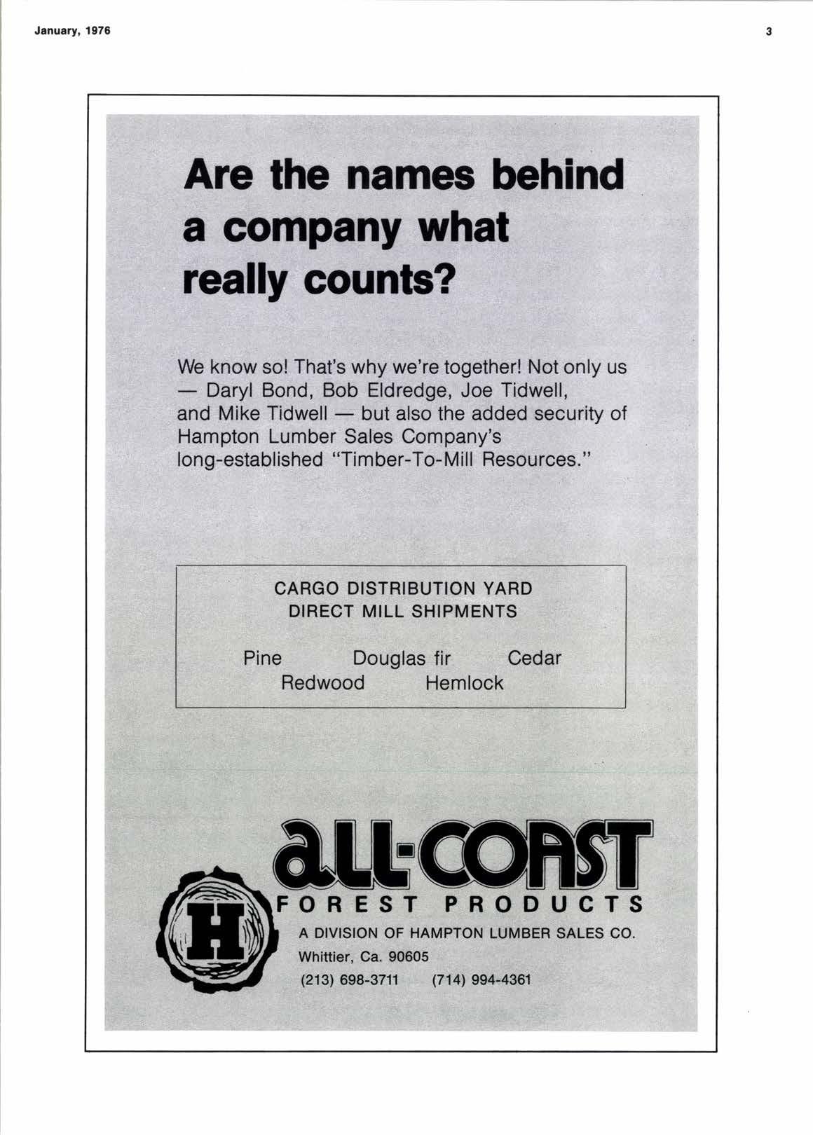 January,'1976 Are the names behind a company what really counts? We know so! That's why we're together! Not only us - Daryl Bond, Bob Eldredge, Joe Tidwell, and Mike Tidwell - but also the added security of Hampton Lumber Sales Company's long-established "Timber-To-Mill Resources." OREST PRODUCTS A DIVISION OF HAMPTON LUMBER SALES CO. Whittier, Ca. 90605 (213) 698-3711 (714) 994-4361 CARGO DISTRIBUTION YARD DIRECT MILL SHIPMENTS Pine Douglas fir Cedar Redwood Hemlock