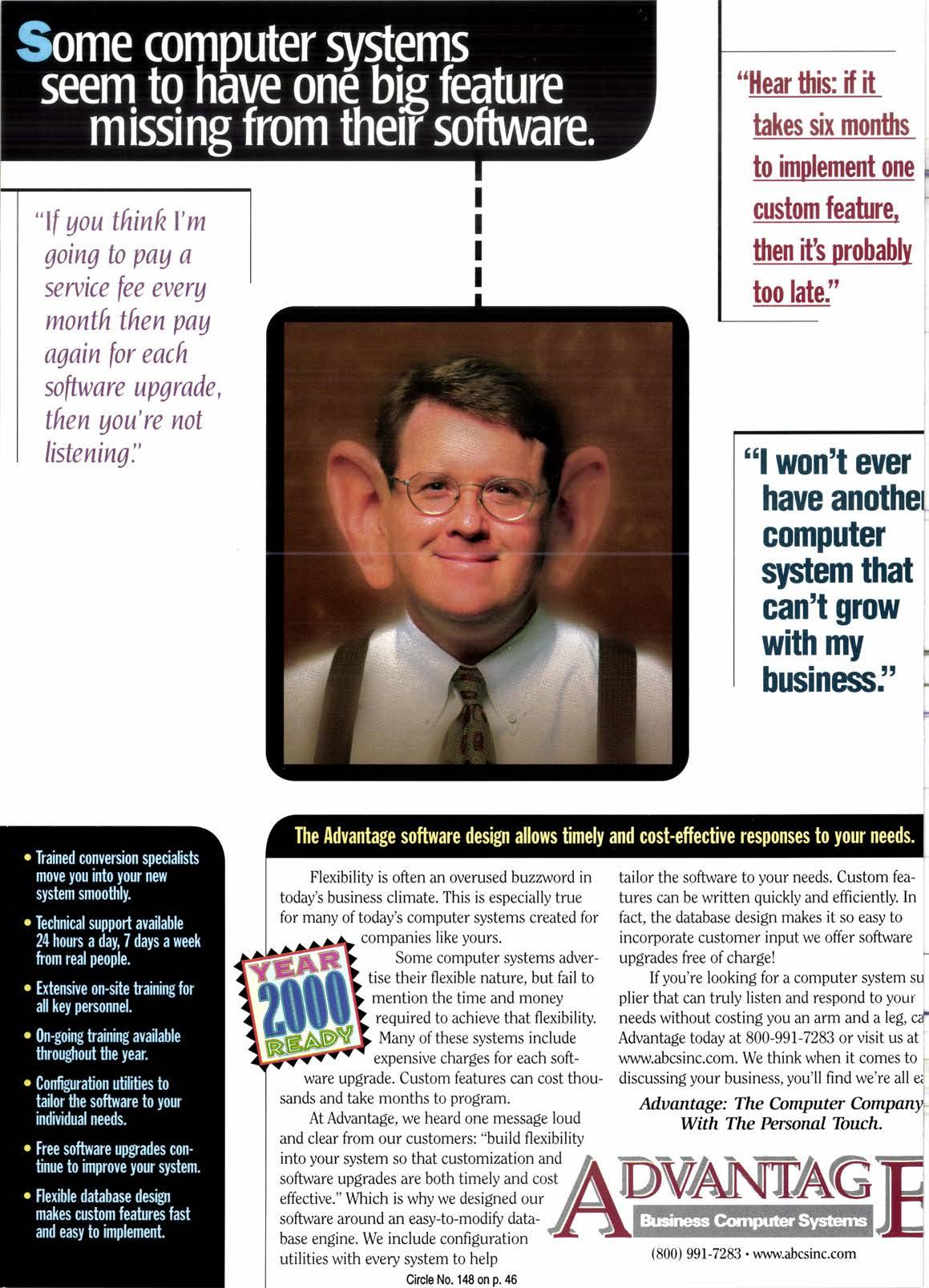 If you're looking for a computer system su plier that can truly listen and respond to yoi-rr needs without costing you an arm and a leg, cf, Advantage today at 800-991-7283 or visit us at' www.abcsinc.com. We think when it comes to ; discussing your business, you'll find we're all ei' Aduantage: The C-amputer C-ampany, With The lbrsonnl Tbuch.