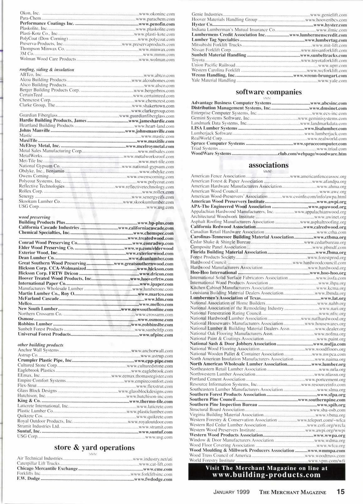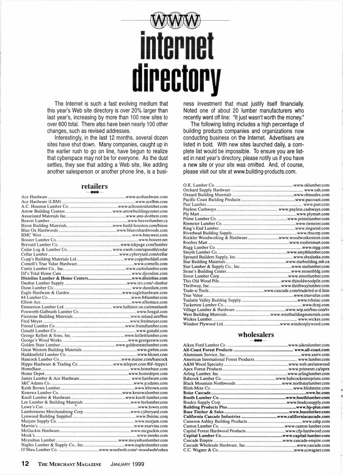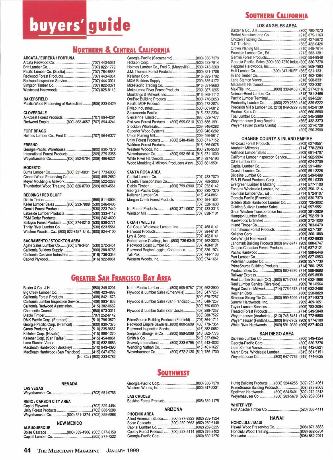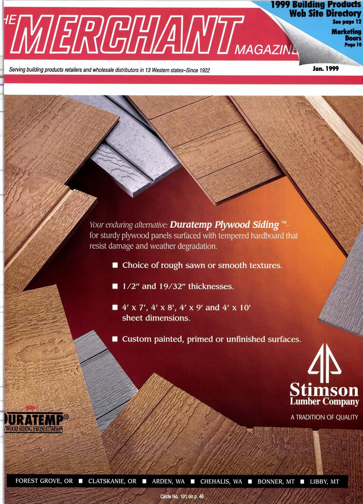 lor th€ retail, wholesale and distdfution levels of he lumber and buildhg prodrcG martoB in 13 westem stal6s. Copydgholggg by Th€ Merchant Magazine, lnc. Co,er and ontirs corF tenb are lully protoctsd and must not bo roproducad in any manner withoul written p€rnission. All Righls Reseiled. lt ros€iles the right to accept or rejec{ any edtorial or advertising matter, and assumes no liaulity for materials lumished to it. 5 ldirodol 18 llcws Bdeft 20 (olendar 2l Quote of the tonlh 22 WeslemA$oeiationllewg 28 Per:onols 34 llewPrcducrl f0 ClosslfiodldYerlisenontt f3 obituorics 44 Buycn'Ouidc 46 Ad tndex 15 JAXRe$onse lorn lte l-ioist Declen Products Web Sile listing of more thon 600 Internet sites for the WORLD CLASS SERVICE FOR OUR CUSTOIIERS! Boug tlr KID 1r2-4x12 & larger Redwood KID S4S & patterns Redwood uppers & commons Cedar KID STK Ro. S{S & patterns eedar KfD C&Btr. Ro. $4$ & patterns PRODUCT SRTCS CO. 2202N. Pacific (P.0. Box 4989), Orange, CA 92863-4989 (714) 998-8680 (800)660-8680 , FAX714-921-8249 Since 1965 Circle No. 104 on p.46 4 TnrMEncHA,rtrMlclzlxB Jmunnv1999