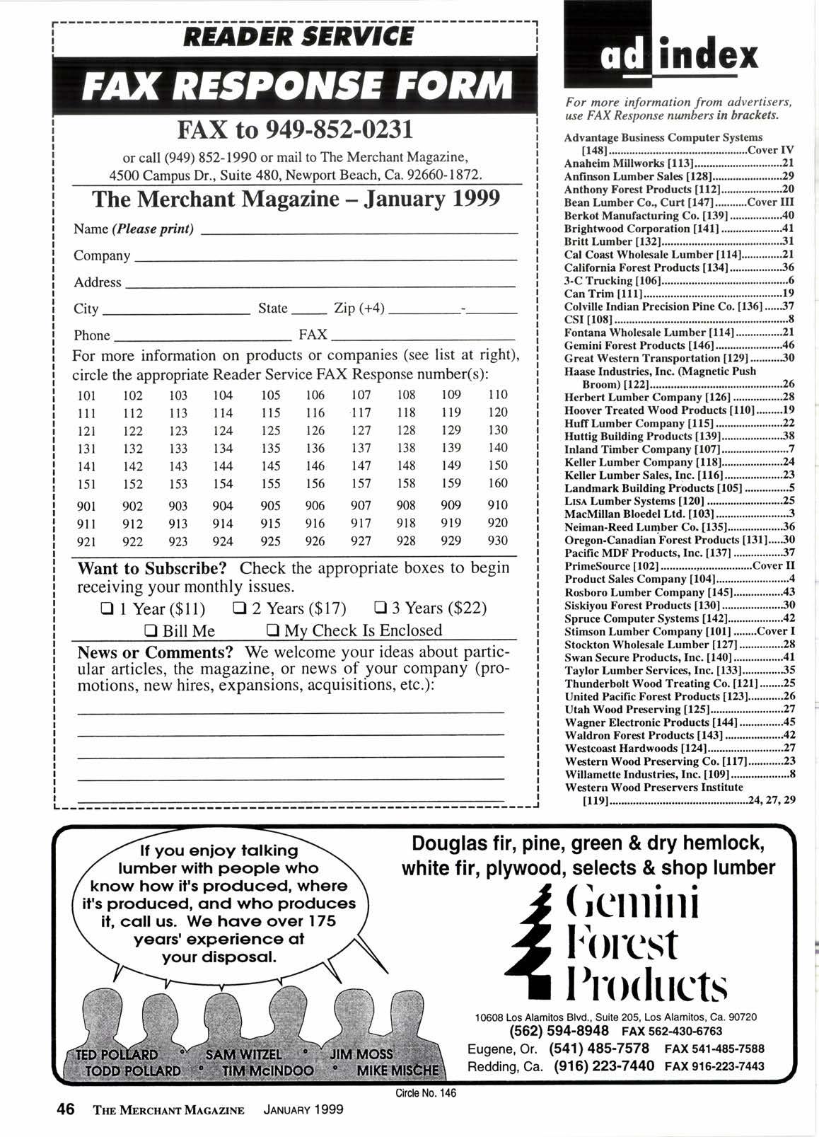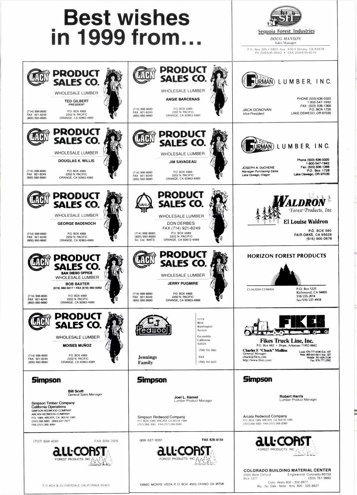 iRUYftKSK F F 3.C TRUCKING First Class Lumber Haulers (soz) 422-0426 FAX 562-423-6283 RAII CAR UNLOADING UNION PACIFIC 2380 E. Curry, Long Beach, Ca. 90805 Circle No. 106 on p. 46 6 Tnn MrncH.lxr M.lclzrxs Jnruumv 1999
