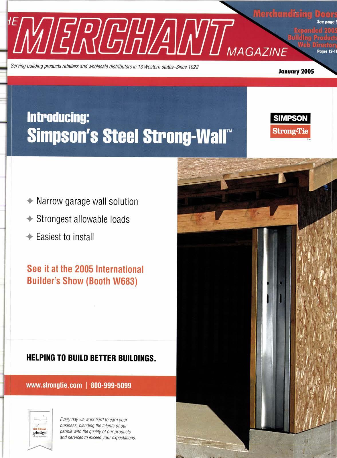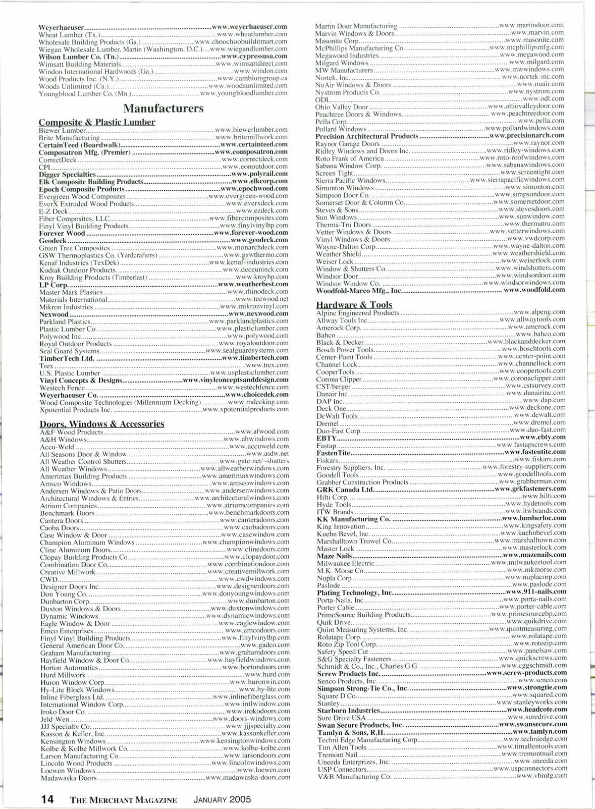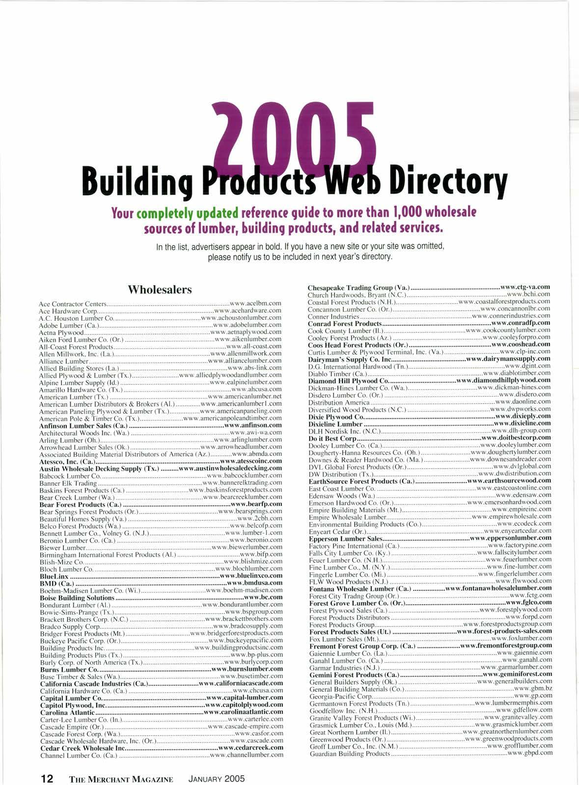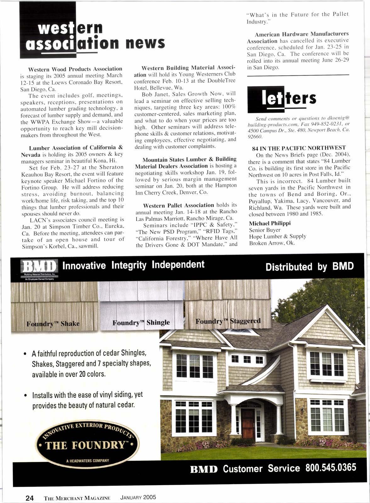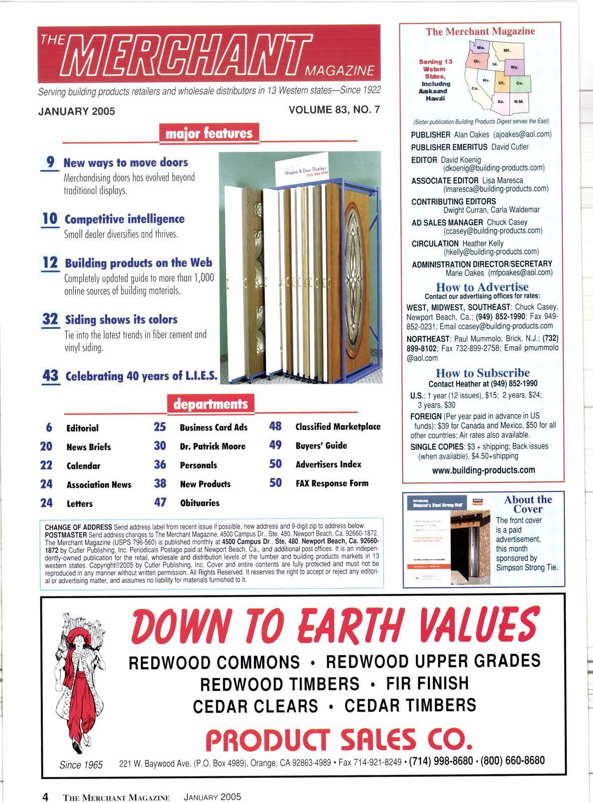 Seruing buitding products retailers and wholesale distributors in 1 3 Western states-Since 1922 I 9 llew woys lo move doors Merchondising doors hos evolved beyond troditionol disploys. l0 Competitive intelligente Smoll deoler divenifies ond thrives. 12 fuilding producfs on the Web Completely updoted guide to more thon 1,000 online sources of buildino moteriols. Siding shows ils colors Tie into the lotestirends in fiber cement ond vinyl siding. Celebroting 40 yeors of LI.E.S. JANUARY 2OO5 5 Editoriol 20 ilews Briefs 22 (olendor 24 Associolion llews VOLUME 83, NO.7 48 Clossifiedlllorkelploce 49 Buyers'Guide 50 Adverlisers Index 50 llx Response lorn !2 43 25 Business Cord Ads 30 Dr. Porrick ltloore 36 Personots 38 ilew Producls r I i F r f24 lefiers 47 obituories j CHANGE OF ADDRESS Send address label from recent issue if possible, new address and 9-digit zip_to address below. I pOSfmlSfgR Send address changes to The Merchant Magazine, 4500 Campus Dr, Ste 48o,-Newporl Beach, Ca. 92660-1 872 The Merchant Maqazine (USPS ZgO-SOO) ls published monthly at 4500 Campus Dr., Ste.480. Newpofl Beach, Ca.92660! 1872by Cutler Puhishing, Inc. Periodicals Postage paid at Newport Beach, Ca., and additional po$ olfices. lt is an indepen: dentty-6wned publicatiorifor the retail, wholesale and distribution levels of the lumber and building products markets in 13 r west6rn stated. Copyright@2o0s by Cutler Publishing, Inc. Cover and entire contenls are fully protected and must not be reproduced in any ininier without ivritten permission.-AIl