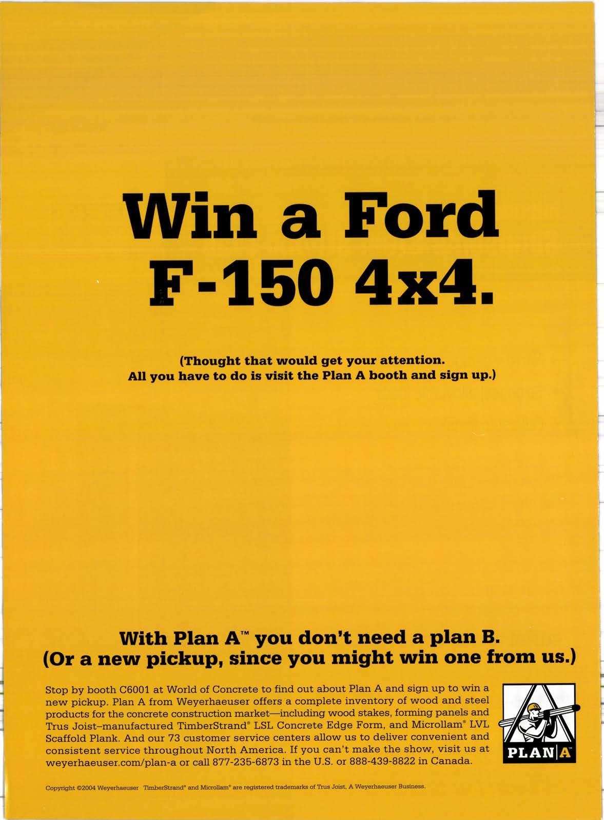 Win a Ford F-!50 4x4'. (Thought that would get your attention. All you have to do is visit the Plan A booth and sign up.) With PIan A'" you don't need a plan B. (Or a new pickup, since you might win one from us,) Stop by booth C6001 at World of Concrete to find out about Plan A and sign up to win a new pickup. Plan A from Weyerhaeuser offers a complete inventory of wood and steel products for the concrete construstion market-including wood stakes, forming panels and Trus Joist-manufactured TimberStrand'LSL Concrete Edge Form, and Microllam'LVL Scaffold Plank. And our 73 customer service centers allow us to deliver convenient and consistent service throughout North America. If you can't make the show, visit us at weyerhaeuser.com/plan-a or call 877-235-6873 in the U.S. or 888-439-8822 in Canada. Copyright 02004 Weyethaeuser Tl&lcerstrado dd Microllil' are regristered trademarks of lYus Joist, A Weyerhaeusel Business.