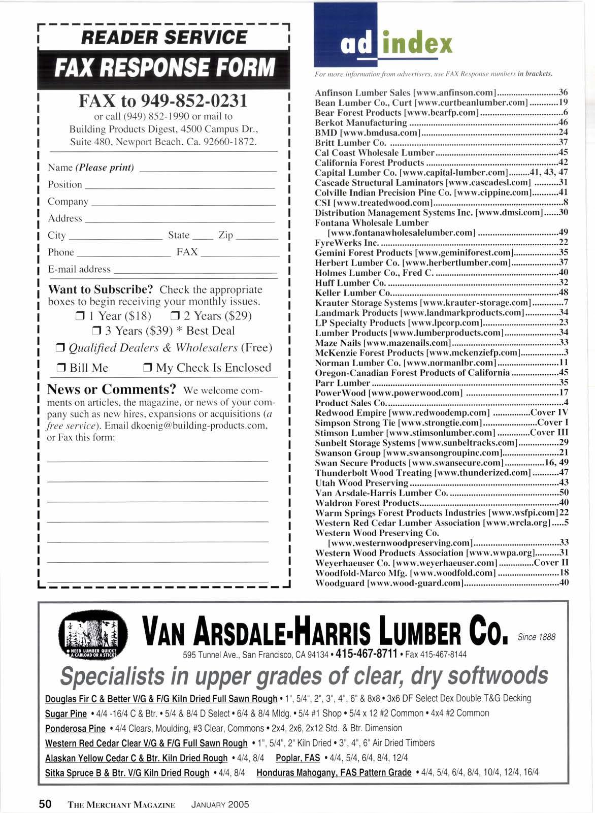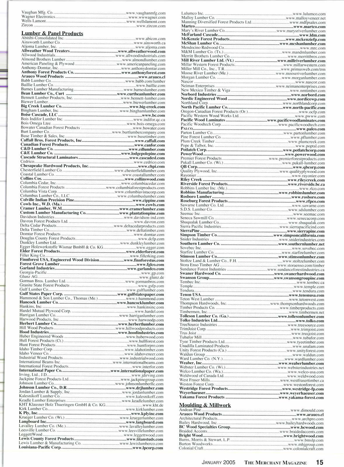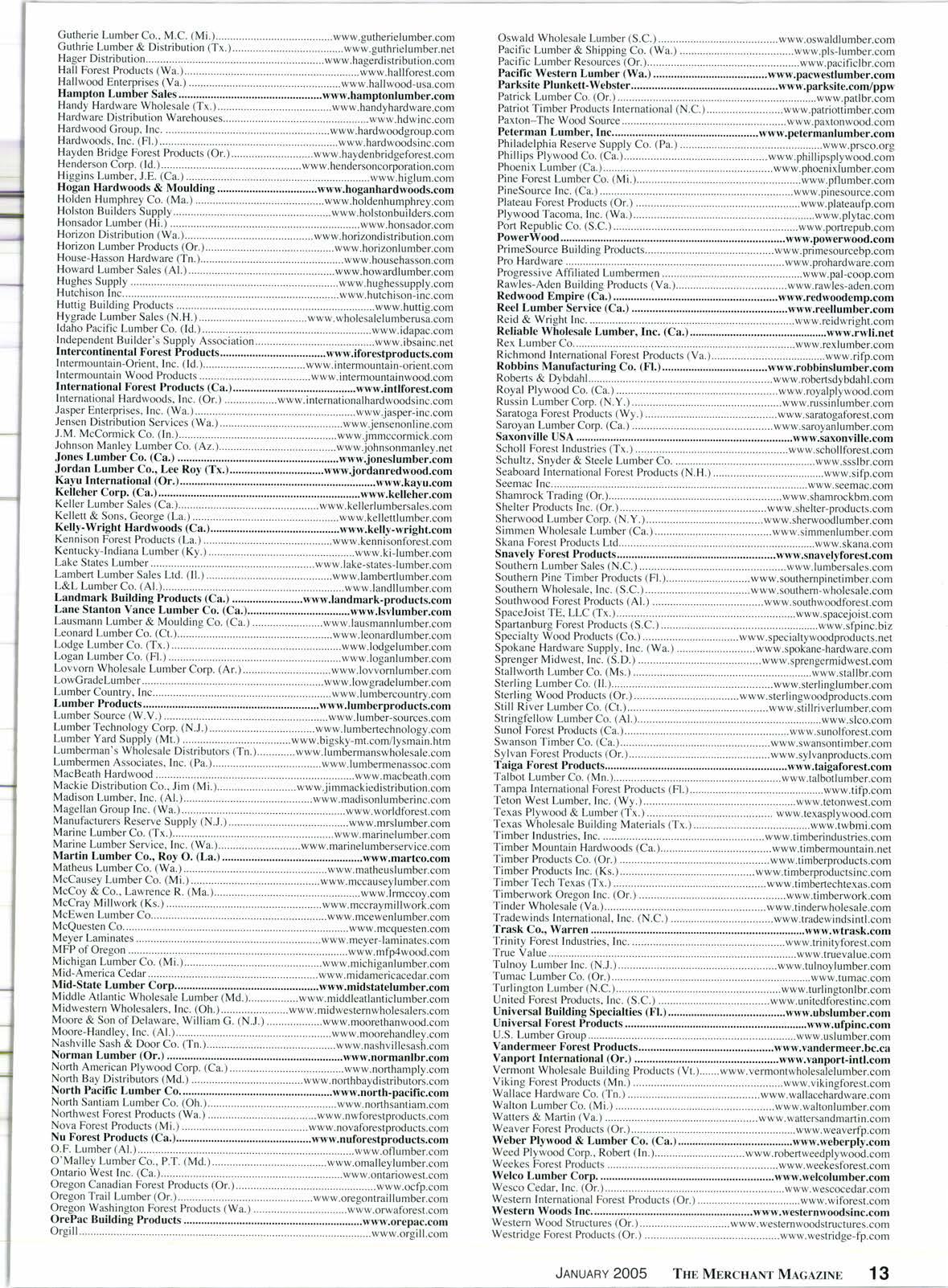 Phone Anfi nson Lumber Sales [www.anfi nson.com]........................,.36 Bean Lumber Co., Curt [www.curtbeanlumber.com]............19 Bear Forest Products Iwww.bearfp.com]...................................6 Berkot Manufacturing ..................... ...................46 BMD [www.bmdusa.com].. ..,.,....24 Britt Lumber Co. ....37 Cal Coast Wholesale Lumber......... ....................45 California Forest Products.................... .............42 Capital Lumber Co. [www.capital-lumber.com].........41, 43, 47 Cascade Structural Laminators [www.cascadesl.com] ..........31 Colville Indian Precision Pine Co. [www.cippine.com]...........41 CSI [www.treatedwood.com] ......8 Distribution Management Systems Inc. [www.dmsi.com]......30 Fontana Wholesale Lumber [www.fontanawholesalelumber.com] ..,..,.....49 FyreWerks Inc................. ............22 Gemini Forest Products Iwww.geminiforest.com]...................35 Herbert Lumber Co. [www.herbertlumber.com]....................37 Holmes Lumber Co., Fred C...,,............... ..........40 HuffLumber Co. ..........32 Keller Lumber Co. Krauter Storage Systems [www.krauter-storage.com].............7 Landmark Products Iwww.landmarkproducts.com]..............34 LP Specialty Products [www.Ipcorp.com].....................,..,..,....23 Lumber Products Iwww.lumberproducts.com].......................34 Maze Nails [www.mazenails.com] ?? McKenzie Forest Products Iwww.mckenziefp.com]..................3