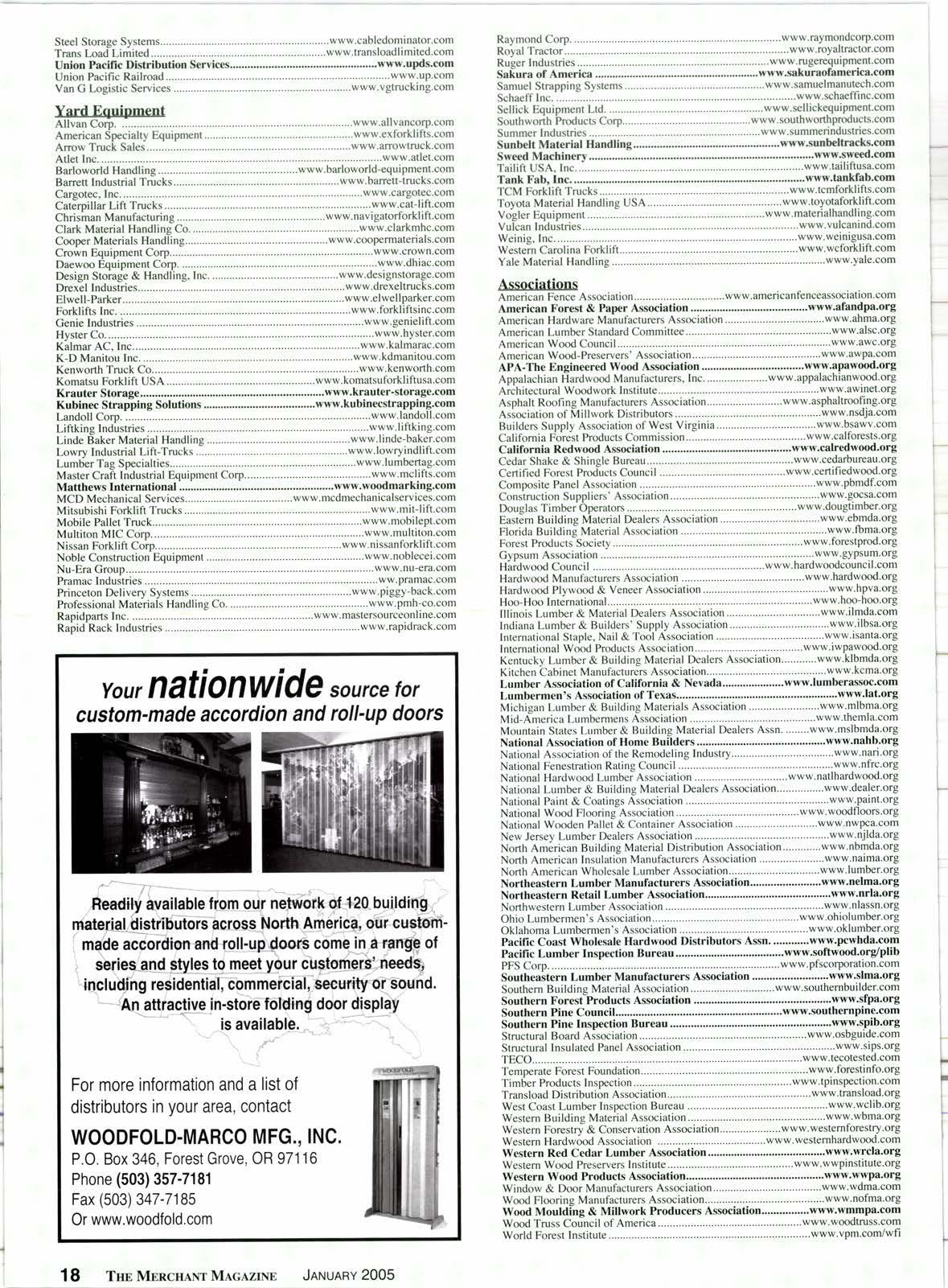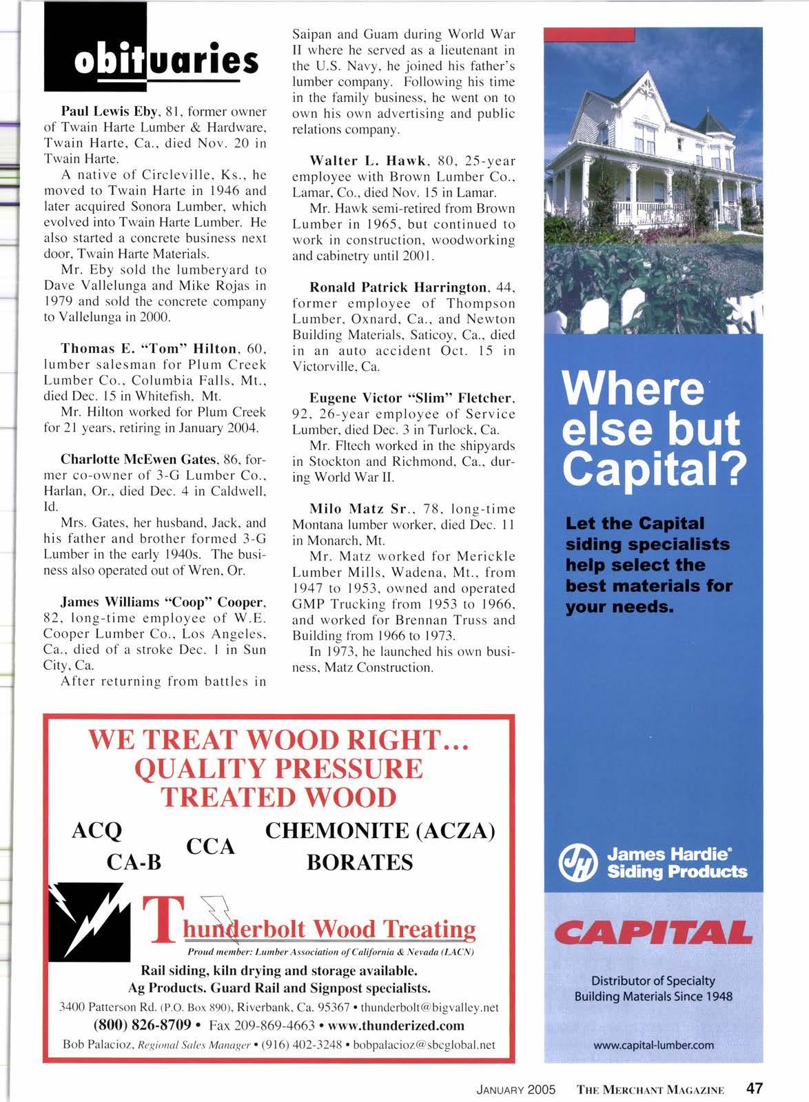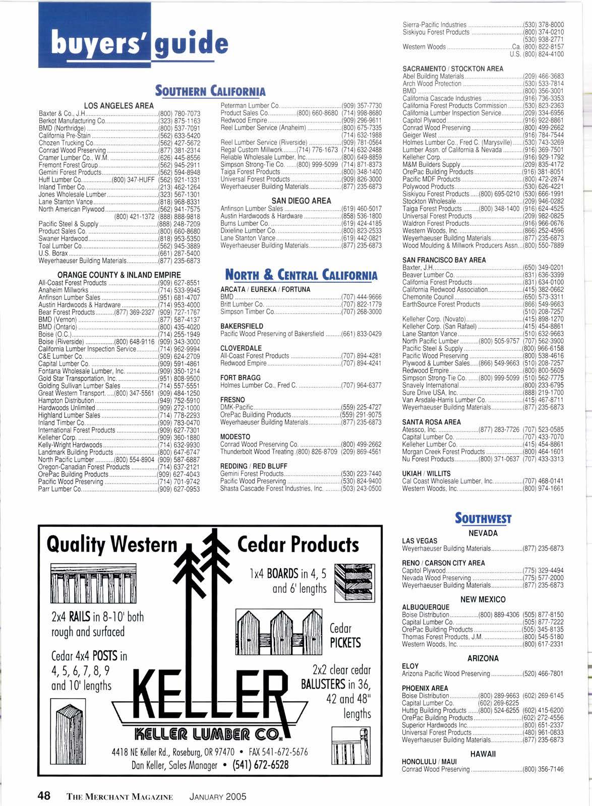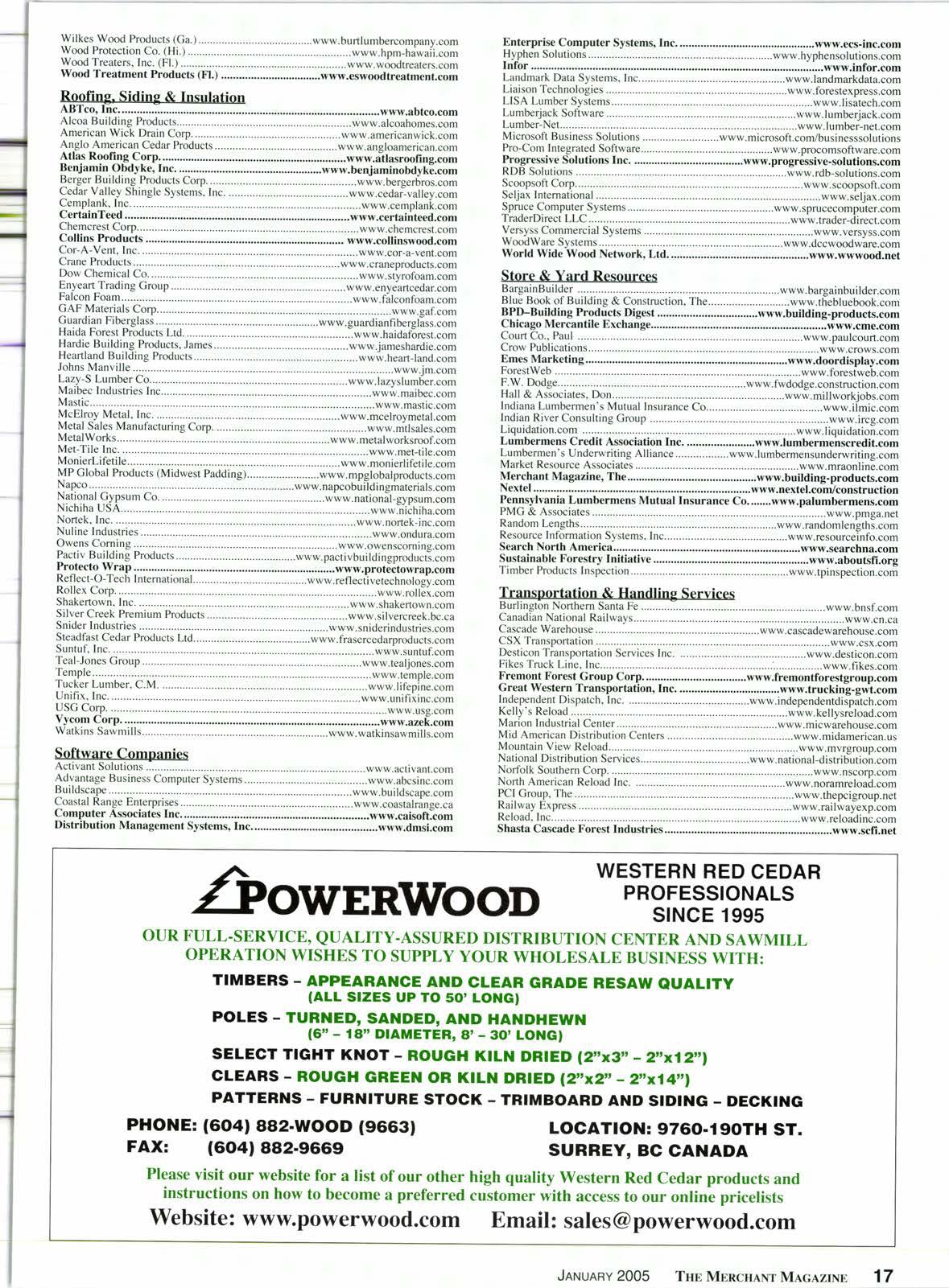 Phone Anfi nson Lumber Sales [www.anfi nson.com]........................,.36 Bean Lumber Co., Curt [www.curtbeanlumber.com]............19 Bear Forest Products Iwww.bearfp.com]...................................6 Berkot Manufacturing ..................... ...................46 BMD [www.bmdusa.com].. ..,.,....24 Britt Lumber Co. ....37 Cal Coast Wholesale Lumber......... ....................45 California Forest Products.................... .............42 Capital Lumber Co. [www.capital-lumber.com].........41, 43, 47 Cascade Structural Laminators [www.cascadesl.com] ..........31 Colville Indian Precision Pine Co. [www.cippine.com]...........41 CSI [www.treatedwood.com] ......8 Distribution Management Systems Inc. [www.dmsi.com]......30 Fontana Wholesale Lumber [www.fontanawholesalelumber.com] ..,..,.....49 FyreWerks Inc................. ............22 Gemini Forest Products Iwww.geminiforest.com]...................35 Herbert Lumber Co. [www.herbertlumber.com]....................37 Holmes Lumber Co., Fred C...,,............... ..........40 HuffLumber Co. ..........32 Keller Lumber Co. Krauter Storage Systems [www.krauter-storage.com].............7 Landmark Products Iwww.landmarkproducts.com]..............34 LP Specialty Products [www.Ipcorp.com].....................,..,..,....23 Lumber Products Iwww.lumberproducts.com].......................34 Maze Nails [www.mazenails.com] ?? McKenzie Forest Products Iwww.mckenziefp.com]..................3