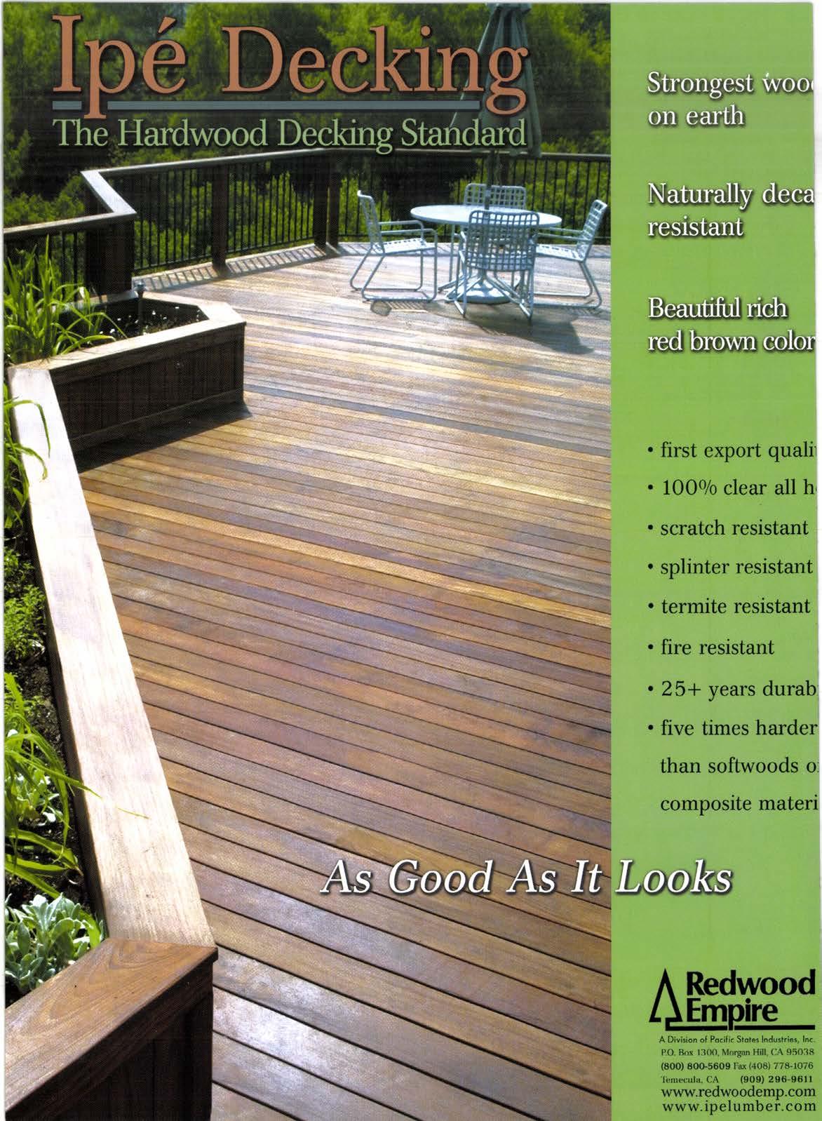 'p'l * ri*ru-r*Jly sieea -affit#&rffi3 tr*m*ni$uJ s*#3* r.ng.$ !:sc)11,s: #ejfo"r first cxport quali 1000/o clear all h scratch rcsistant splinter resistant termite resistant fire resistant 25+ years durab five times harder than softwoods o composite materi -Lsciqs A Redwood {}Empllg_ A Division of Pd.ili. Slcle! lndustries, lnc l)() llor lltOi). \lt,rgrn Ilill ( \ 95O'!8 (tlOO) 800-5609 l dt i'}0ti) 778-ll)7(i li,rlttrrlir. C.\ (909) 2116 !)61t rvww.redwoodemp.com rvww.ipelumbe r"com {rC u'f}reeJ+-,.,f "'" r,'" {ri.1 }*,i'L.-, l::lrllll .Ar"rt*.6