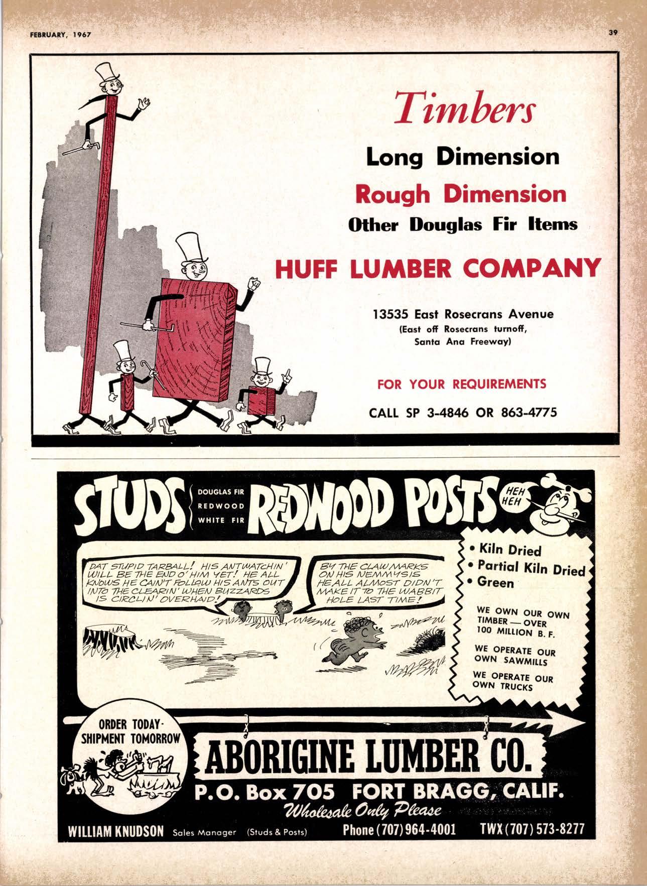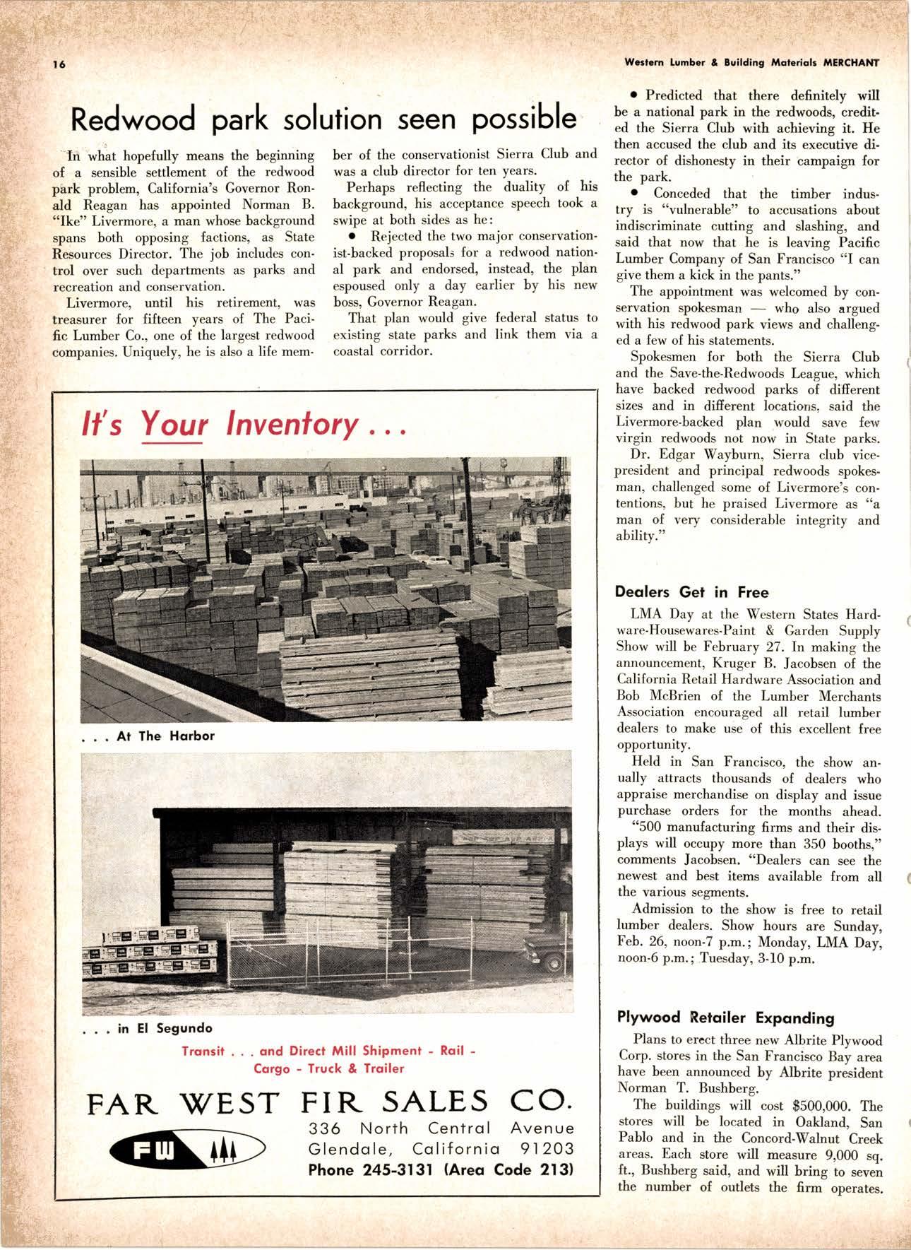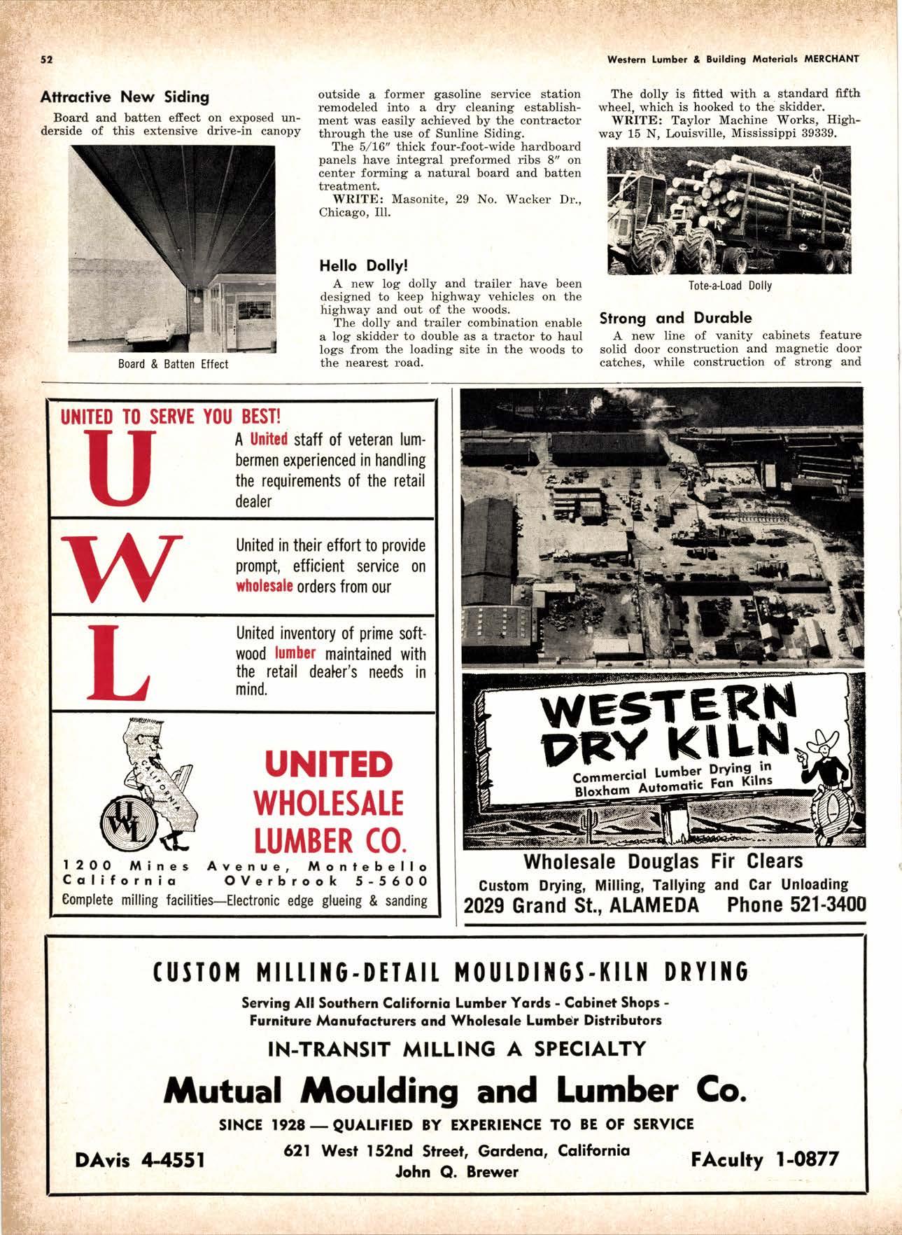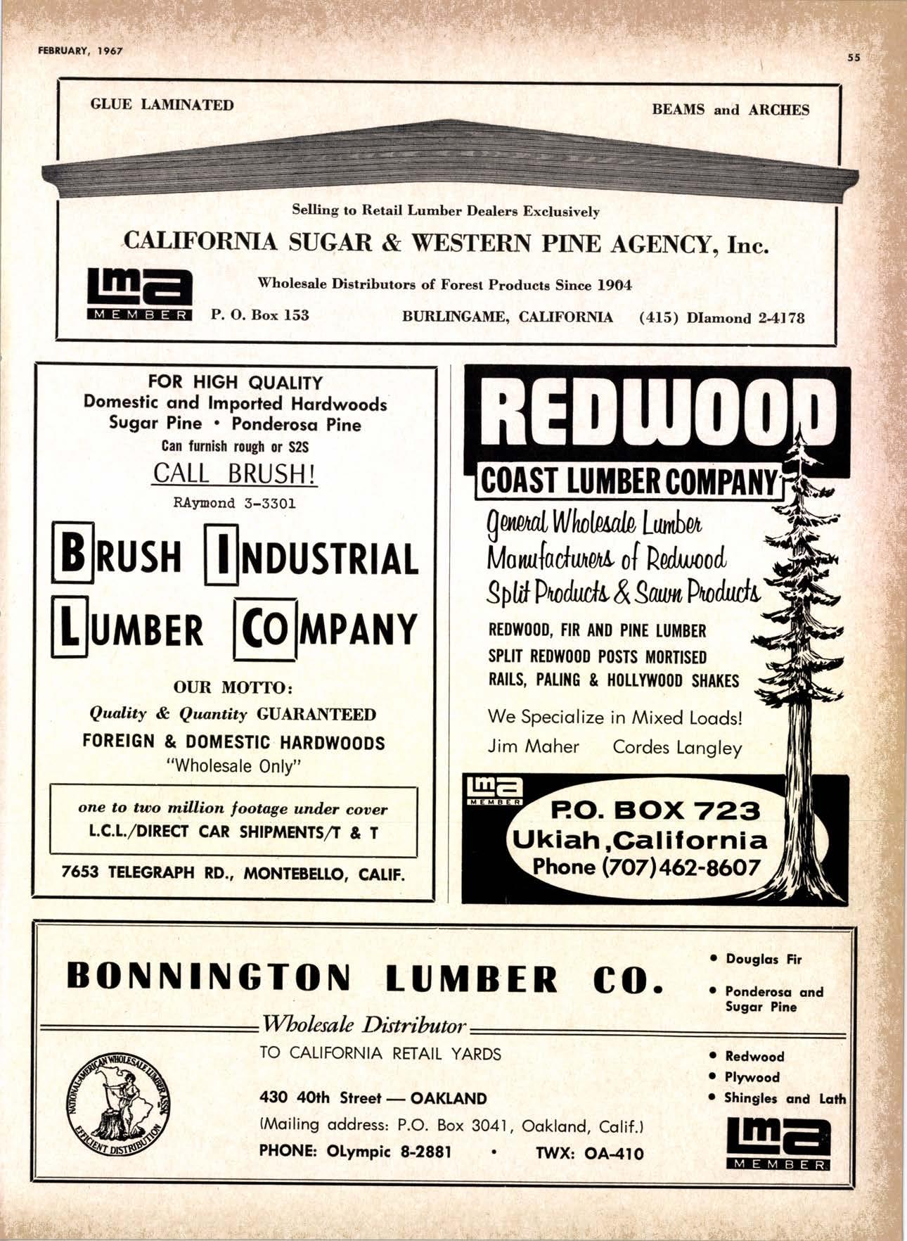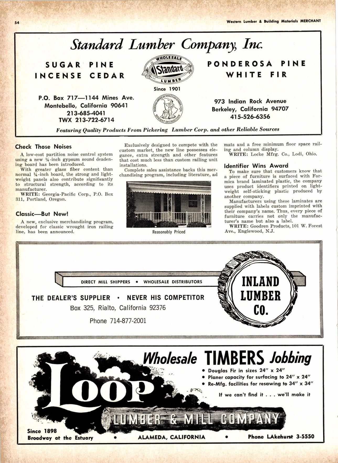LCL REDWOOD CAR LOT I5@O NETSON STREEI EDgewood 5-1251 . CITY OF INDUSTRY, CAUF. a a i. Fr. ,' r: let Us Prove This ls Coll or wrife for TUMBTR ORRITRT lrom Be*ol y' esprclatl ADAPIABIE TO CUSTOMER NEEDS y' scrENTrFrcAttY DESIGNED FOR Att TYPES OF WORK y' EATANGEo Fot EASE OF HANDIING the Cqri for You! free brochure BERI(()I MAilUTAfiURIIIO (OMPAIIY I1285 Goss Slreel, Sun Volley, Colif. Phone:875-I163 California Lumber lnspection Seryice il90 uNcotN AvE. O SAN JOSE 25, CAIIFORNIA ' 297-8071 lnspection Services-DOUGLAS FIR o R,EDWOOD o PINE Mill Supewi3ien-flqnsient lnspection-Speciol Services Los Angeles supervisor: 665-5431 British Columbio supervisor: Komloops 374-4303 Eric Hexbeq Don Gow Dole Storling Chorlie Schumqcher HEXBERG LUilBER SALES, rNc Sugrr Pine-Ponderosa Pine-White Fir-Oouglas Fir and lncenss Cedal Truck ond Troiler or Direct Roil Shipments 5855 NAPTES PTAZA _ LONG BEACH, CAIIF. From Los Angeles Coll: SP 5-6107 Beqch Areo Cqll: 433-2472 or l7l41826-0636 Buying Office Red Bluff Lee Deering ' [A 7-5556 C*/-S* Jr*ln, So/no, -9n'. 4616 EL CAMINO AVE" SACRAMENTO, CALIF.95821 P.O.BOX 2l-4597 . PHONE: (916) 487-7847 SOUTHERN CALIFORNIA OFFICE: P.O. Box 404, Montebello, Colif. Phone: (213)685-5288