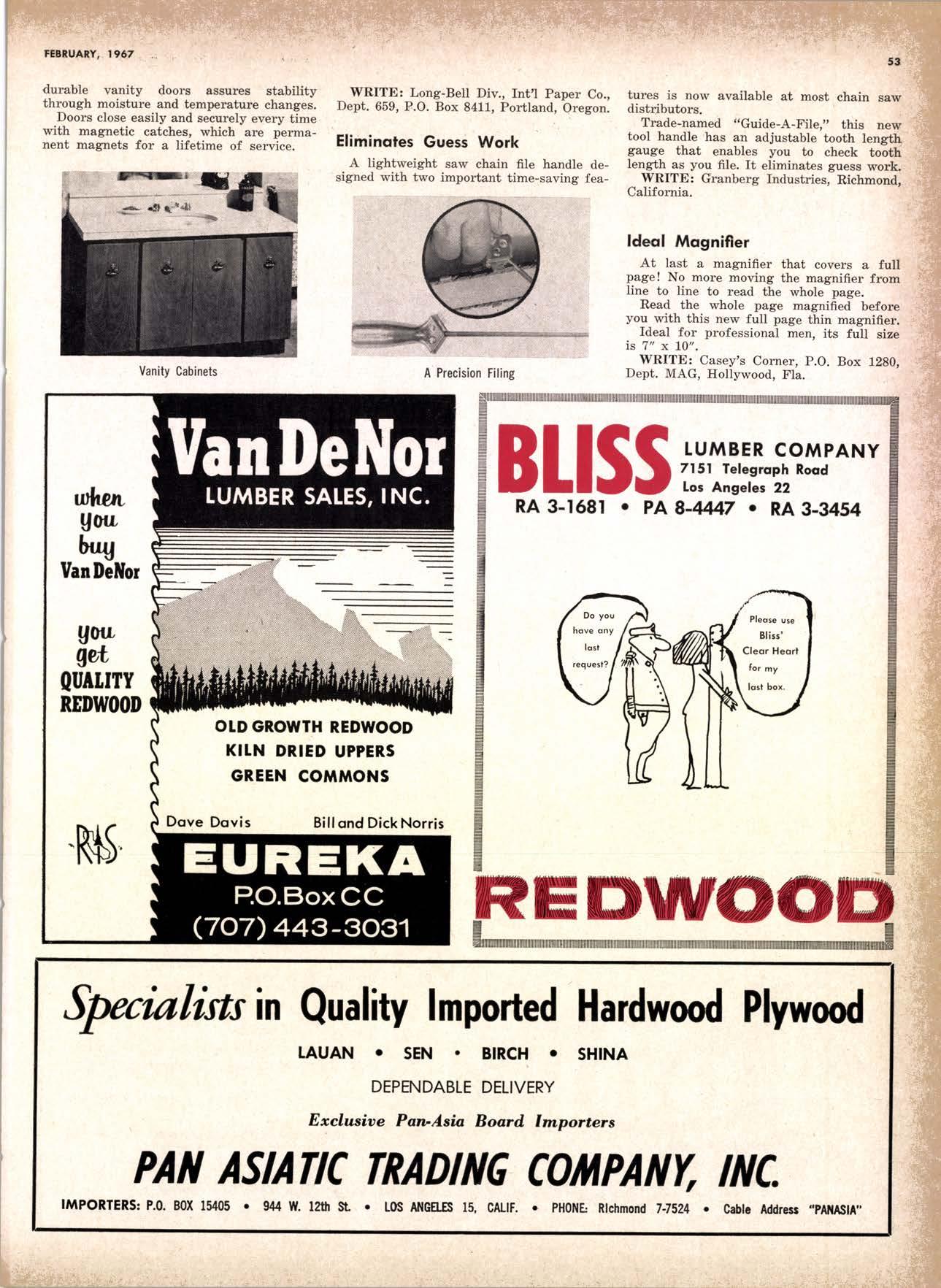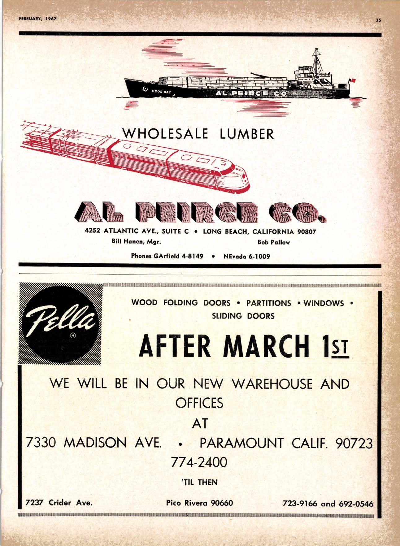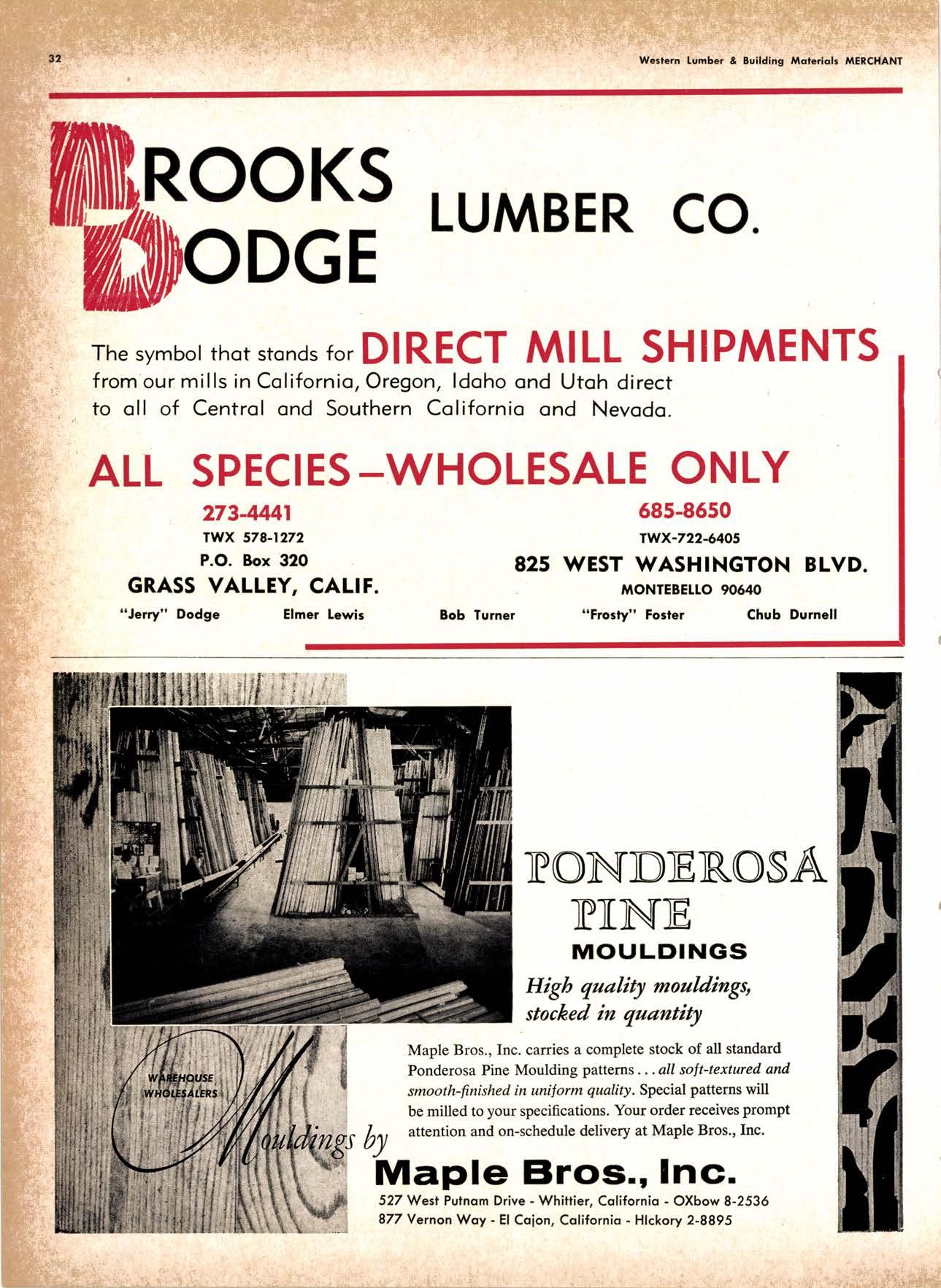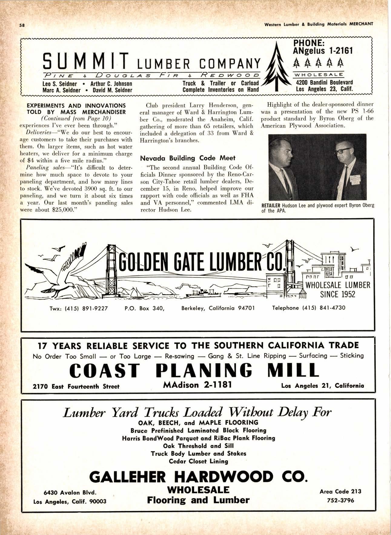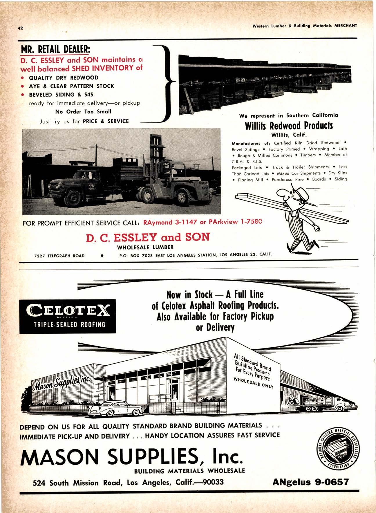 LCL REDWOOD CAR LOT I5@O NETSON STREEI EDgewood 5-1251 . CITY OF INDUSTRY, CAUF. a a i. Fr. ,' r: let Us Prove This ls Coll or wrife for TUMBTR ORRITRT lrom Be*ol y' esprclatl ADAPIABIE TO CUSTOMER NEEDS y' scrENTrFrcAttY DESIGNED FOR Att TYPES OF WORK y' EATANGEo Fot EASE OF HANDIING the Cqri for You! free brochure BERI(()I MAilUTAfiURIIIO (OMPAIIY I1285 Goss Slreel, Sun Volley, Colif. Phone:875-I163 California Lumber lnspection Seryice il90 uNcotN AvE. O SAN JOSE 25, CAIIFORNIA ' 297-8071 lnspection Services-DOUGLAS FIR o R,EDWOOD o PINE Mill Supewi3ien-flqnsient lnspection-Speciol Services Los Angeles supervisor: 665-5431 British Columbio supervisor: Komloops 374-4303 Eric Hexbeq Don Gow Dole Storling Chorlie Schumqcher HEXBERG LUilBER SALES, rNc Sugrr Pine-Ponderosa Pine-White Fir-Oouglas Fir and lncenss Cedal Truck ond Troiler or Direct Roil Shipments 5855 NAPTES PTAZA _ LONG BEACH, CAIIF. From Los Angeles Coll: SP 5-6107 Beqch Areo Cqll: 433-2472 or l7l41826-0636 Buying Office Red Bluff Lee Deering ' [A 7-5556 C*/-S* Jr*ln, So/no, -9n'. 4616 EL CAMINO AVE" SACRAMENTO, CALIF.95821 P.O.BOX 2l-4597 . PHONE: (916) 487-7847 SOUTHERN CALIFORNIA OFFICE: P.O. Box 404, Montebello, Colif. Phone: (213)685-5288