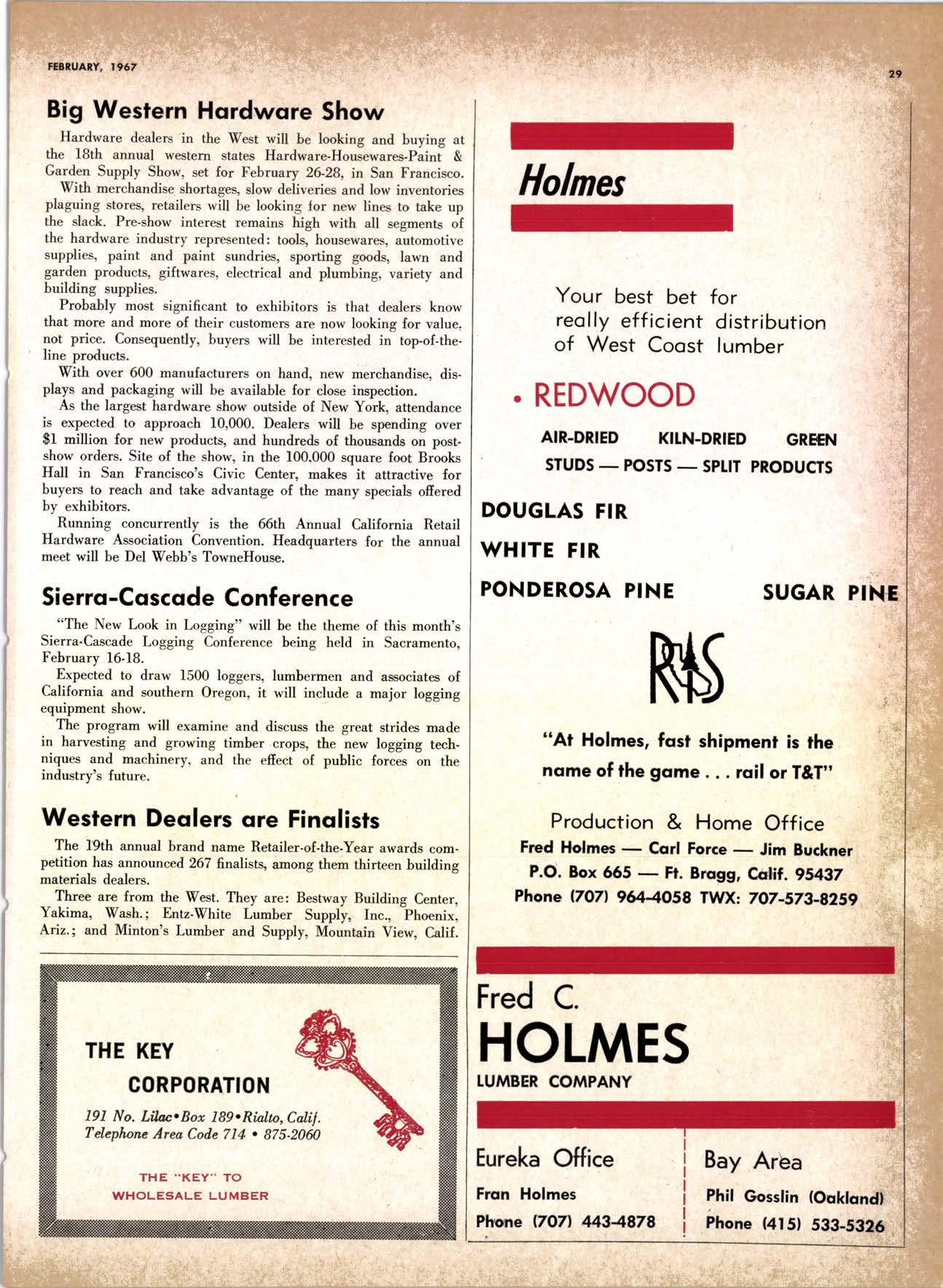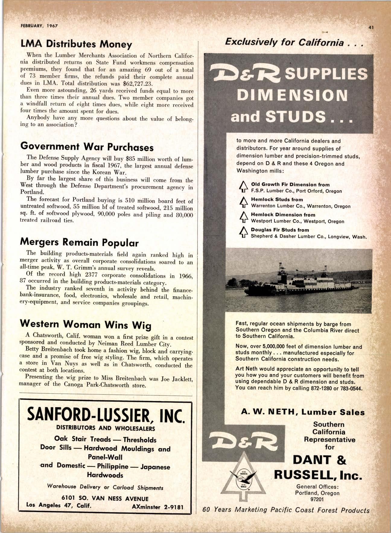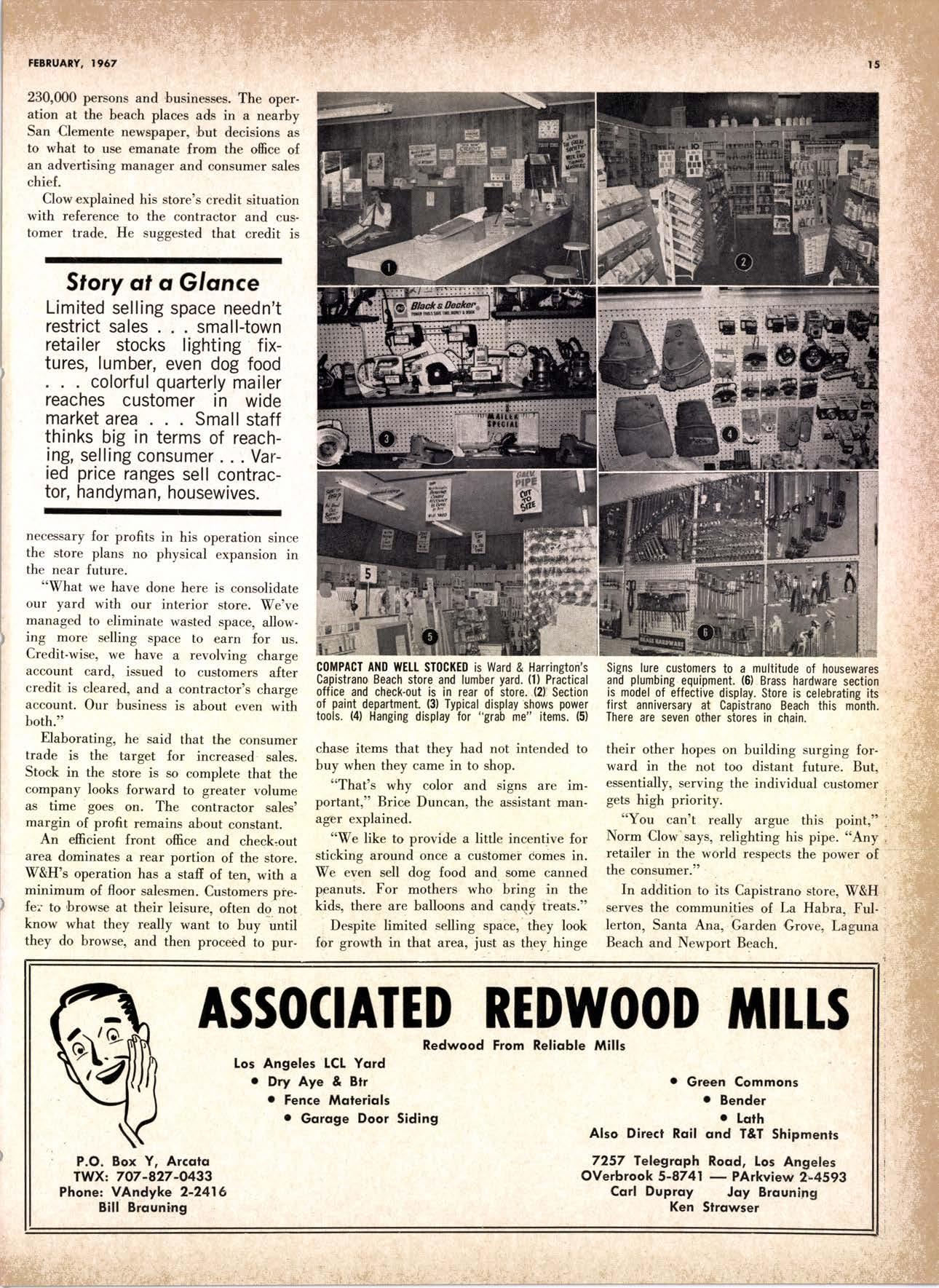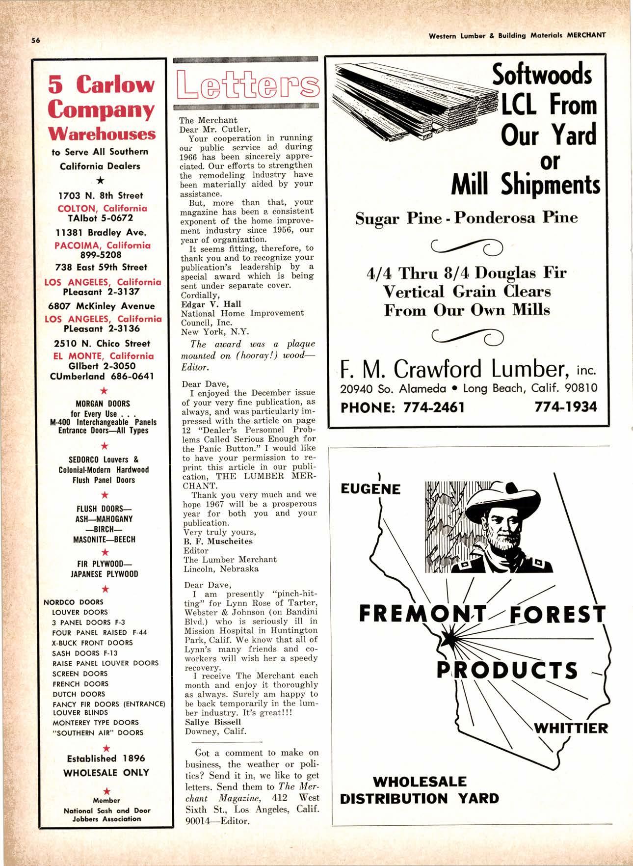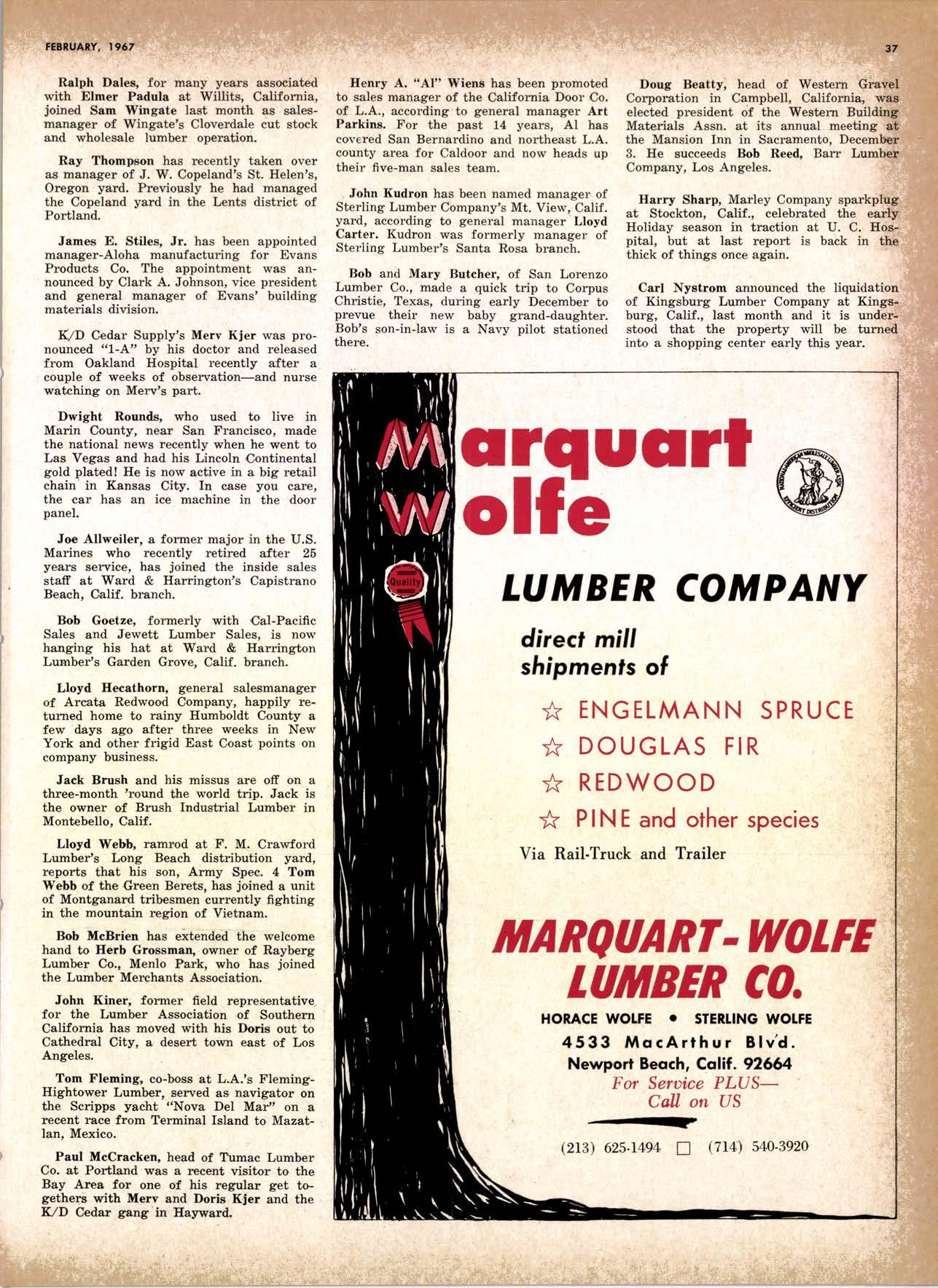 LCL REDWOOD CAR LOT I5@O NETSON STREEI EDgewood 5-1251 . CITY OF INDUSTRY, CAUF. a a i. Fr. ,' r: let Us Prove This ls Coll or wrife for TUMBTR ORRITRT lrom Be*ol y' esprclatl ADAPIABIE TO CUSTOMER NEEDS y' scrENTrFrcAttY DESIGNED FOR Att TYPES OF WORK y' EATANGEo Fot EASE OF HANDIING the Cqri for You! free brochure BERI(()I MAilUTAfiURIIIO (OMPAIIY I1285 Goss Slreel, Sun Volley, Colif. Phone:875-I163 California Lumber lnspection Seryice il90 uNcotN AvE. O SAN JOSE 25, CAIIFORNIA ' 297-8071 lnspection Services-DOUGLAS FIR o R,EDWOOD o PINE Mill Supewi3ien-flqnsient lnspection-Speciol Services Los Angeles supervisor: 665-5431 British Columbio supervisor: Komloops 374-4303 Eric Hexbeq Don Gow Dole Storling Chorlie Schumqcher HEXBERG LUilBER SALES, rNc Sugrr Pine-Ponderosa Pine-White Fir-Oouglas Fir and lncenss Cedal Truck ond Troiler or Direct Roil Shipments 5855 NAPTES PTAZA _ LONG BEACH, CAIIF. From Los Angeles Coll: SP 5-6107 Beqch Areo Cqll: 433-2472 or l7l41826-0636 Buying Office Red Bluff Lee Deering ' [A 7-5556 C*/-S* Jr*ln, So/no, -9n'. 4616 EL CAMINO AVE" SACRAMENTO, CALIF.95821 P.O.BOX 2l-4597 . PHONE: (916) 487-7847 SOUTHERN CALIFORNIA OFFICE: P.O. Box 404, Montebello, Colif. Phone: (213)685-5288