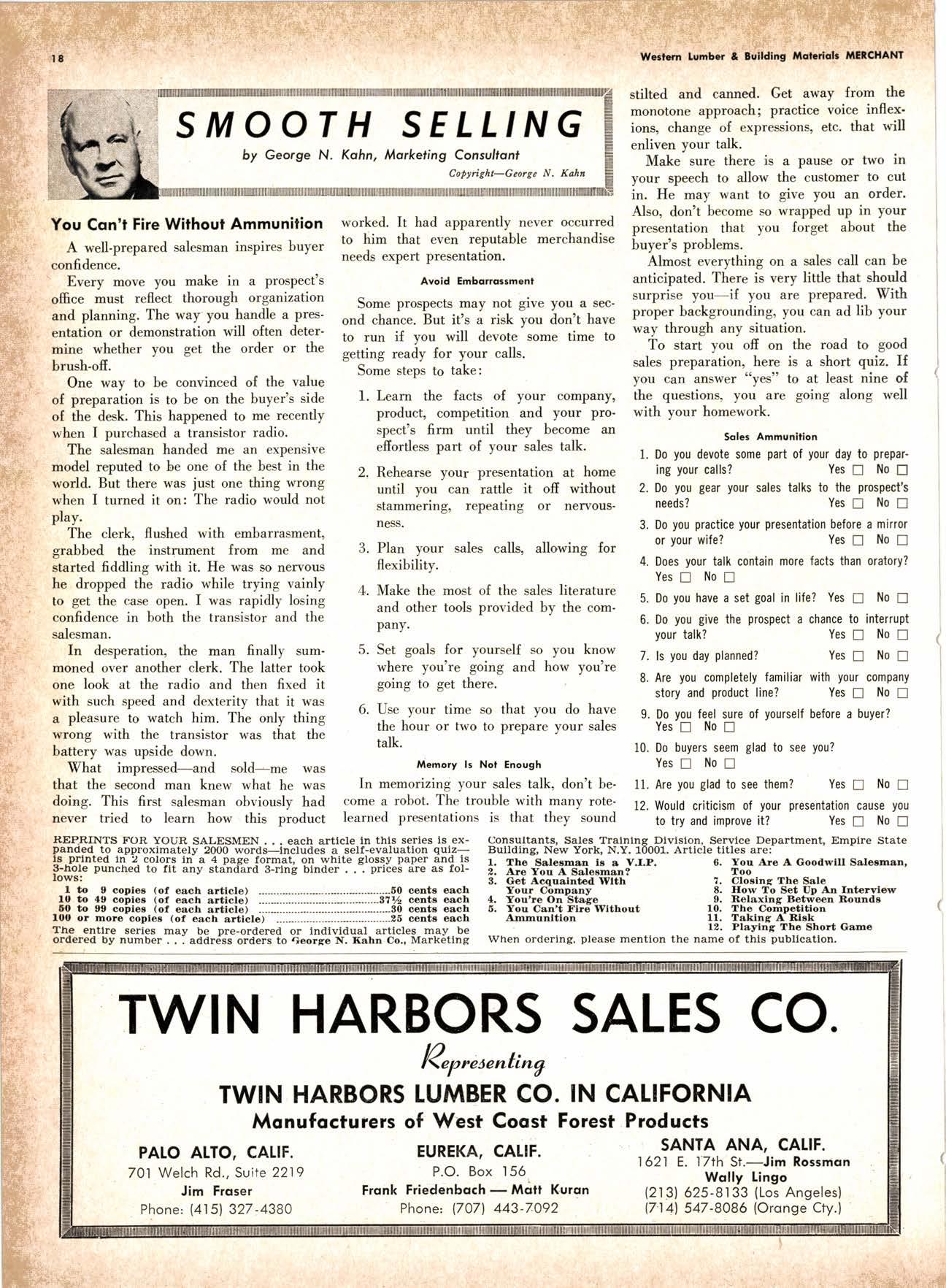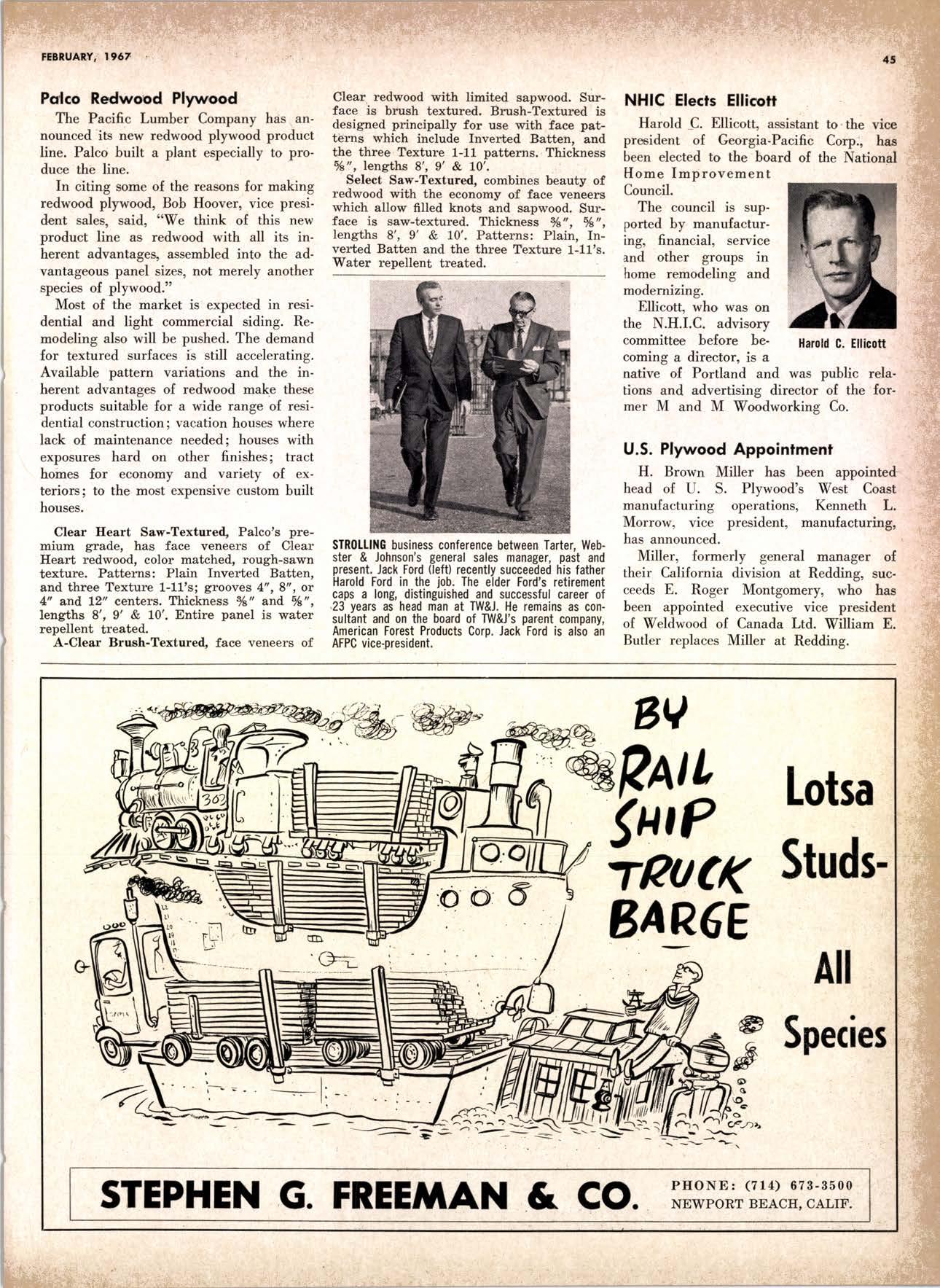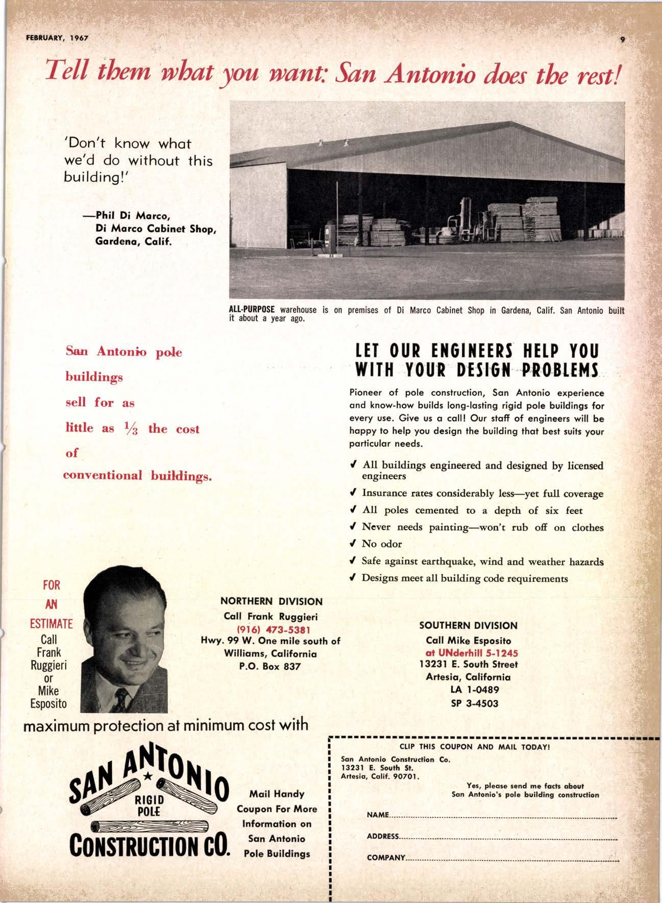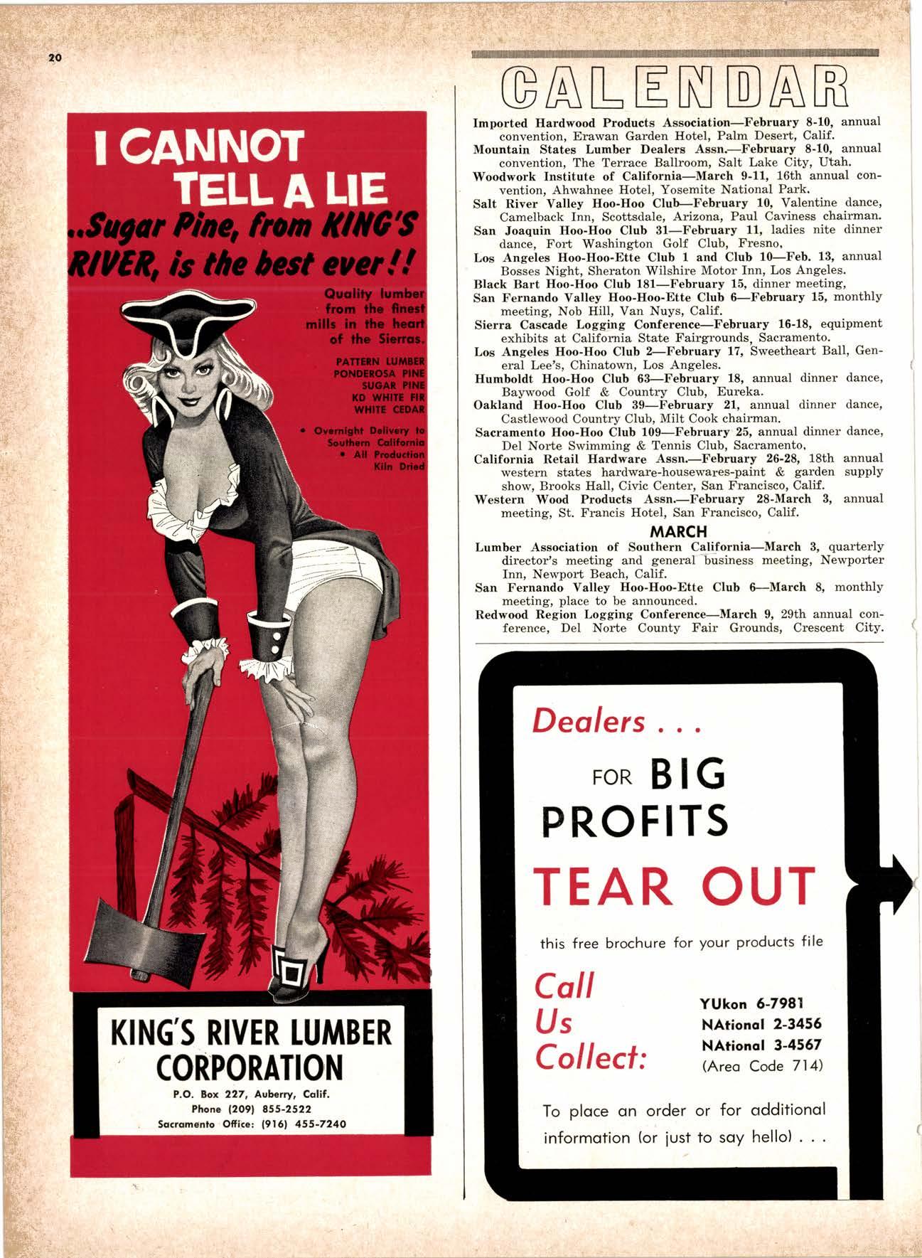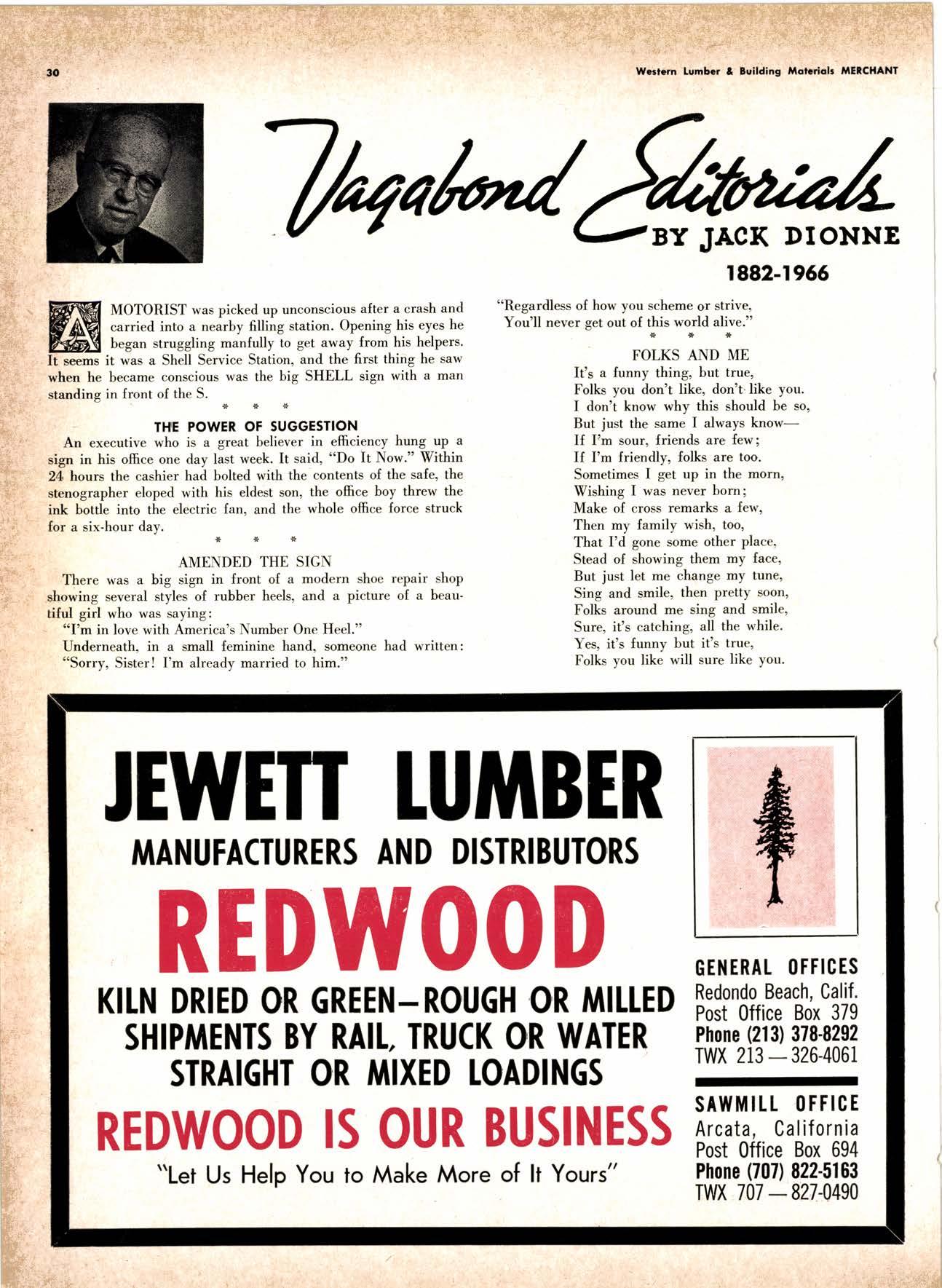 LCL REDWOOD CAR LOT I5@O NETSON STREEI EDgewood 5-1251 . CITY OF INDUSTRY, CAUF. a a i. Fr. ,' r: let Us Prove This ls Coll or wrife for TUMBTR ORRITRT lrom Be*ol y' esprclatl ADAPIABIE TO CUSTOMER NEEDS y' scrENTrFrcAttY DESIGNED FOR Att TYPES OF WORK y' EATANGEo Fot EASE OF HANDIING the Cqri for You! free brochure BERI(()I MAilUTAfiURIIIO (OMPAIIY I1285 Goss Slreel, Sun Volley, Colif. Phone:875-I163 California Lumber lnspection Seryice il90 uNcotN AvE. O SAN JOSE 25, CAIIFORNIA ' 297-8071 lnspection Services-DOUGLAS FIR o R,EDWOOD o PINE Mill Supewi3ien-flqnsient lnspection-Speciol Services Los Angeles supervisor: 665-5431 British Columbio supervisor: Komloops 374-4303 Eric Hexbeq Don Gow Dole Storling Chorlie Schumqcher HEXBERG LUilBER SALES, rNc Sugrr Pine-Ponderosa Pine-White Fir-Oouglas Fir and lncenss Cedal Truck ond Troiler or Direct Roil Shipments 5855 NAPTES PTAZA _ LONG BEACH, CAIIF. From Los Angeles Coll: SP 5-6107 Beqch Areo Cqll: 433-2472 or l7l41826-0636 Buying Office Red Bluff Lee Deering ' [A 7-5556 C*/-S* Jr*ln, So/no, -9n'. 4616 EL CAMINO AVE" SACRAMENTO, CALIF.95821 P.O.BOX 2l-4597 . PHONE: (916) 487-7847 SOUTHERN CALIFORNIA OFFICE: P.O. Box 404, Montebello, Colif. Phone: (213)685-5288