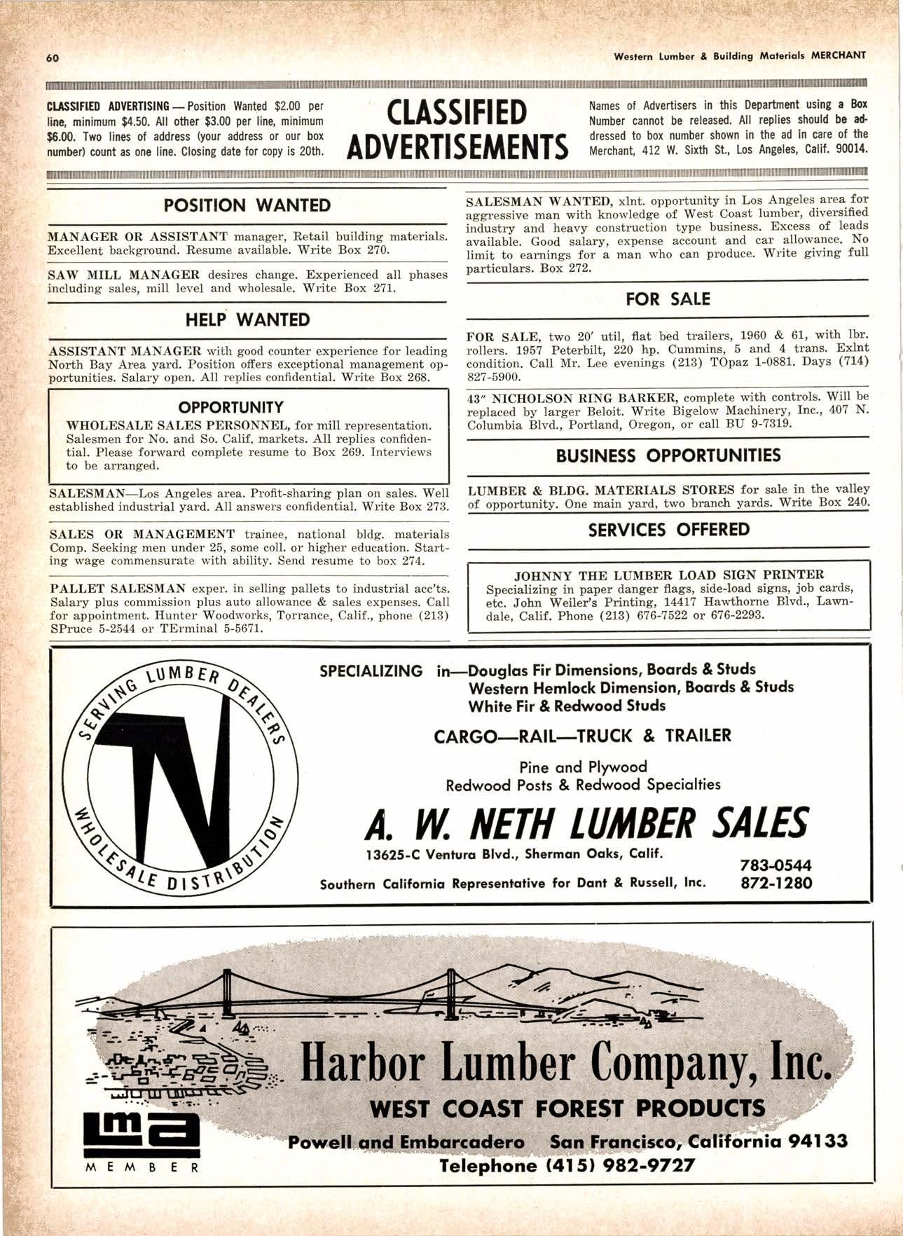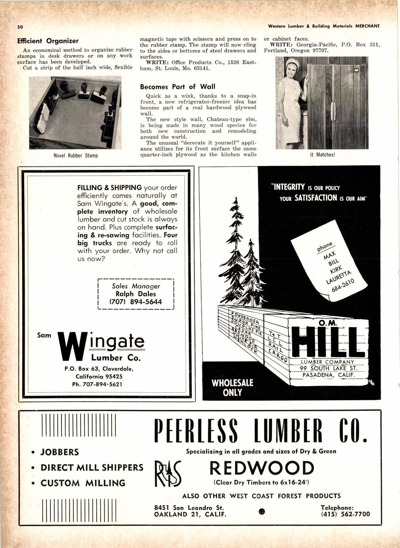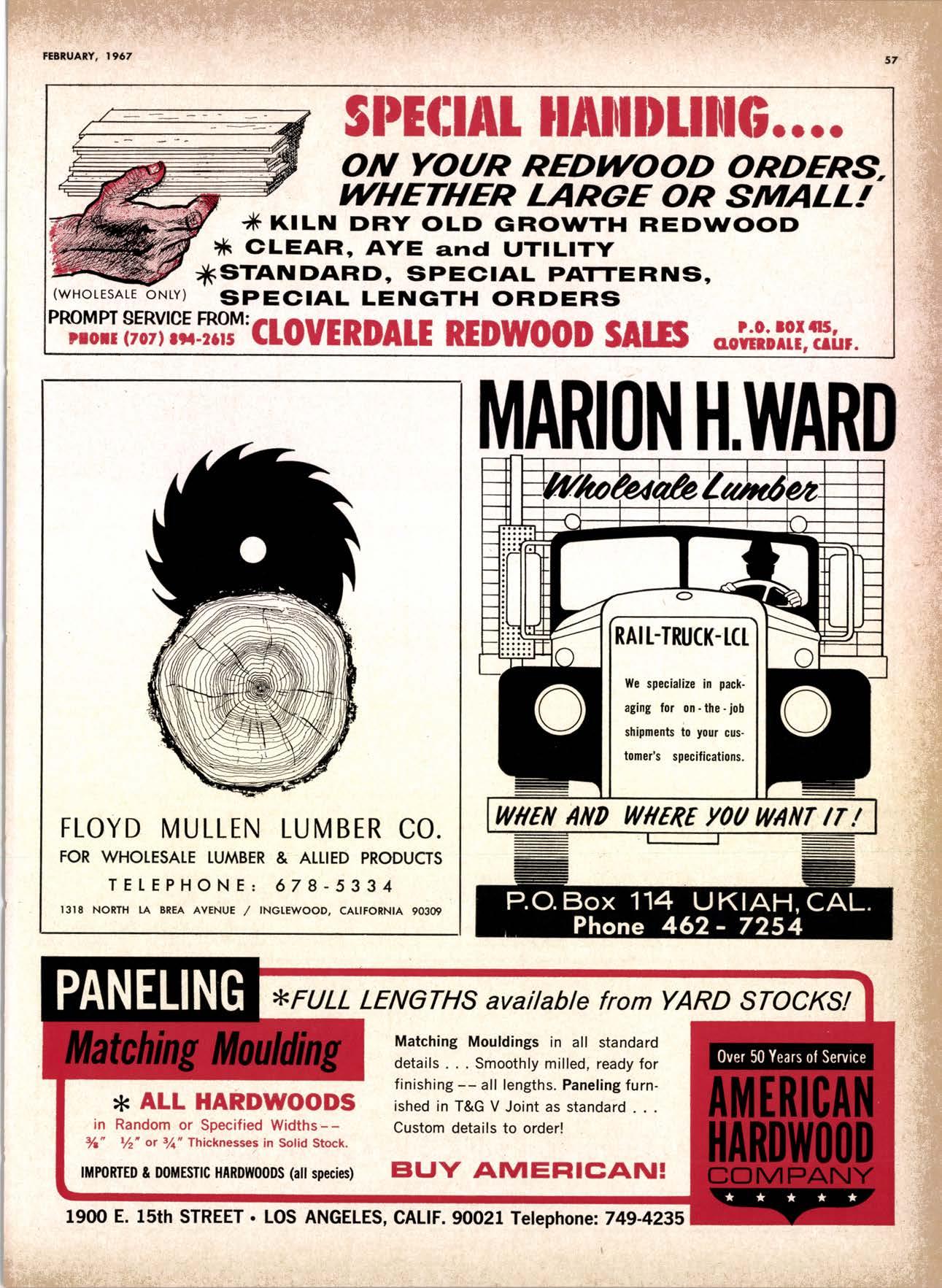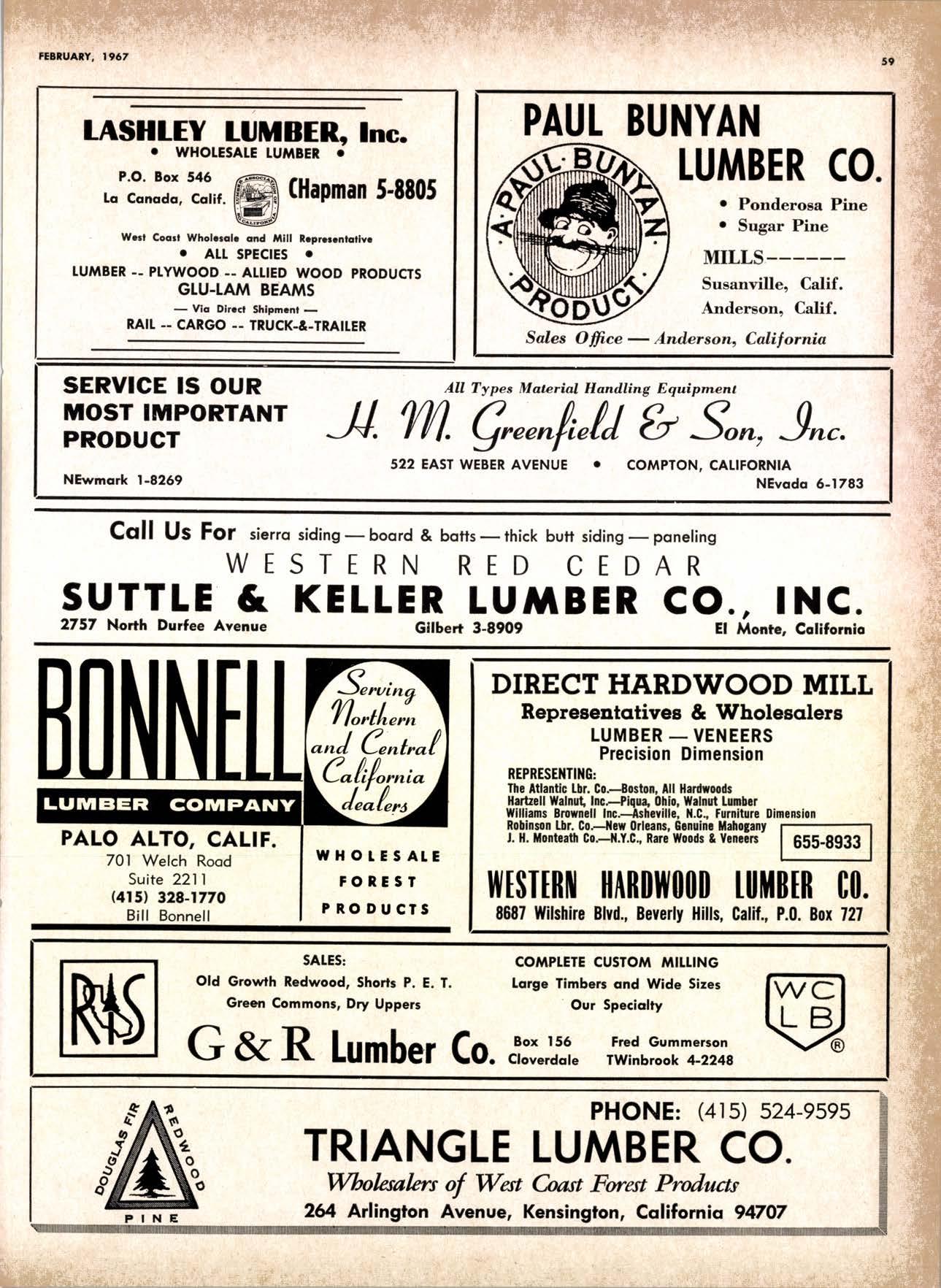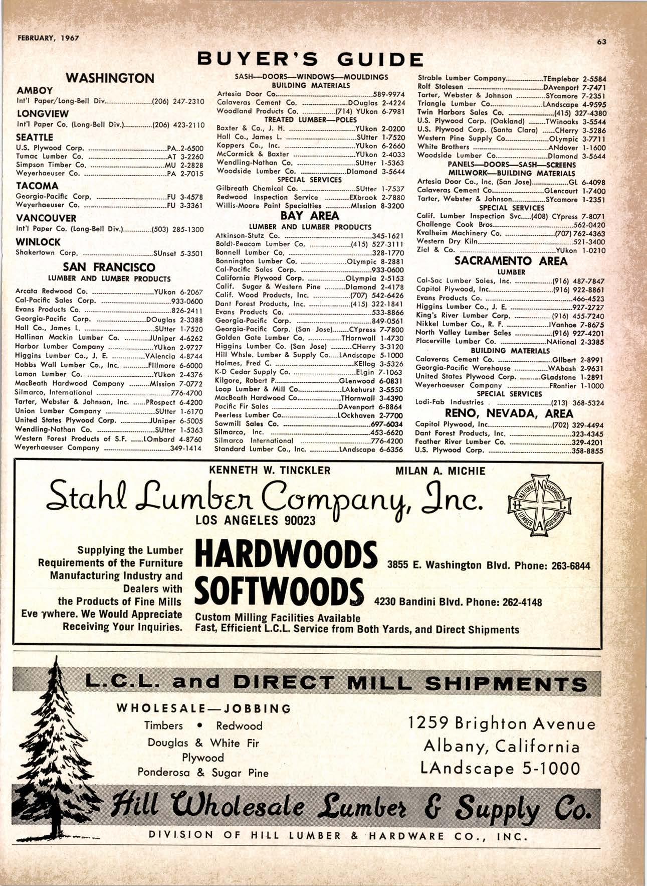 .----.-..-.--.--------.------.-.--KEtlcig 3-5326 X-D Cedor Supply Co. ----Etgin 7-1063 Kilgorc, Robert P,.--------.-..-----.---.-G[enwood 60831 Loop Lumbcr & Mill Co.----..---.--..---LAkchurst 3-5550 l|locBeolh Hordwood Co.---....-..----.-..THornwoll 3-{390 Pocific Fir Soles .......-.......-..-------....-.DAvenport 6-8864 Peerlcss [umbcr Co,...--.--.-..-..--.--.--[Ockhoven 2-Zl(X) Sowmilf Solcr Co. ----..--.--.-..-.----.6n&1 Silnorco, lnc. .....-..--.--.-.. .--153-&20 Sif morco nternolional ------..776-12@ Slondord lumber Co., Inc. ..-..........-[Andscope 66356 Sfroble lunber Compony------------TEmplebor 2-558.{ Roff Slolcscn ----DAvcnporl 7-7171 Torler, Wcbslcr & Johnson ----.-------.-SYcamorc 7-2351 Trlonglc lunbcr Co.--.-..----.-..-.--.---lAndscopr 4-9595 Twfn Horboru Solcr Co. --._-.-J4t q 327.1,gOO U.S. Plyrood Corp. (Ooklondl --.-..-TWinooks 3-d5,14 U.S. Plyrood Corp. lSonto Cloro) -..--Cllcrry 3-5286 Weslcrn Pinc Supply Co.------..--...--.OLynpic 3-7711 White Erolhers .......-.-ANdovcr l-160O Woodside Lumber Co.-..----......---.---Dlonond 3-5644 PANEI.-DOORLSASH-SCREEilS ,{ILIWOTK-IUIIDING IIATERIA15 Arlesio Door Co., Inc. (Son Jose)--.-.--......-..Gt 6-,t0g8 Coloveros Cement Co.---.--...--------.....Glcncourt l -7400 Torfer, Webster & Johnson.-------.-.---.SYcomore 1.2351 sPEClAt SEnVICES Cofif. lumber Inspection Svc.--..14081 CYpre* 7-8071 Chollenge Cook Bros.----.-- ----562-0120 Kvolheim Moch inery Co. .-.-.--...-.-..-..- -.--.(7 071 7 62-1363 Werlern Dry Kiln.-.--------- .-------521-3400 Ziel & Co. ---------------.----Yukon l-O2lO SACRAMENTO AREA TU'\ABEN Csl-Soc Lumber Soles, Inc. ..-.-------.-...t9161 187 -7847 Copilof Plywood, Inc.---..-...-------.-.-.-..---(916) 922-8861 Evonr Producfr Co, .-.-....-.--....- -----------.-4661523 Higgins tunber Co., J. E. -927-2227 King'r Rivcr lumber Corp. .----....----.-.(9161 {SS-721O Nikkef [umbcr Co., R. F. .-.--.....-----..lVon]r* 7-8675 Norlh Vollcy lumbcr Solcr .-.--------(9t61 9271201 Plocerville Lumber Co. -----------NAtionql 2-3385 , BUITDING '{ATEiIAIS Cqloveros Ccnrcnl Co. Gllbcrf 2-8991 Georgio-Pocific Worehousc --.-.---------WAbqrh 2-9631 United Slofes Plyrood Corp. ----.-.Glodrtonc l-2891 Weyerhoeuser Compony -------.-----...----FRontier l-l0OO sPECtAt SERV|CES lodi-Fob lnduslries ...-(2131 368-532,f RE}IO, NEVADA, AREA Copilol Pfywood, lnc.-.---------.-.------.....VO21 329-&;94. Donl Forerl Products, lnc. .-..---------.-.--.....323-4345 Feofher River lurnber Co. ----329-1201 U.S. Plyrcod Con. --------.-------.-....----.-...-...358-8855 ;:i:i't KENNETH W. TINCKLER MILAN A MICHIE Sto h[ I" ry,bp*'9,g,fpcr nV, 5 r.'". supprving"',,1lTffj HARDWOODS 3855 E. washington Brvd. phone: 263-6844 Requirements of the Manufacturing Ind "ljii3j'fr: SOFIWOODS 4230Bandini B,vd.phone: 282.4148 the Products of F Eve lwhere. We Would Appreciate Receiving Your lnquiries. Gustom Milling Facilities Avaitable Fast, EfficientL.C.L. Service from Both Yards, and Direct Shipments WHOtESAtE_JOBBING Timbers o Redwood Douslos & White Plywood Ponderoso & Sugor 1259 Avenue AlboDy, California LAndscape 5-1000 Brighton Fir Pine DIVI.S.ION OF HI.tI. TUMBER & HARDWARE CO., r:.i.r'gr.'4..::.i::.