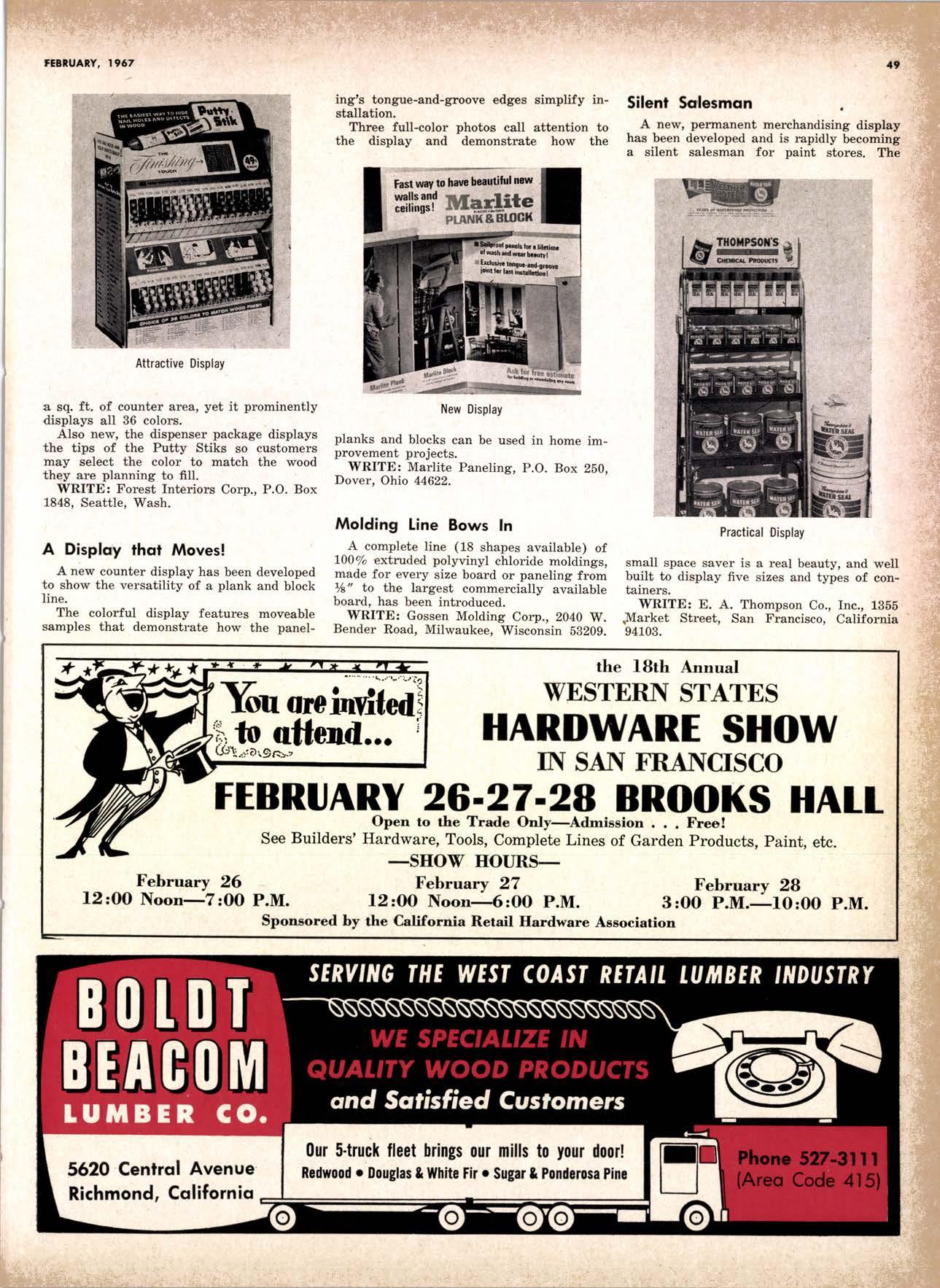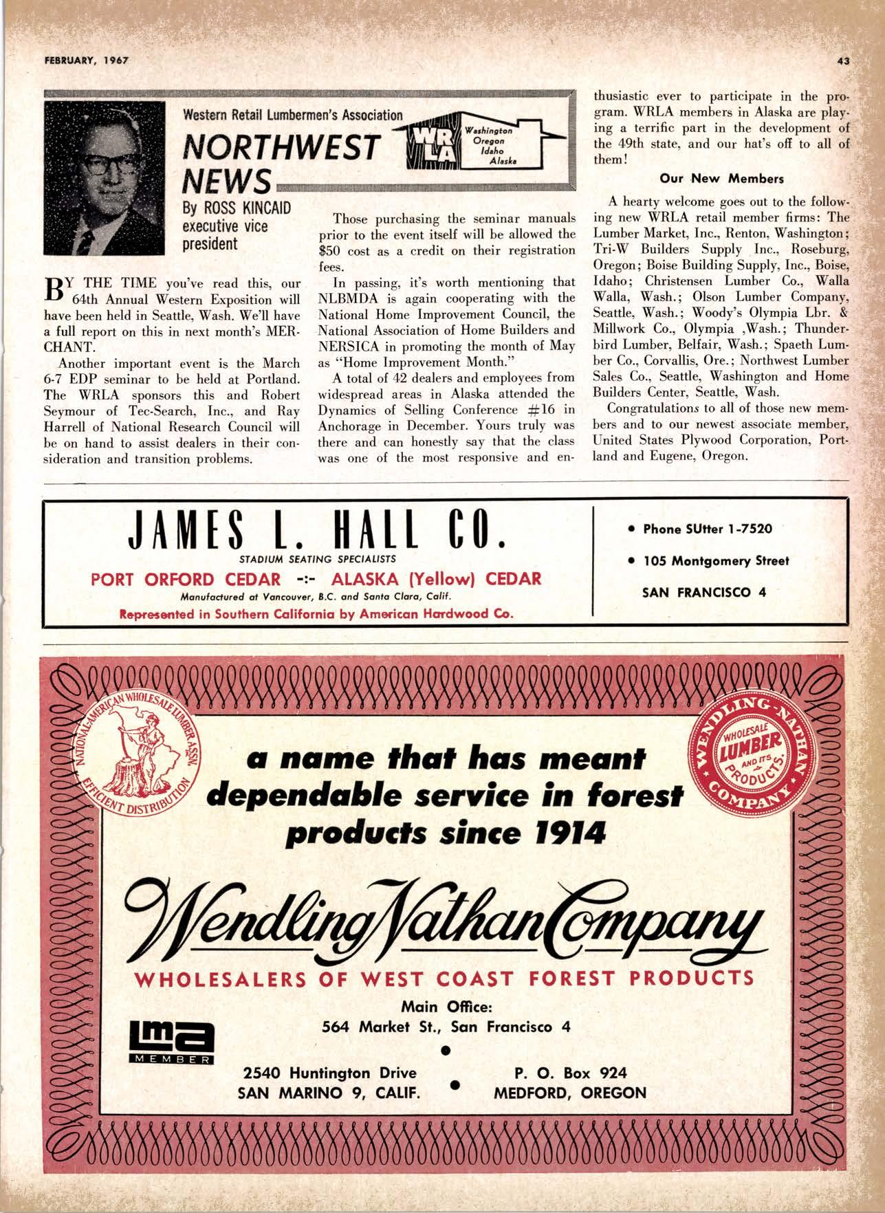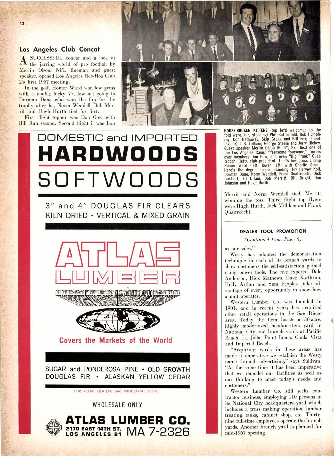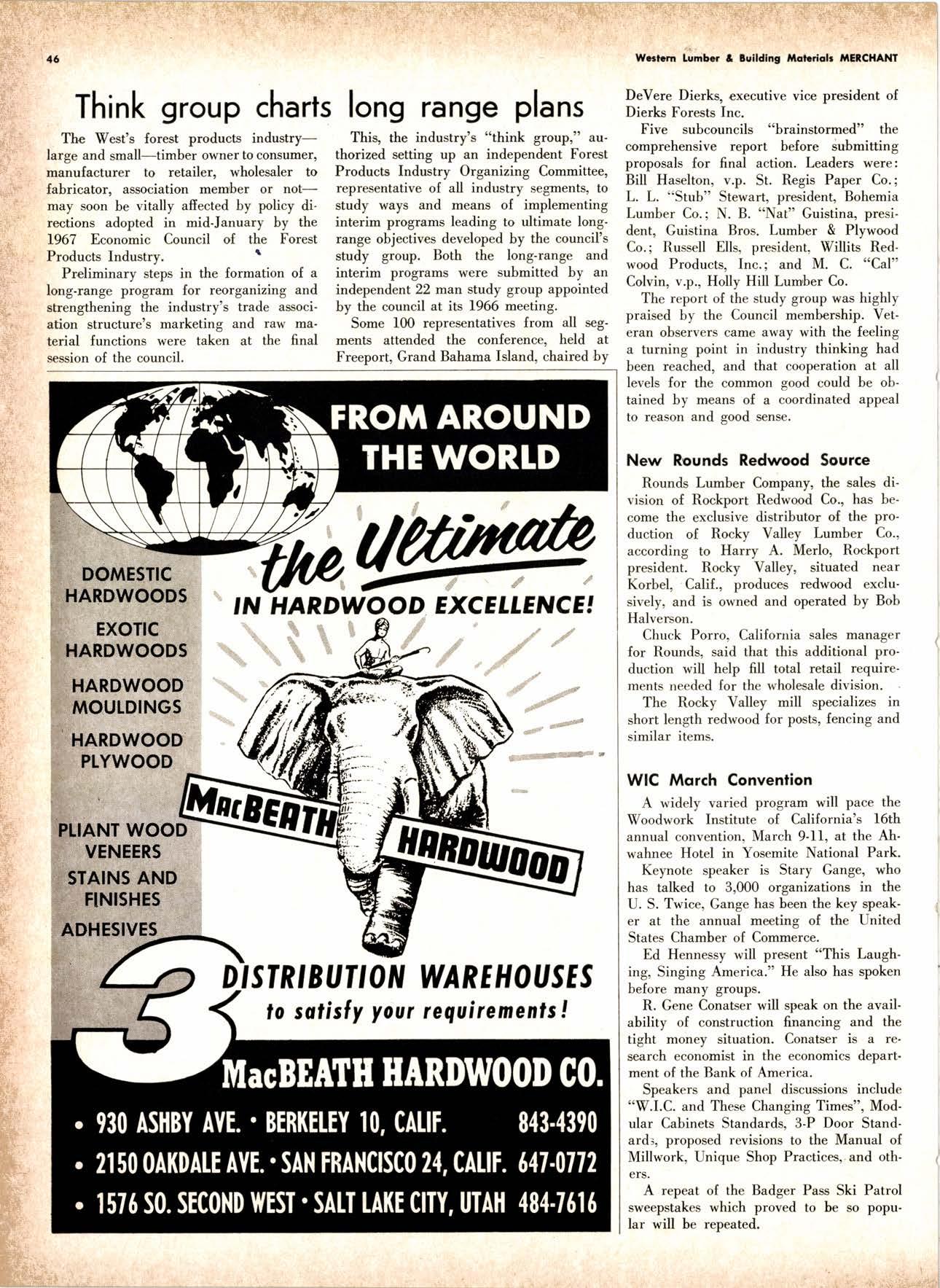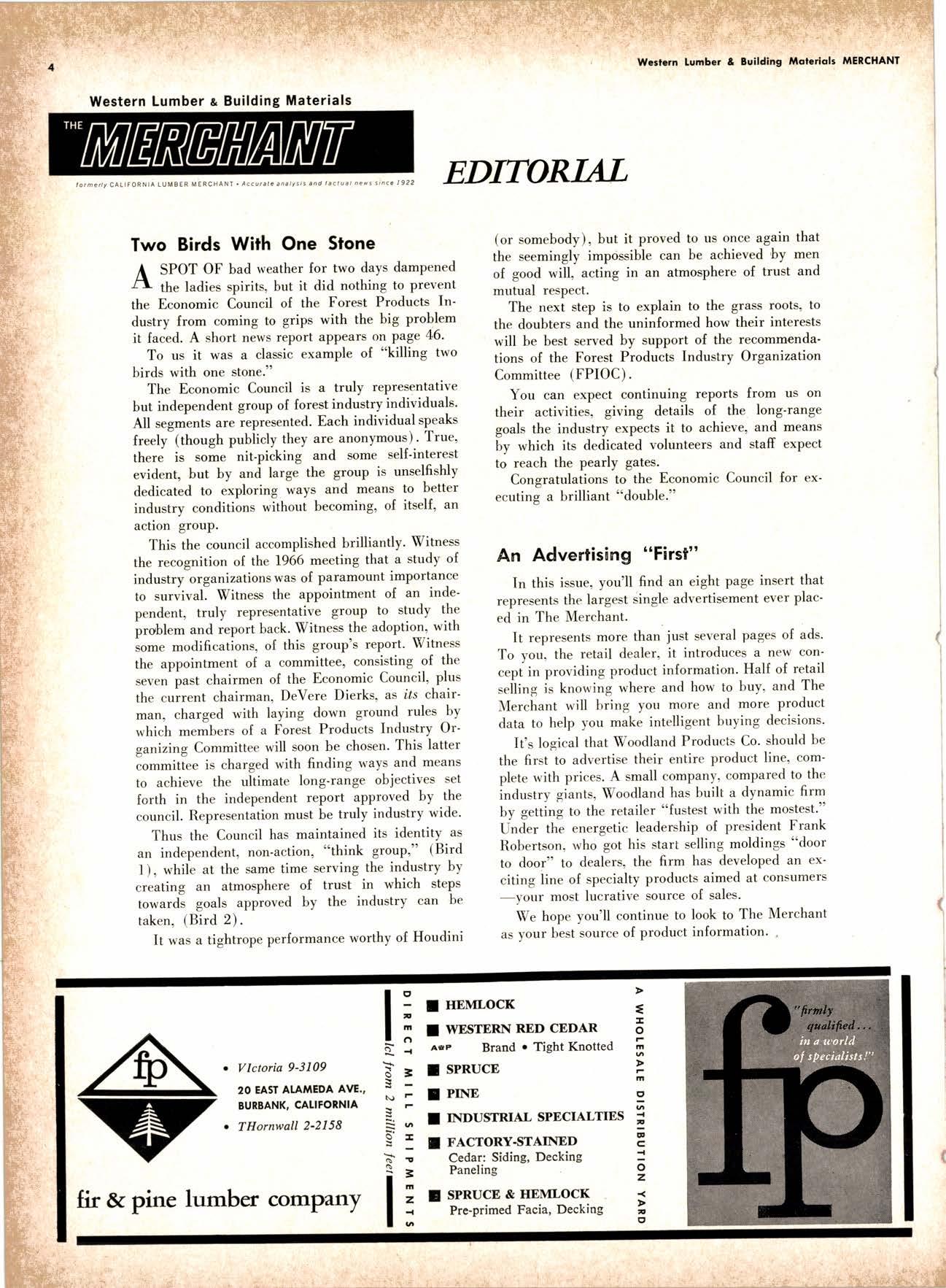 .----.-..-.--.--------.------.-.--KEtlcig 3-5326 X-D Cedor Supply Co. ----Etgin 7-1063 Kilgorc, Robert P,.--------.-..-----.---.-G[enwood 60831 Loop Lumbcr & Mill Co.----..---.--..---LAkchurst 3-5550 l|locBeolh Hordwood Co.---....-..----.-..THornwoll 3-{390 Pocific Fir Soles .......-.......-..-------....-.DAvenport 6-8864 Peerlcss [umbcr Co,...--.--.-..-..--.--.--[Ockhoven 2-Zl(X) Sowmilf Solcr Co. ----..--.--.-..-.----.6n&1 Silnorco, lnc. .....-..--.--.-.. .--153-&20 Sif morco nternolional ------..776-12@ Slondord lumber Co., Inc. ..-..........-[Andscope 66356 Sfroble lunber Compony------------TEmplebor 2-558.{ Roff Slolcscn ----DAvcnporl 7-7171 Torler, Wcbslcr & Johnson ----.-------.-SYcamorc 7-2351 Trlonglc lunbcr Co.--.-..----.-..-.--.---lAndscopr 4-9595 Twfn Horboru Solcr Co. --._-.-J4t q 327.1,gOO U.S. Plyrood Corp. (Ooklondl --.-..-TWinooks 3-d5,14 U.S. Plyrood Corp. lSonto Cloro) -..--Cllcrry 3-5286 Weslcrn Pinc Supply Co.------..--...--.OLynpic 3-7711 White Erolhers .......-.-ANdovcr l-160O Woodside Lumber Co.-..----......---.---Dlonond 3-5644 PANEI.-DOORLSASH-SCREEilS ,{ILIWOTK-IUIIDING IIATERIA15 Arlesio Door Co., Inc. (Son Jose)--.-.--......-..Gt 6-,t0g8 Coloveros Cement Co.---.--...--------.....Glcncourt l -7400 Torfer, Webster & Johnson.-------.-.---.SYcomore 1.2351 sPEClAt SEnVICES Cofif. lumber Inspection Svc.--..14081 CYpre* 7-8071 Chollenge Cook Bros.----.-- ----562-0120 Kvolheim Moch inery Co. .-.-.--...-.-..-..- -.--.(7 071 7 62-1363 Werlern Dry Kiln.-.--------- .-------521-3400 Ziel & Co. ---------------.----Yukon l-O2lO SACRAMENTO AREA TU'\ABEN Csl-Soc Lumber Soles, Inc. ..-.-------.-...t9161 187 -7847 Copilof Plywood, Inc.---..-...-------.-.-.-..---(916) 922-8861 Evonr Producfr Co, .-.-....-.--....- -----------.-4661523 Higgins tunber Co., J. E. -927-2227 King'r Rivcr lumber Corp. .----....----.-.(9161 {SS-721O Nikkef [umbcr Co., R. F. .-.--.....-----..lVon]r* 7-8675 Norlh Vollcy lumbcr Solcr .-.--------(9t61 9271201 Plocerville Lumber Co. -----------NAtionql 2-3385 , BUITDING '{ATEiIAIS Cqloveros Ccnrcnl Co. Gllbcrf 2-8991 Georgio-Pocific Worehousc --.-.---------WAbqrh 2-9631 United Slofes Plyrood Corp. ----.-.Glodrtonc l-2891 Weyerhoeuser Compony -------.-----...----FRontier l-l0OO sPECtAt SERV|CES lodi-Fob lnduslries ...-(2131 368-532,f RE}IO, NEVADA, AREA Copilol Pfywood, lnc.-.---------.-.------.....VO21 329-&;94. Donl Forerl Products, lnc. .-..---------.-.--.....323-4345 Feofher River lurnber Co. ----329-1201 U.S. Plyrcod Con. --------.-------.-....----.-...-...358-8855 ;:i:i't KENNETH W. TINCKLER MILAN A MICHIE Sto h[ I" ry,bp*'9,g,fpcr nV, 5 r.'". supprving"',,1lTffj HARDWOODS 3855 E. washington Brvd. phone: 263-6844 Requirements of the Manufacturing Ind "ljii3j'fr: SOFIWOODS 4230Bandini B,vd.phone: 282.4148 the Products of F Eve lwhere. We Would Appreciate Receiving Your lnquiries. Gustom Milling Facilities Avaitable Fast, EfficientL.C.L. Service from Both Yards, and Direct Shipments WHOtESAtE_JOBBING Timbers o Redwood Douslos & White Plywood Ponderoso & Sugor 1259 Avenue AlboDy, California LAndscape 5-1000 Brighton Fir Pine DIVI.S.ION OF HI.tI. TUMBER & HARDWARE CO., r:.i.r'gr.'4..::.i::.