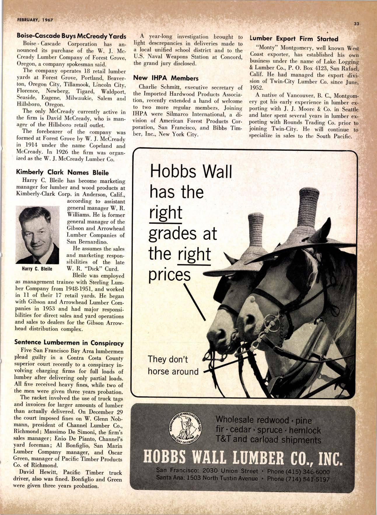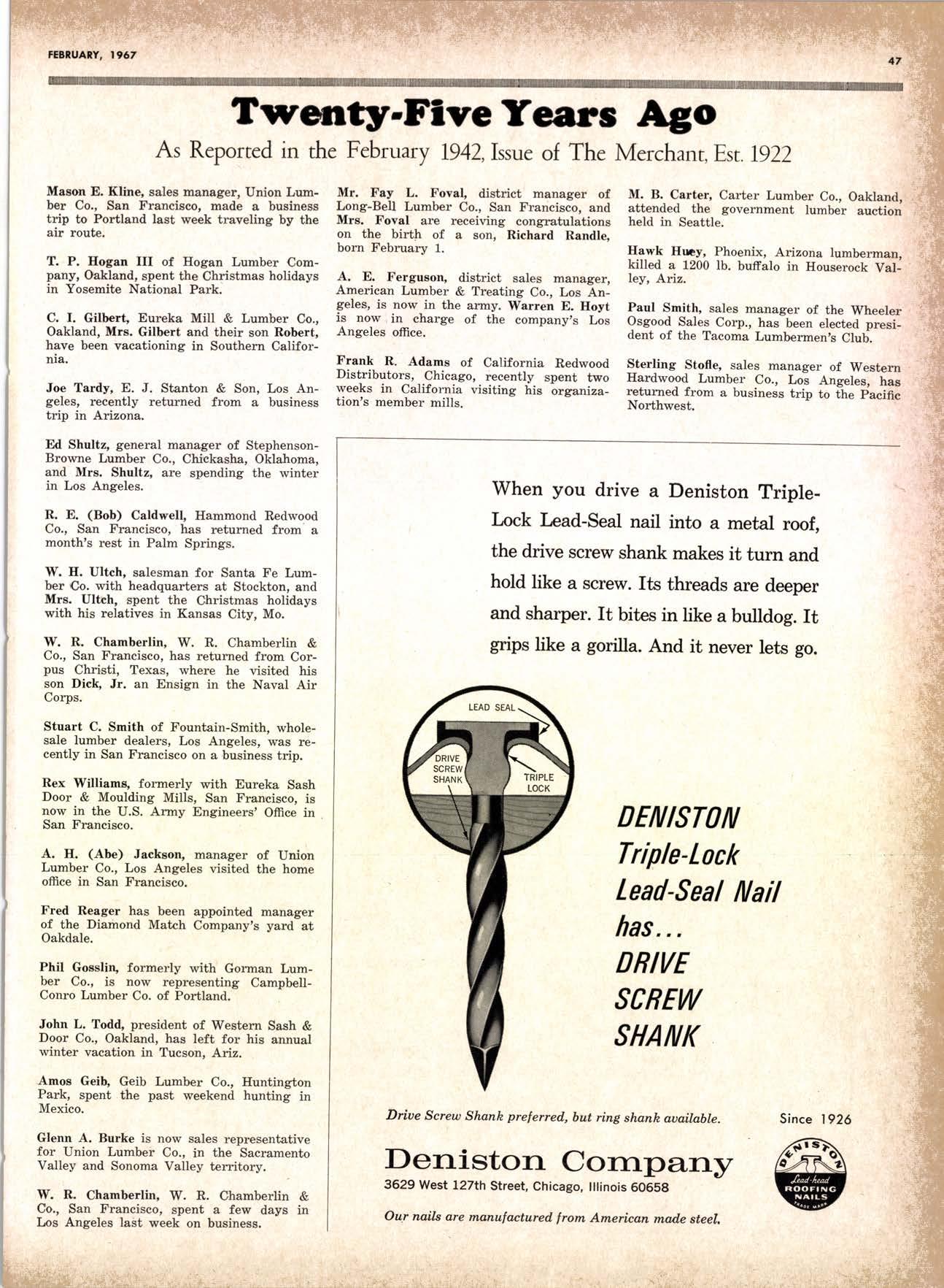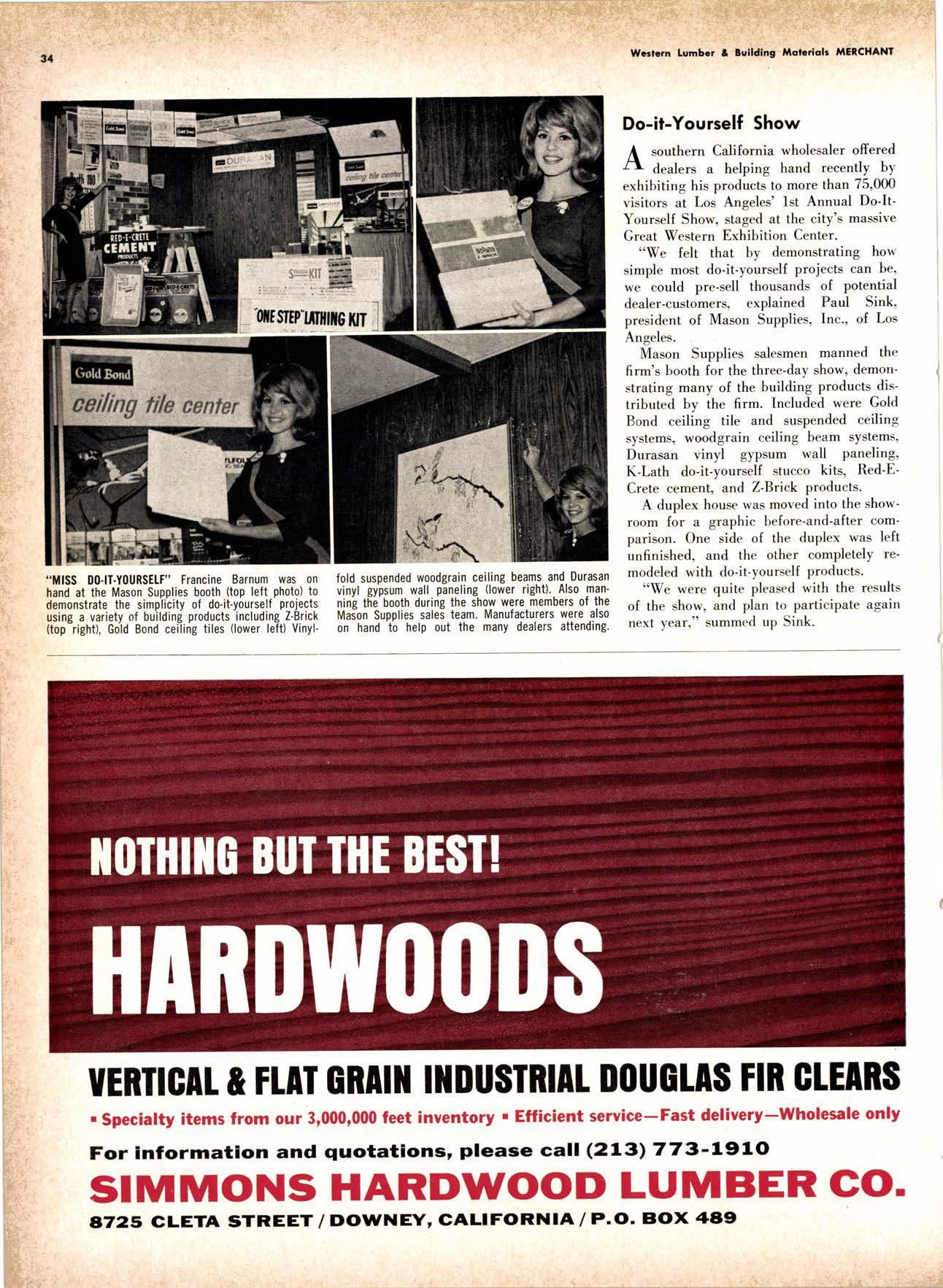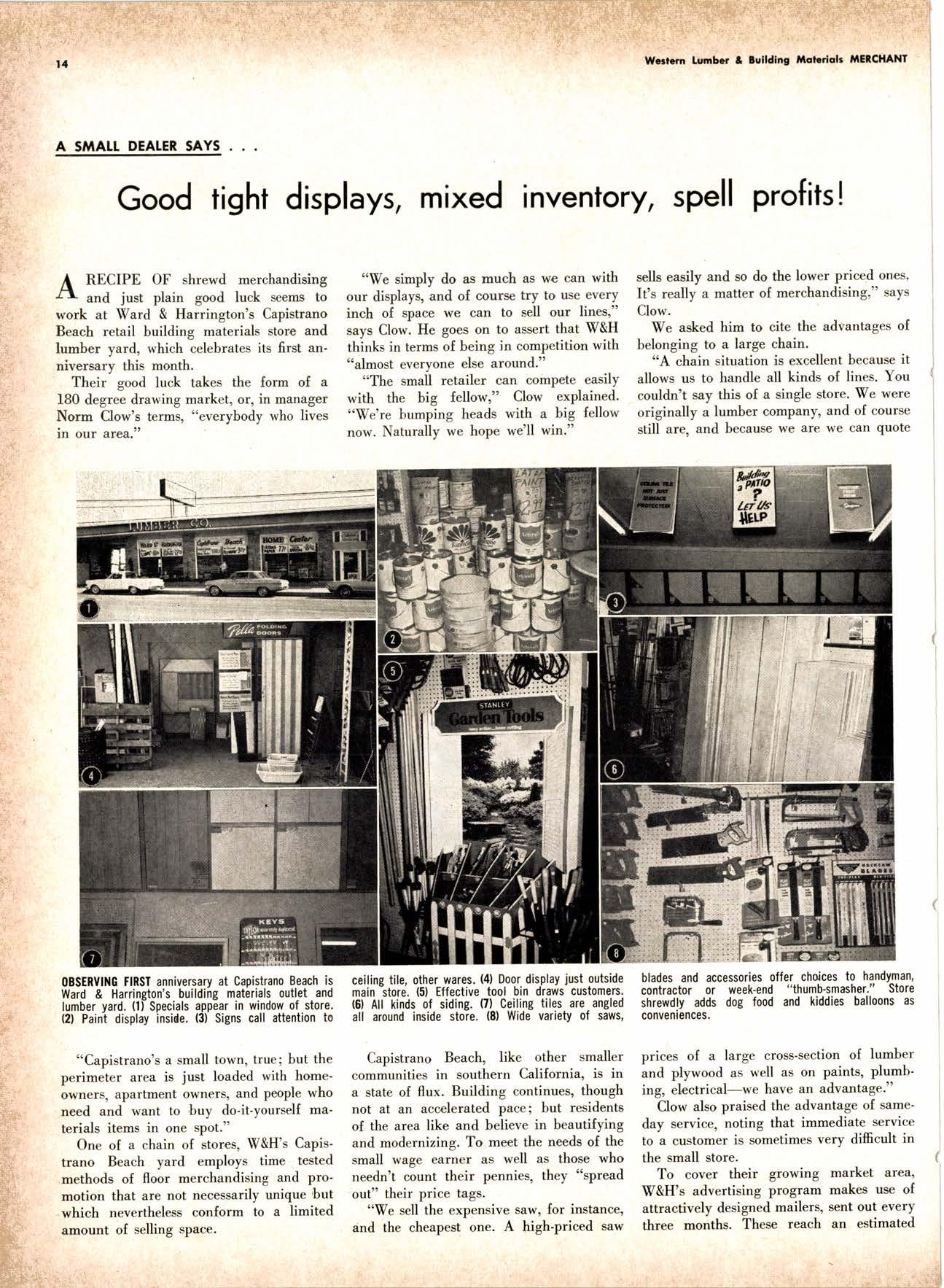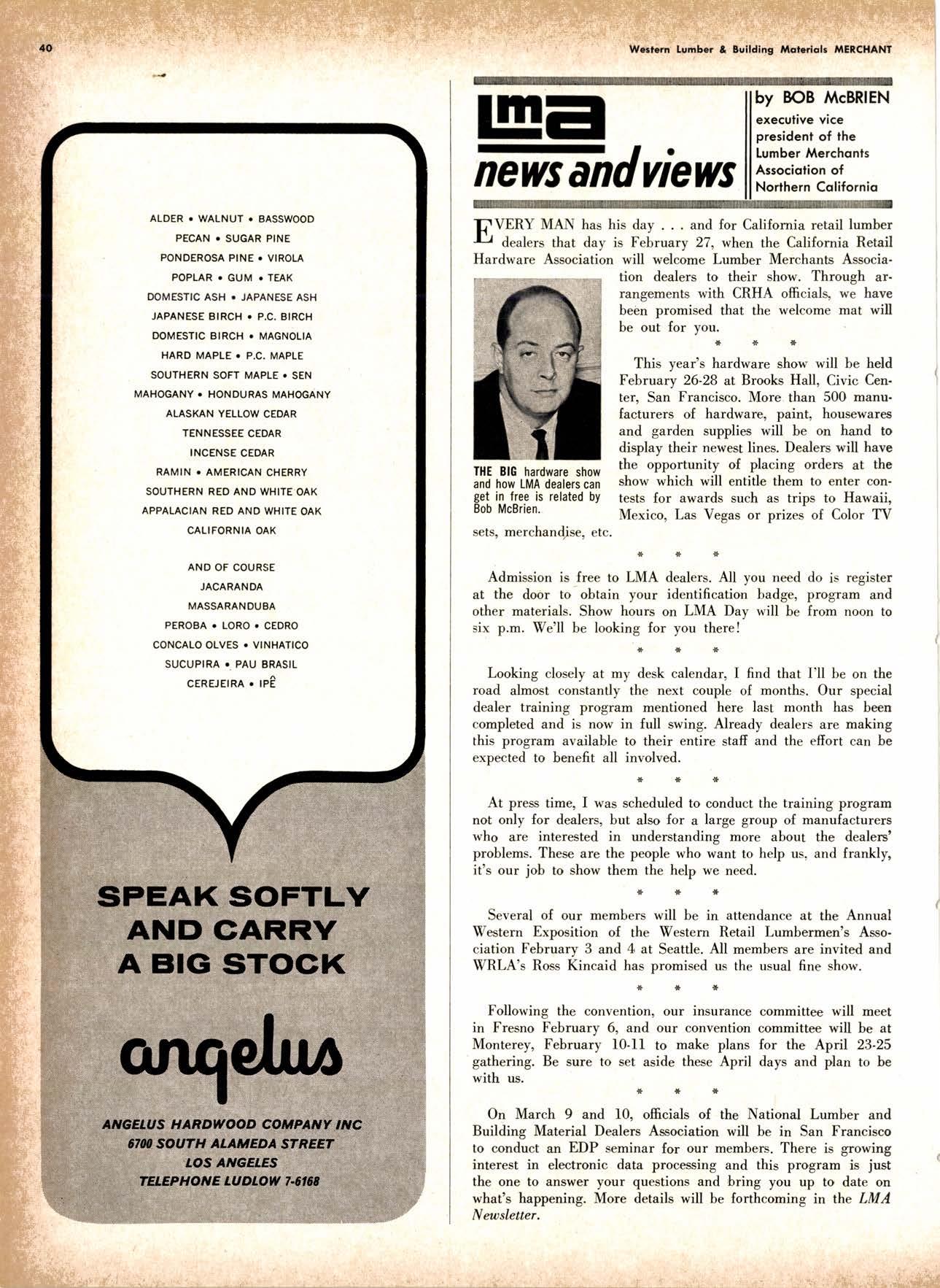 .----.-..-.--.--------.------.-.--KEtlcig 3-5326 X-D Cedor Supply Co. ----Etgin 7-1063 Kilgorc, Robert P,.--------.-..-----.---.-G[enwood 60831 Loop Lumbcr & Mill Co.----..---.--..---LAkchurst 3-5550 l|locBeolh Hordwood Co.---....-..----.-..THornwoll 3-{390 Pocific Fir Soles .......-.......-..-------....-.DAvenport 6-8864 Peerlcss [umbcr Co,...--.--.-..-..--.--.--[Ockhoven 2-Zl(X) Sowmilf Solcr Co. ----..--.--.-..-.----.6n&1 Silnorco, lnc. .....-..--.--.-.. .--153-&20 Sif morco nternolional ------..776-12@ Slondord lumber Co., Inc. ..-..........-[Andscope 66356 Sfroble lunber Compony------------TEmplebor 2-558.{ Roff Slolcscn ----DAvcnporl 7-7171 Torler, Wcbslcr & Johnson ----.-------.-SYcamorc 7-2351 Trlonglc lunbcr Co.--.-..----.-..-.--.---lAndscopr 4-9595 Twfn Horboru Solcr Co. --._-.-J4t q 327.1,gOO U.S. Plyrood Corp. (Ooklondl --.-..-TWinooks 3-d5,14 U.S. Plyrood Corp. lSonto Cloro) -..--Cllcrry 3-5286 Weslcrn Pinc Supply Co.------..--...--.OLynpic 3-7711 White Erolhers .......-.-ANdovcr l-160O Woodside Lumber Co.-..----......---.---Dlonond 3-5644 PANEI.-DOORLSASH-SCREEilS ,{ILIWOTK-IUIIDING IIATERIA15 Arlesio Door Co., Inc. (Son Jose)--.-.--......-..Gt 6-,t0g8 Coloveros Cement Co.---.--...--------.....Glcncourt l -7400 Torfer, Webster & Johnson.-------.-.---.SYcomore 1.2351 sPEClAt SEnVICES Cofif. lumber Inspection Svc.--..14081 CYpre* 7-8071 Chollenge Cook Bros.----.-- ----562-0120 Kvolheim Moch inery Co. .-.-.--...-.-..-..- -.--.(7 071 7 62-1363 Werlern Dry Kiln.-.--------- .-------521-3400 Ziel & Co. ---------------.----Yukon l-O2lO SACRAMENTO AREA TU'\ABEN Csl-Soc Lumber Soles, Inc. ..-.-------.-...t9161 187 -7847 Copilof Plywood, Inc.---..-...-------.-.-.-..---(916) 922-8861 Evonr Producfr Co, .-.-....-.--....- -----------.-4661523 Higgins tunber Co., J. E. -927-2227 King'r Rivcr lumber Corp. .----....----.-.(9161 {SS-721O Nikkef [umbcr Co., R. F. .-.--.....-----..lVon]r* 7-8675 Norlh Vollcy lumbcr Solcr .-.--------(9t61 9271201 Plocerville Lumber Co. -----------NAtionql 2-3385 , BUITDING '{ATEiIAIS Cqloveros Ccnrcnl Co. Gllbcrf 2-8991 Georgio-Pocific Worehousc --.-.---------WAbqrh 2-9631 United Slofes Plyrood Corp. ----.-.Glodrtonc l-2891 Weyerhoeuser Compony -------.-----...----FRontier l-l0OO sPECtAt SERV|CES lodi-Fob lnduslries ...-(2131 368-532,f RE}IO, NEVADA, AREA Copilol Pfywood, lnc.-.---------.-.------.....VO21 329-&;94. Donl Forerl Products, lnc. .-..---------.-.--.....323-4345 Feofher River lurnber Co. ----329-1201 U.S. Plyrcod Con. --------.-------.-....----.-...-...358-8855 ;:i:i't KENNETH W. TINCKLER MILAN A MICHIE Sto h[ I" ry,bp*'9,g,fpcr nV, 5 r.'". supprving"',,1lTffj HARDWOODS 3855 E. washington Brvd. phone: 263-6844 Requirements of the Manufacturing Ind "ljii3j'fr: SOFIWOODS 4230Bandini B,vd.phone: 282.4148 the Products of F Eve lwhere. We Would Appreciate Receiving Your lnquiries. Gustom Milling Facilities Avaitable Fast, EfficientL.C.L. Service from Both Yards, and Direct Shipments WHOtESAtE_JOBBING Timbers o Redwood Douslos & White Plywood Ponderoso & Sugor 1259 Avenue AlboDy, California LAndscape 5-1000 Brighton Fir Pine DIVI.S.ION OF HI.tI. TUMBER & HARDWARE CO., r:.i.r'gr.'4..::.i::.