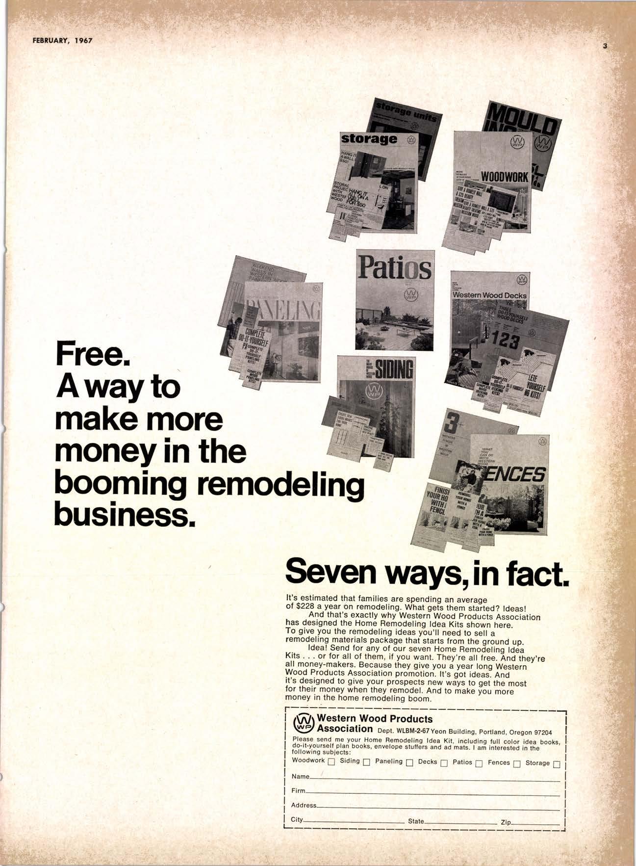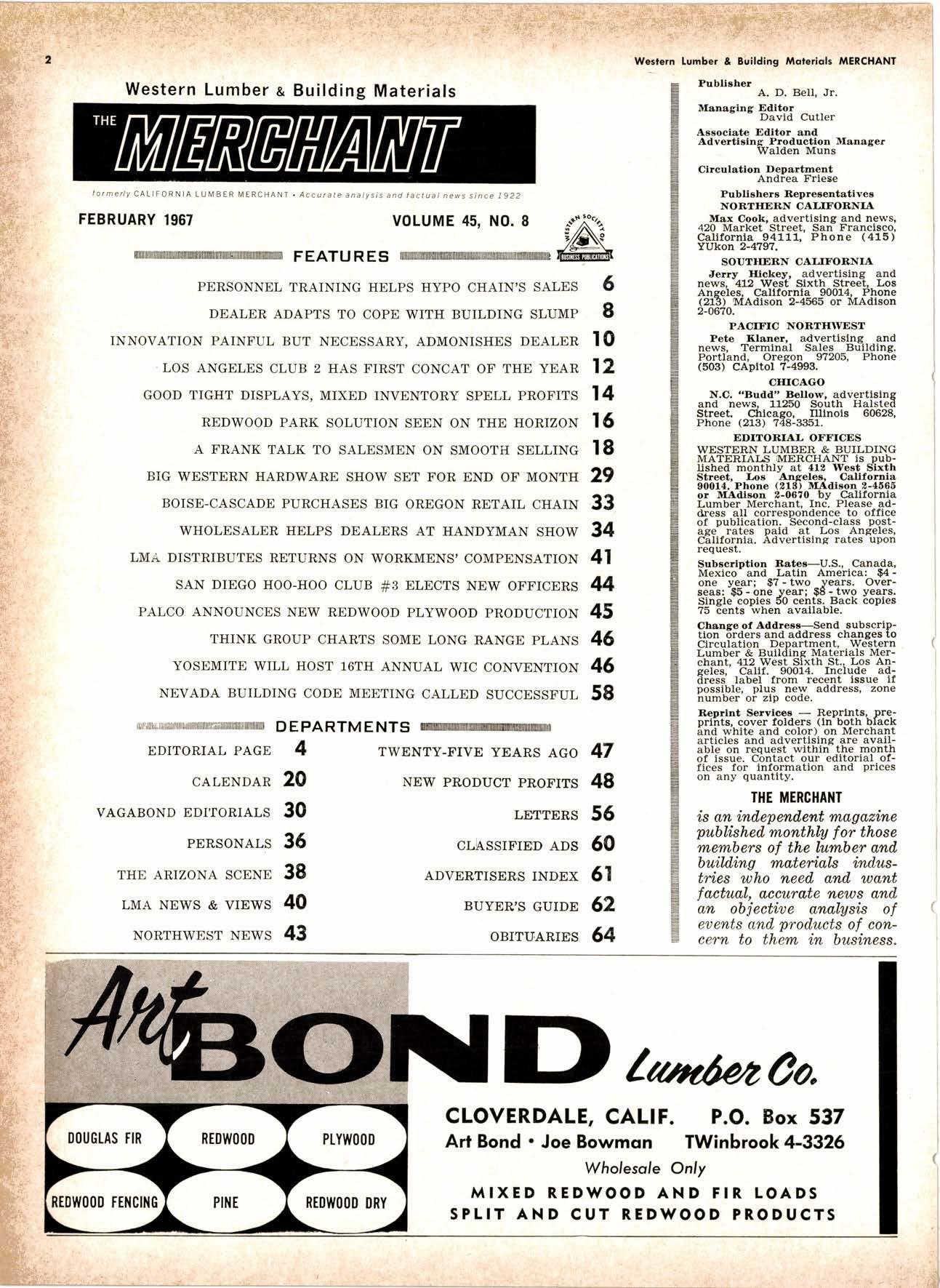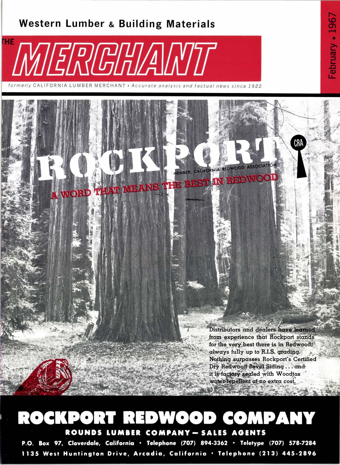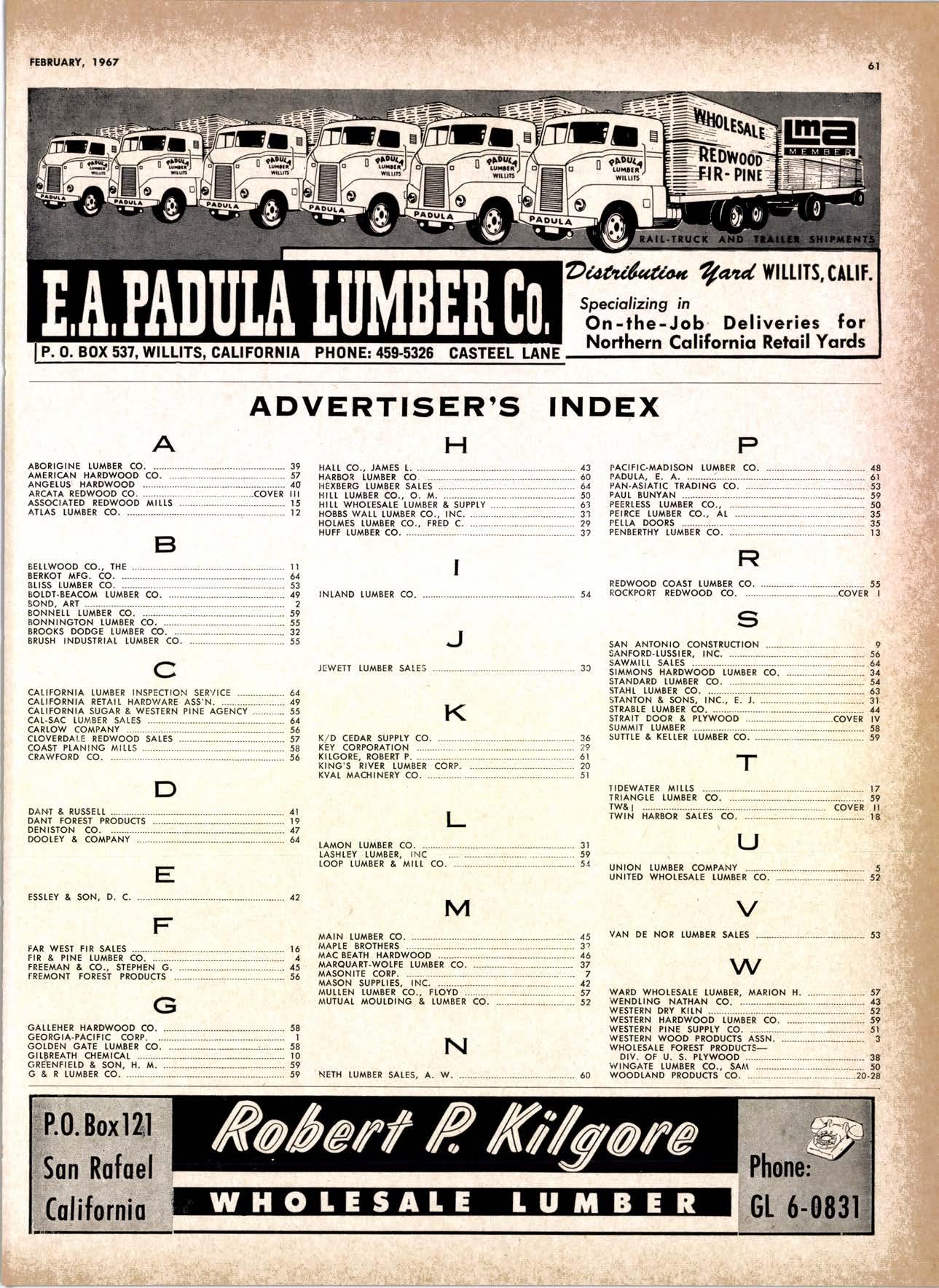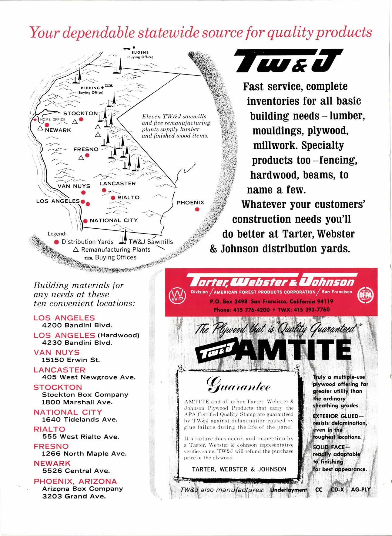 Bunyon Lumber Co. ....365-2771 AUBERRY King's Rivcr lumbcr Corp. ..--.-------------(2091 855-2522 BAKERSFIETD Georgio-Pocific Worehouse.--.---- --.----F Airview 7 -777'l U. S. Pfywood Corp. .-.----.---------..-...-.tAiwiew 7-7736 CALPEttA F. M. Crowford Lumber, Inc. .--.-.-------.VO7'l 185-8756 Western Lumber & Building Moleriols MERCHANI CTOVERDAIE Arl Bond Lumber Co. .---.-...-.--.-.-..Twinbrook 4'3326 Cfoverdofe Redwood Soles ....-....------l707l 894'2615 G & R tumber Co. .----....------.-----.-.-TWinbrook 4'2248 KinTon Lumber Co. .-..----.-.-.--..-----TWinbrool 4'2588 Rounds [umber Compony --.---........-.TWinbrook 4'3362 Wingole Lumber Co., Som --------..------- -17O7'l 891'5621 CORNING crone Miffs --19161 824-5427 EUREKA Reid & Wrisht, Inc. --------.------..---------(2091 443-6769 Tidewof er Mi f s ..---.---------------------V 07 | 443'089 | Twin Hqrbors Sqlcs Co. -------.--..----------(70n r',13-70E2 Von De Nor Lumber Soles ------.-.-----------l707l 443-3031 FORT BRAGG Aborigine Lumber Co. -----.---.---.-------.YOrktown 4-40O1 Holmes lumber Co., Frcd C. .----..-.-YOrktown 4-4058 FRESNO Evons Producls Co. .-----------...-- ----------------------266-8245 Georgio-Pocific Worehouse .---.-..--------AMhursl 8-6191 lnt'l Poper Co. ([on9-Bell Div.]----.-.-.-.---(2091 229-3Or6 Norfh Volley tumber Soles ...----.-.--.---(2091 439'1765 Reid & Wright, Inc'---------------.--...----(200) 222'7745 Selmo Grope Stoke Yord & Pressure Treoting Co. .-.-...-.-.-...-----------...-.-.-..(2O91 896-l 234 Torler, Websler & Johnson, Inc. .-..---C[infon l-5031 U.S. Plywood Corp. .-...--..-..--.--.-.....-.-AMhurst 6-8121 MODESTO Pof e Buildings, Inc. -...---...-.---.-.--.-.-...-----(2091 524'7941 REDDING Moin lumber Co. --.--------------.--.....-.-----------..-.-.241 -l 352 North Volley lumber Soles...- 213'4025 SIOCKTON Evons Producfs .-------.-HOword 6-4523 stockton Box co. -__-....---.-_-464-8361 Torfer, Websler & Johnson 4U-8361 UKIAH Redwood Coost Lumber Co.-.....------------(7On 462'8607 Word Whofesole lbr. Co., Morion H. ----------462-7254 WEED nt'f Pqperll,ong-Bell Div..-..--..-...-.---.---.(916) 939'4441 wttuA^ s Son Anlonio Conslruclion Co. --.----------(91 61 473-5381 wttuTs Podulo Lumber Co. .-.---.-----..-.. ---,-------------------459-5326 Willits Redwood Producls Co..--..-.----.----(7071 159-559 5 OREGON BEND Brooks-Sconlon --.----.EVergreen 2-251 I coRVAtUS Con-Fob Equipmenl Co. .-..--.-..-.---.--..-..(5031 7 52-2955 EUGENE Fremonl Foresl Producls .-..-----------.----Dlomond 3-9257 Afberl A. Kef ley Co. ----1503', 313-4121 Pocifi c Fir Soles..-.-..----.--.----.--.-..------Dlomond 5-0154 U.S. Plywood Corp. ---------.---......-Dlomond