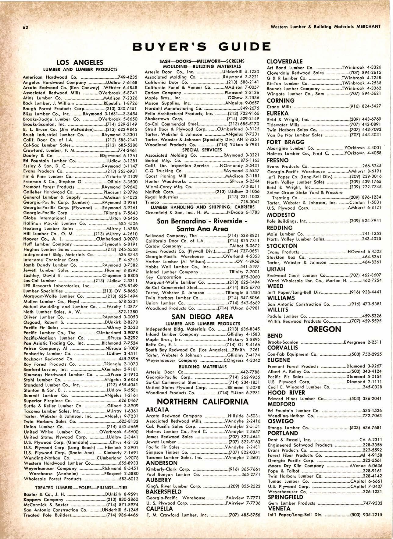 Corlow Compony --------------.....-------TAlbol 5-0672 Evons Producls Co. (Plywoll Div.)...-."..--(7141 737-0651 Georgio-Pocific Worehouse -..---......OVerlond 4-5353 Horbor Lumber (Al Wilson).-.----.-..-.....----.OV 4-8956 Hobbs Woll [umber Co., Inc.--.--..-....-----------.541-5197 Inlond Iumber Compony .--.......-.....----.-TRinity 7-2001 Key Corporofion ...--------------...--...-...-.-------..--87 5-2060 Morquorl-Wolfe tumber Co. ---------------.(21 3) 625-1 494 So-Cof Commerciol Sleel---------- -.-----------17 | 41 825-677O Torler, Webster & Johnson .-------------TRiongle 5-1550 Twin Horbors [umber Co.-------.----.---------17 | 41 547 -8086 Union Iumber Co. --.------.--.------ ------------.(7 | 41 542-5669 Woodf ond Products Co. ----------------l7l 4l YUkon 6-798 | SAN DIEGO AREA LUMBEN AND LUMBER PRODUCTS Independent Bldg. l'{oleriols Co, .-.----(2131 636-8345 Inlond tumber Compony -.----------------GRidley 4-1583 Mople Bros., Inc. ...--.-.-----......-.----..Hlckory 2-8895 Reitz Co., E. L, .-_---.-.------..----.--.(7141 GL 9-4166 Soulh 8oy Redwood Co. (tor Angeles)----ZEnith 2261 Torter, Websler & Johnson .----------------GRidley 7-4174 Weyerhoeuser Compony --------------..COngress 4-3342 BUITDING MATERIATS Artesio Door Co..----------.------------....---.--..-----.442-7799 Georgio-Pocifi c Corp. ----------------.---17 1 41 262-9955 So-Col Commerciql Steel---.--.-----------------171 41 234-1 851 Uniled Stotes Ply*ood Corp. -.--...--. .-BElmont