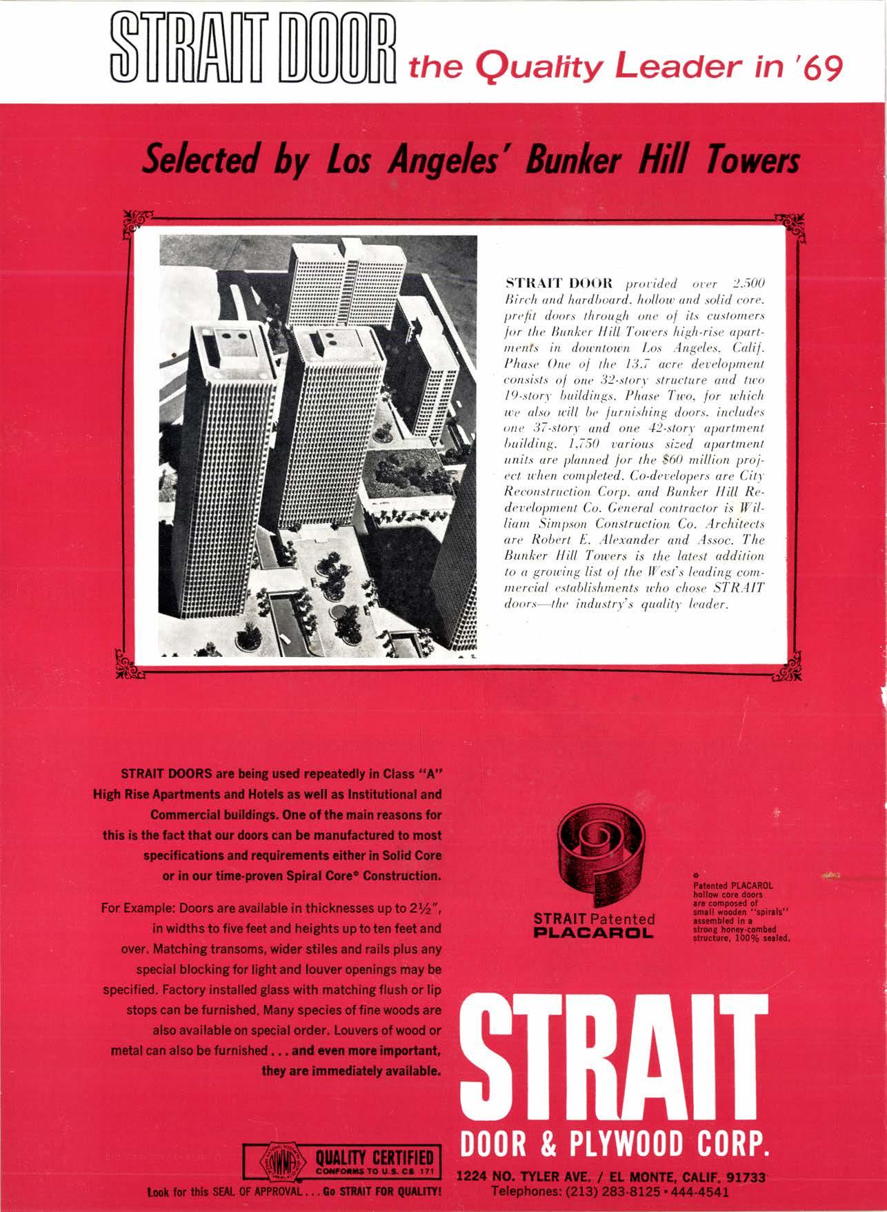 STRAfT D(X)R protided or(r 2.;00 lJirch und lrardlrourd. lttllou'urtd solid rore, praltt doors throug,h ottc ol its cu.slrtrners Ior the llunker H ill 'l'ou'ert hig,h-rise upartntents irr dou,ntou'rt Itx -lngele,s- Lalii Ithuse Ona ol the l,i.t acre detelopment ctrnsts/s ol one 32-story struclure und tu'o l9-slory buildittgs. Phase 7'u'o, ior u'hiclt ute alxt u'ill lx, jurni.:hing tloors- includcs ttrte 37 -stor1' und one 12-story uparttnctll ltuilding. 1"750 t'urious si:ed apurtntenl units ure plurtned lor the $60 ntillion project u'hen, uttnltleted. Co-detclopers ure CiIv Recortstructiort Cc,rp. and Bunker IIill Redet'clopntenl Co. Oeneral ('ontraclor is W il liant Simltson Construction Co. .lrchitects are Robcrt E. "llexander and ,lssoc. The Bunker llill Tou,ers is thL: latcst additiort to rt grottirtg list ol the ll'cst's leuding comntercittl estublishntents u'ho chose STR.llT doors-1ha industry's qmlity leader.