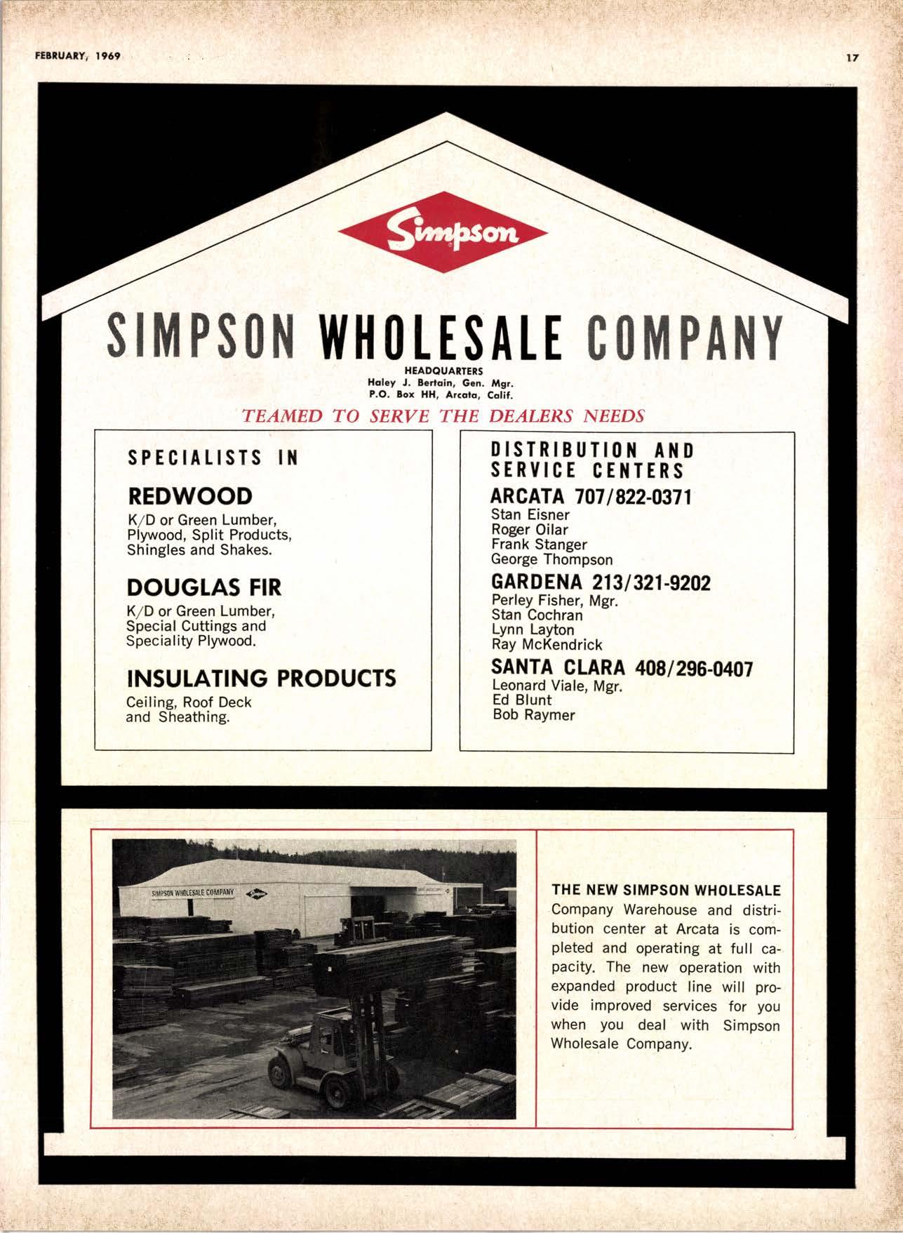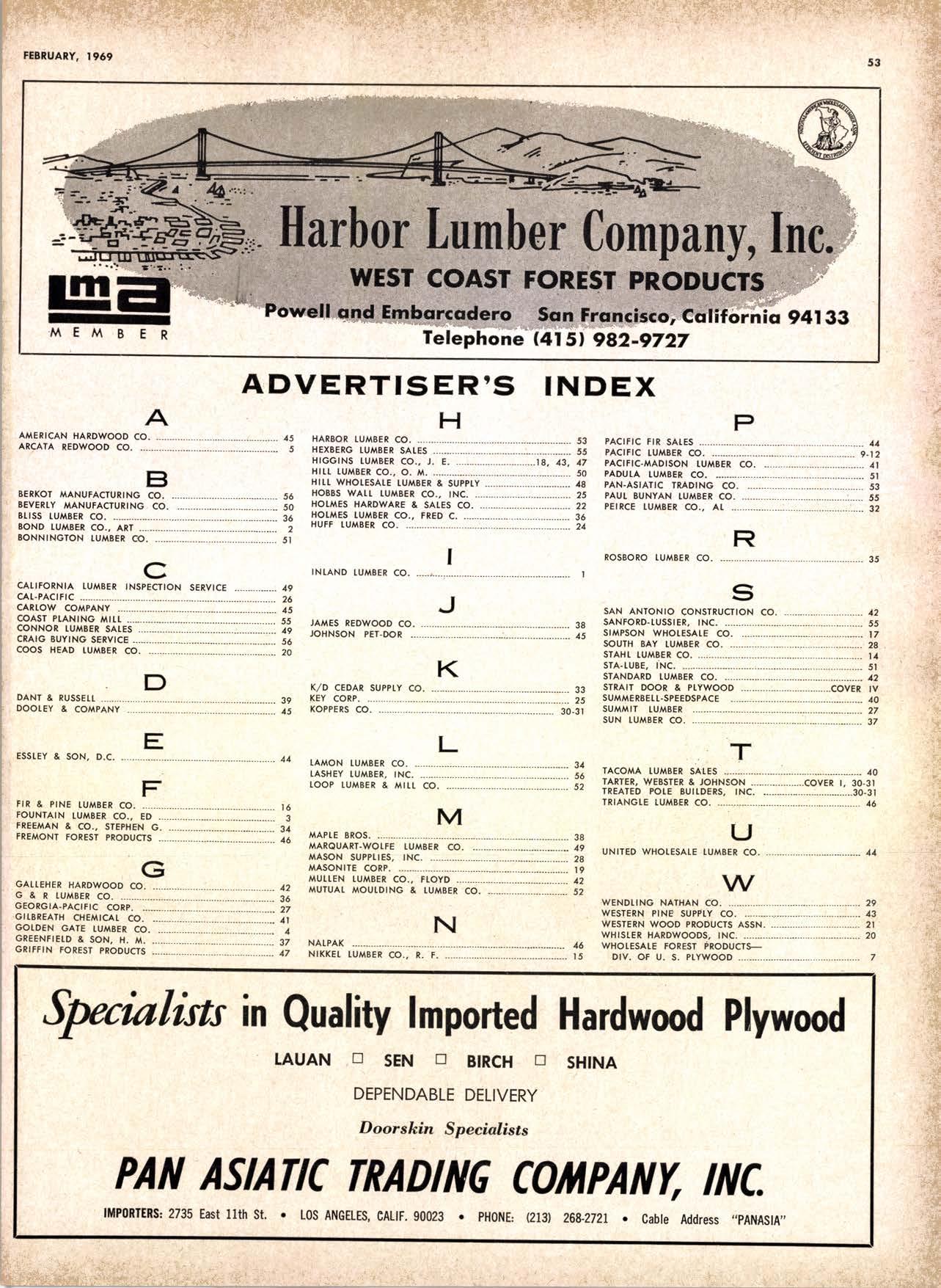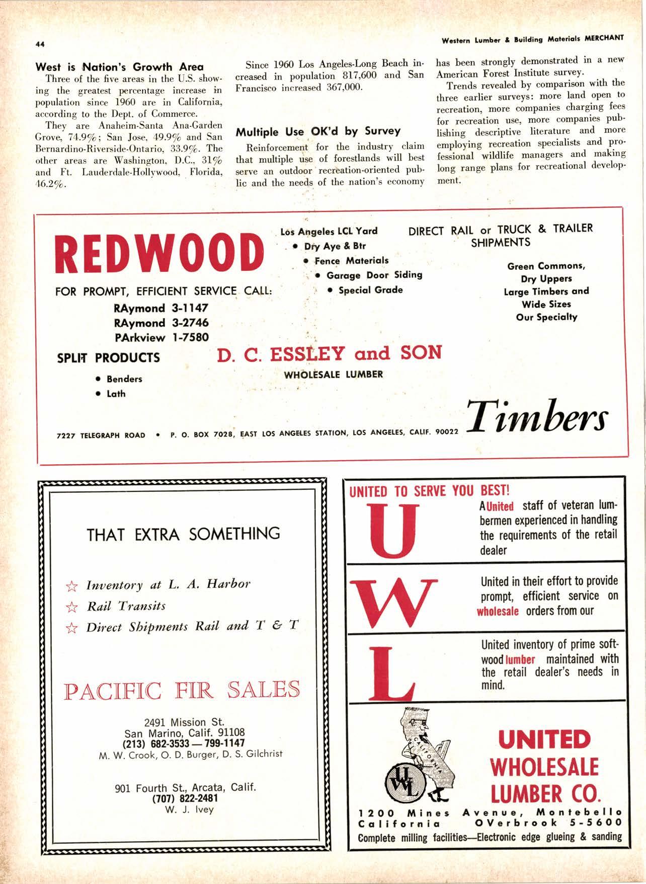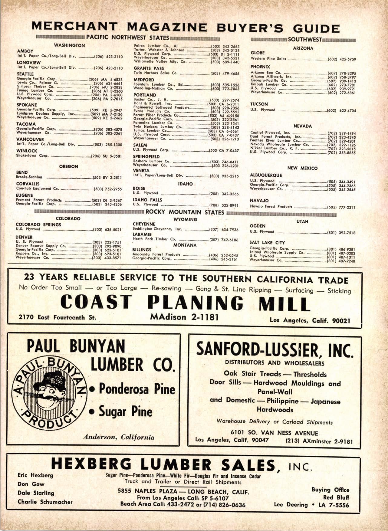 North Po.k Tinber Co, -.._-._._...-(3071 742-6186 MONTANA BtTUNGS Anocondo Forsl Producti .----...-----....--...-(,tO6l 252-0545 Georsio-Pocific Corp. ..--..-.-.---....---.......----.inooi 245_ai61 lll||llllj||illlllI|llllll|]|llll|illll||lll|ll|l|iliir5oUTHwESTtttruumrumurruunmm ARIZONA GTOBE Weslorn Pine Solq --.-.--.._._-..-.._.......-,-.-.....(602) 125-5759 PHOENIX Arizono Box Co. ......-.-.-.._....-...--..-.-.-.-.-----.(602) 279-8295 A.izono Millwork, Inc. ...---.-----._-...-------.--.-(602) 2SB-3197 Gorgio-Pociflc Co. .------....-..-..--.-.-..-.-....-{6OZl 939-t/il3 Koi5ob Iumber Co. .-..---...-.--..----..--.--------.(602i 273.2281 U.S. Prywood ...........--.ioOzi CTC.CZZT Weyerhoeusor Co. ..........-........... --.--...--....-.16}il 272_6961 TUCSON U.S. Plywood 622-1701 UTAH OGDEN U.S. Plywood .............-..(8Otl 992_7itg SATT IAKE CITY Geors.io.-Pocific Corp. ..-.-_--__.-_--___._-.--(gOl ) 1g6.92g1 Inlond.Whotesote Suppty Co. _-._..__......ieOti tg7-OaO3 .u.J. r.ryw@o .:.____..-.._...-....._._....._......--(801 ) /t8Z_l 3l I woyerhoeuser Co. ........-.-.._....--....-.-.-----...-.(801 ) 197-2248 NEVADA Copitol Plywood, Inc. ....-.-..------_..---------(7021 32q-1191 Dont Forcsf Producrs, Inc..........._._.._._...iZOZi 323./t3t5 Foother River tumber co....-_..._..._..__...izozi Szg.fiOt Nevodo Wholesole Lumber Co. --__------izOzi 929-1i26 Nilkel f.unber Co., R. F. .-------.........-......,702) 323_59t5 U.S. Plywood Corp. ...-....--.-..-.....--.-------.-.-l7O2l 358-8855 NEW '\AEX|CO ATBUQUERQUE U.S. Plywood ......--......(505) 344-3it9l G..oreio-pocific Corp. .......-..-...-_--._._-...._isosi 311_2g65 weye.hoouser Co. .-.-.-._....-..-......-...-.......-...(505) 315_2545 NAVAJO Nqvoio Forert Products .-.......-..--. -...---.---.-..(SO Sl 777 _221 | 23 YEARS RELIABLE SERVICE TO THE SOUTHERN CALIFORNIA TRADE No Order Too Smollor Too LorgeRe-sowingGong & st. Line Rippingsurfocingsticking PLANING MAdison 2-l t8t Mltt Los Angeles, Colif. 9002I COAST 2170 Eost Fourteenth St. PAUI BUNYAN TUMBER CO. o Ponderosa Pine o Sugar Pine Anderson, Calilornia SA}IFORD.IUSS!ER, INC. DISTRIBUTORS AND WHOLESALERS Ook Stoir TreodsThreshotds Door SillsHordwood Mouldings ond Ponel-Woll ond DomesticPhilippineJoponese Hordwoods Worehouse Delivery or Cqrlood Shipmenls 6101 50. VAN NESS AVENUE los Angeles, Cqlif. 9OO47 (213) AXminster 2-9lgl HEXBERG LUfffBER SALES, rNc Eric Hexberg Sugar Pine-Ponderosa Pine-White Fir-ltouglas tir and Incsnso Cedar Don Gow Dole Storling Chorlie Schumocher Truck ond Troiler or Direct Roil Shipments ssss NAPtEs PEA:-GBEAcH, cAuF. From Los Angeles Cqll: Sp 5-6107 Beqch Areq Coll: 433-2472 or l7t41926-0696 Buying Oftce Red Blufr lee Deering . [A 7-5556