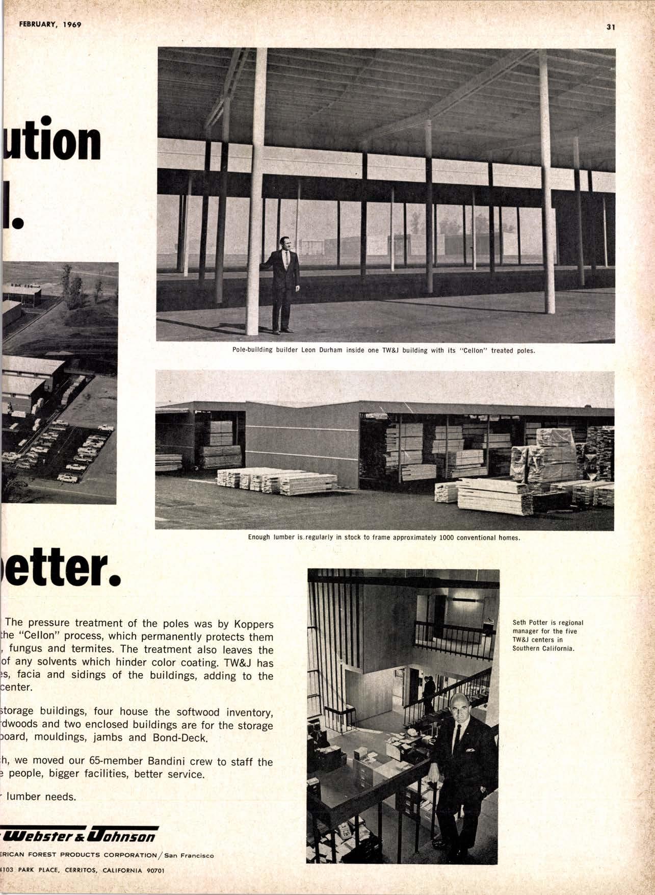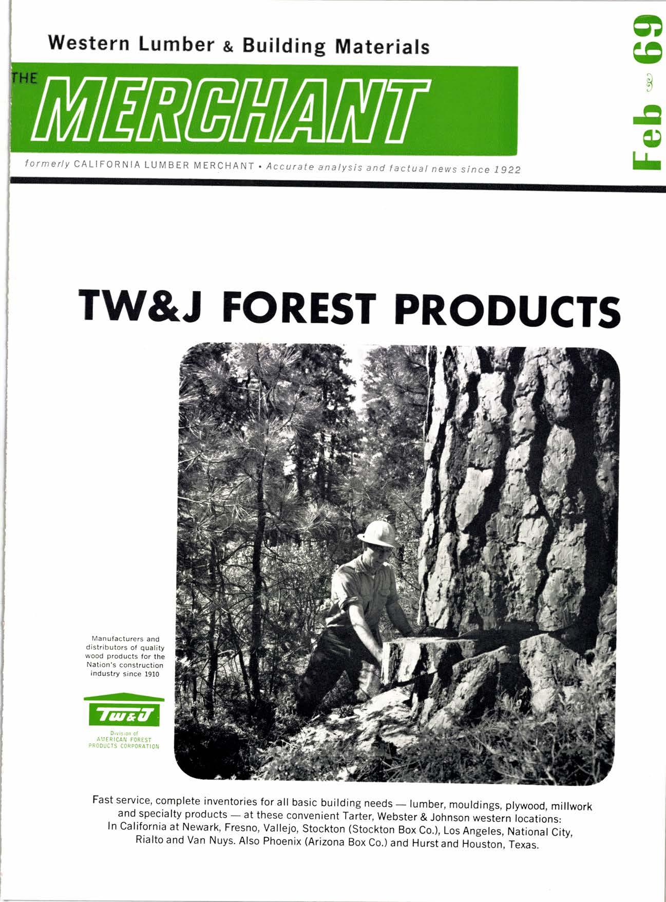 tR ta Western Lumber a Building Materials f ormerly cALIFoRNIA LUMBER MERcHANT Accurate a'nalysis and f actual news since 1922 A atJ cg 5 a I ol* TW&J FOREST PRODUCTS Manufacturers and distributors of quality wood products for the Nation's construction industry since 1910 -r Divisron of AIIIERICAN FOREST PROOUCTS CORPORATION Fast service, complete inventories for all basic building needslumber, mouldings, plywood, millwork and specialty productsat these convenient Tarter, Webster & Johnson western locations: In California at Newark, Fresno, Vallejo, Stockton (Stockton Box Co.), LosAngeles, NationalCity, Rialto and Van Nuys. Also phoenix (Arizona Box Co.) and Hurstand Houston, Texas.