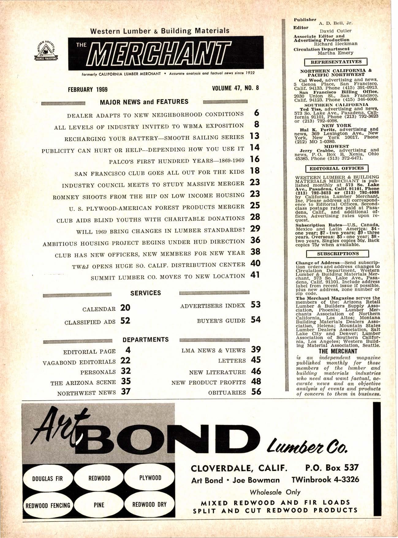 SUMMIT LUMBER CO. MOVES TO NEW LOCATION SERVICES 20 52 DEPARTMENTS 4 22 32 35 37 6 8 r3 14 r6 I8 23 23 25 28 29 36 38 40 4l ADVERTISERS INDEX 53 BUYER'S GUIDE 54 CALENDAR CLASSIFIED ADS EDITORIAL PAGE VAGABOND EDITORIALS PERSONALS TIIE ARIZONA SCENE NORTHWEST NEWS LMA NEWS & VIEWS LETTERS NEW LITERATURE NEW PRODUCT PROFITS OBITUARIES 39 45 46 48 56 lomrrly cAlltolNtA lur 8ER TIilCHANT AGflFt. onalfsit qnd loasol mwr cinq 1922 ' \'- ,1 ;, ,.i r:.u.,- :!iil{. .? Publlslrer A. D. Bc'll' Jr.