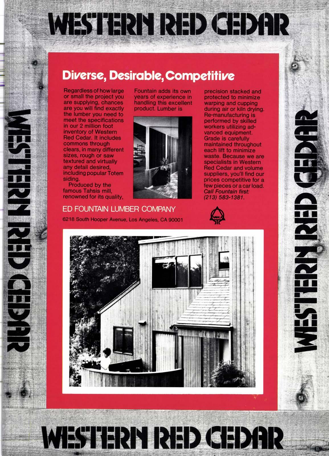 One wholesaler who has had excellent results with western red cedar is Ed Fountain Lumber Company, Los Angeles, Ca. The company normally stocks from l-l/2 to 3 million feet in various grades and patterns. Over the past several years, Fountain has developed many techniques for drying, milling and processing the lumber to minimize downfall and provide customers with economical specified widths and lengths.