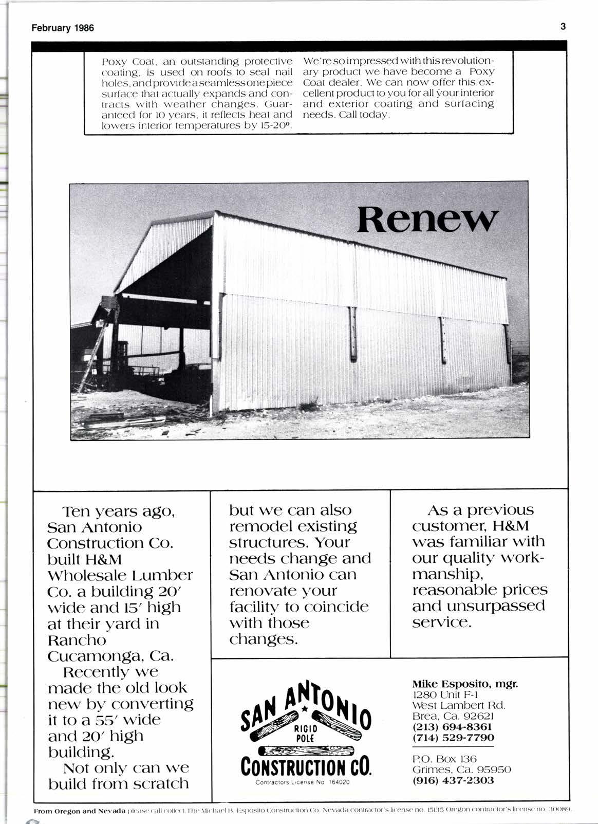 Mike Esposito, mgr. 1280 unft F-l \,!est Lambert Rd. Brea, Ca. 926.21 (213) 694-436r (7141529'-779,0 P.O. Box 136 Grimes. ca. 95950 (9161437-2303 'MN ES Cownuclrtlil c0. Co^tracrors L,cense No 164020 February 1986