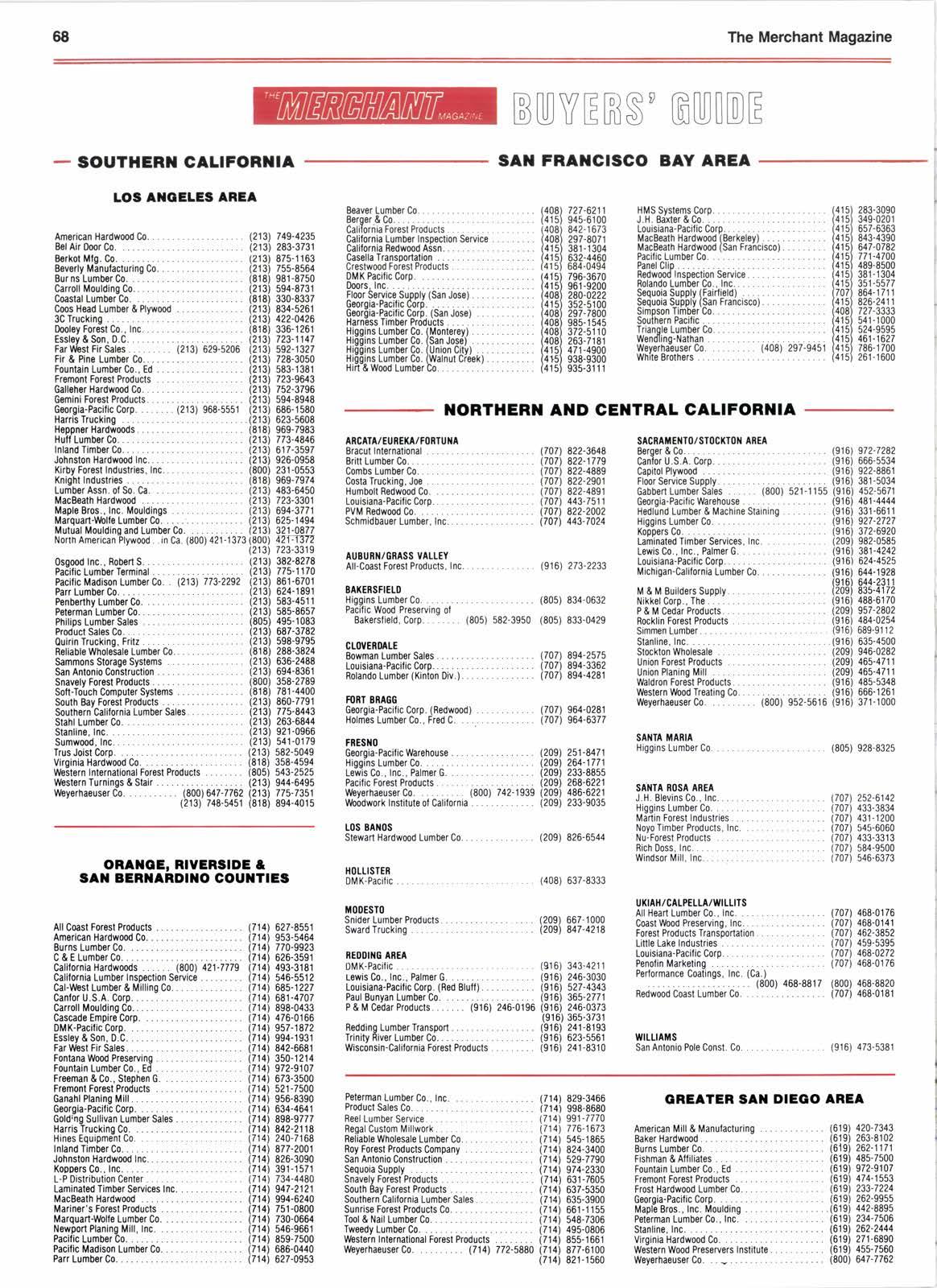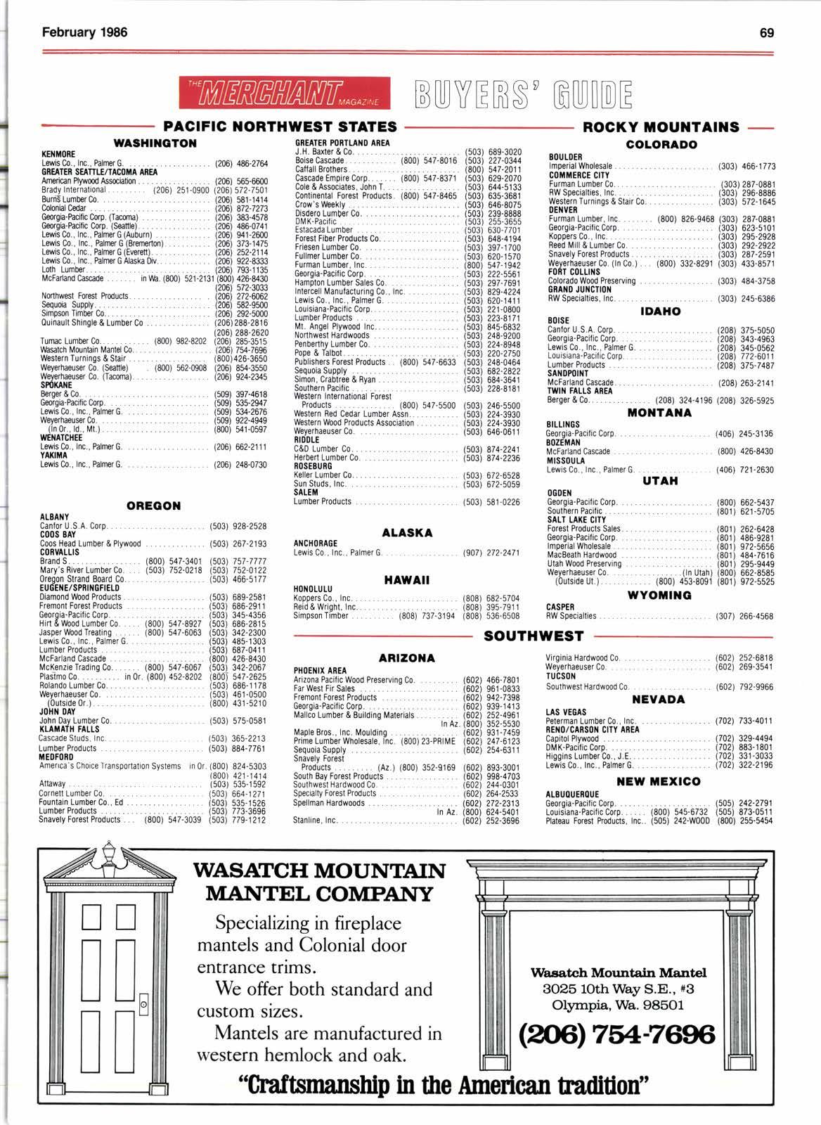 AI{CHOBA6E Lewis Co.. lnc.. Palmer G. (503) 689-3020 (503) 227-0344 (800) 547-2011 (s03) 629-2070 (s03) 644-5133 (503) 635-3681 (503) 646-8075 (503) 239-8888 (503) 255-3655 (503) 630-7701 (503) 648-4r94 (503) 397-1700 (503) 620-1s70 (800) 547-1942 (s03) 222-5561 (503) 297-769r (503) 829-4224 (503) 620-141 1 (503) 221-0800 (s03) 223-8171 (503) 845-6832 (503) 248-9200 (503) 224-8948 (503) 220-2750 (s03) 248-0464 (s03) 682-2822 (503) 684-3041 (503) 228-8181 80ut0E8 lmporlalwholosals (303) 466-1773 c0lttttEBcE ctTY Furman Lumbor Co. . (303) 287-0881 Rwspscialti€s,Inc....... (303i296-8886 WesternTurninos&StairCo..... . (303) 572-1645 DE1{YER Furman Lumbor, Inc, . (800) 826-9468 (303) 287-0881 Georgia-Pacilicoorp. (303) 623-5101 Kopp€rsoo.,Inc....... ........ (303) 295.2928 Re€d Mill & Lumbor C0 (3031 292-2922 SnavelyForestProducrs........ (303i 287.2591 WeyerhaousorC0. (lnCo.)... {800) 332-8291 (303) 433-8571 F0RT CotLr{S (503) 246-5500 (503) 224-3930 (503) 224-3930 (503) 646-0611 Coloradowood Prssorvino 0nAil0 iu1{GTt0il RW Specialties, Inc. TDAHO BOISE Cantor U.S.A, Corp. (208) 375-5050 G€oroia-Pacificcorp. (208) 343.4963 Lewisoo.,lnc.,PalmerG....... (208) 345.0562 Louisiana-Pacific Corp. (208) 772-601 1 LumberProducts (208) 375-7487 sAil0P0t1{T McFarland cascade. (208) 263-2141 TWITI FAILS AREA Eorg€r&Co.. (208) 324-4196 (208) 326-5925 tot{TALa 8ttUl{GS G€orgia.Pacific Corp. BozEilAl{ McFarlandoascade 1{rss0uu Lewis Co.. lnc.. Palmer G Lewis Co., Inc., Palrnsr G (206) 248-0730 (503) 874-2241 (503) 874-2236 (503) 672-6528 (503) 672-s059 (s03) 581-0226 (9071 272-2471 oREOOtl t{AwAll (808) 682-5704 (808) 395-7911 (808) 737-3194 (808) 536-6508 0G0El{ Georgia-Pacificcorp. (800) 662-5437 southernPacilic (801) 621-5705 SALT LAKE CITY Forest Products Sal6s. (801) 262-6428 Georgia-Pacificcorp. . (801) 486-9281 lmperialwholssale (801) 972-5656 MacBeathHardwood (801) 484-7616 UtahwoodPreseruing (801) 295-9449 Weysrhaeussrco. ......(lnUtah) (E00) 662-8585 (outsideur.). (800) 453.8091 (801) 972.5s25 wYottl{o ALBAIIY Canfor IJ.S.A. Corp. (503) 928-2528 COOS BAY Coos Head Lumber & Plywood . (503) 267-2193 c0BvAtLts Brands... .... (800) 547-3401 (5031 757-7777 Mary's Biver Lumbor C0. (503) 752-0218 (503\ 752-0122 orsgonslrandBoardco... (503) 466.517i EUGEIIE/SPRIIIGFIETD DiamondwbodProducls........ (503) 689-2581 FrsmontForestProducts (503) 686-2911 Geor0ia-Pacilic Corp. (503) 345-4356 Hirl&!\bodLumberCo.. (800) 547-8927 (503) 686-2815 Jasp€rWbodTreatino (800) 547-6063 (503) 342-2300 LewisCo.,lnc.,Palmerc....... (503) 485-1303 Lumbsr Products {503) 687-041 1 McFarland Cascade . (800) 426-8430 McKenzisTradinoCo....... {800) 547-6067 {503) 342-2067 Plasrmoco.... l..... inor.iao6 csz-szoz iedoj slz.zozs Rolando Lumber co. (503) 686-1 1 78 Wby€rha€ussroo. ... (503) 461-0500 (0ulsid60r.). (800) 431-5210 JOHII llAY John Day Lumber Co. (503) 575-0581 t(.ttATI FArrs CascadeStuds,lnc....... (503) 365-2213 Lumb€rProducts ... (503)884-7761 TEOFORD 1t0l{oLUt u Koppers Co., Inc. Rsid & Wri0ht. lnc Simoson Timber CASPCR RW Specialtiss (307) 266-4s68 SOUTHWEST Amenca's Choice Transporiation Systems in 0r. (800) 824-5303 (800) 421-1414 Attaway (503) 535.1592 Cornell Lumber Co. . (503) 664-1 271 FounlainLumberCo.,Ed....... (503) 535-1526 LumberProducts (503) 773-3696 snavely Forsst Products . (800) 547-3039 (503) 779-1212 ARIZOXA