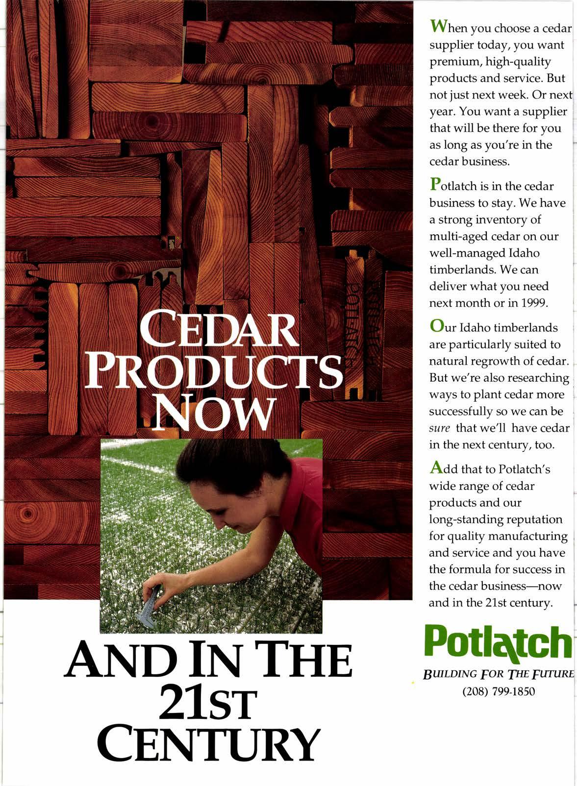 Onr Idaho timberlands are particularly suited to natural regrowth of cedar. But we're also researching ways to plant cedar more successfully so we can be sure thatwe'll have cedar in the next centur/, too. Aaa that to Potlatch's wide range of cedar products and our long-standing reputation for quality manufacturing and service and you have the formula for success in the cedar business-now