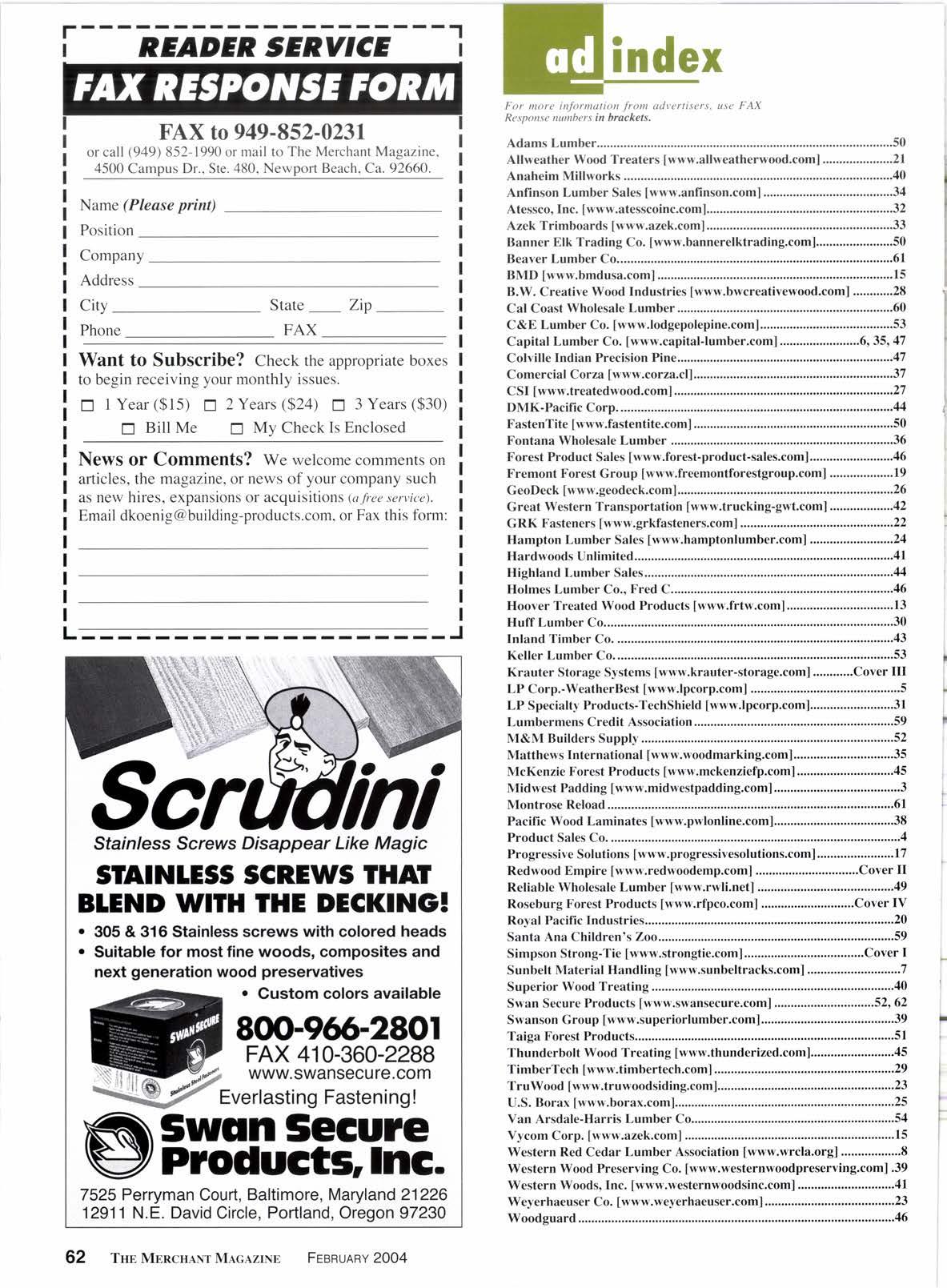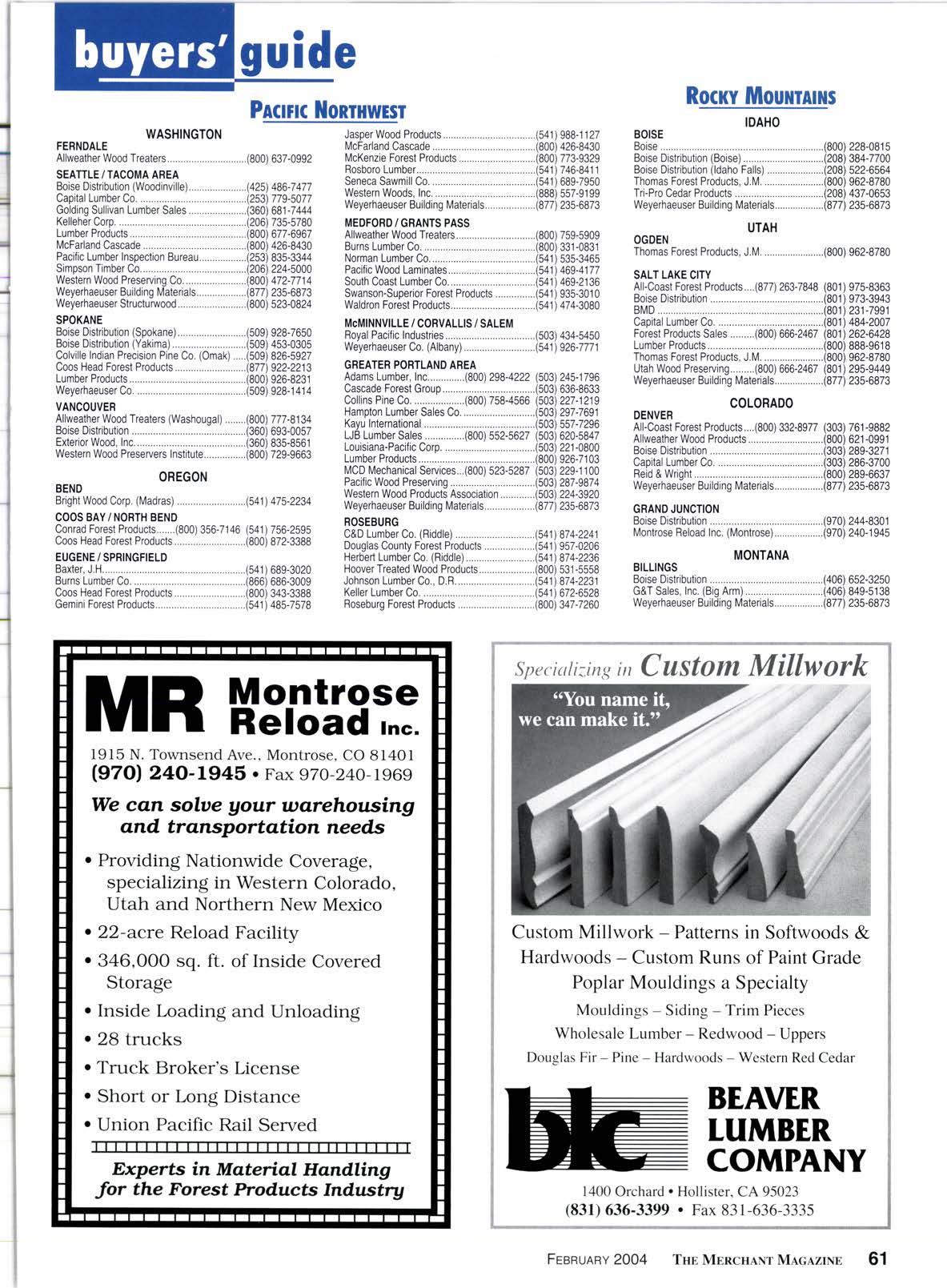 Adams Lumber .......'...50 Alfweather Wood Treaters Iwww.allweatherwood.corn] .....................21 Anaheim Millworks........ .....................40 Anfinson Lumber Sales Iwww.anfi nson.com] .........-.-.............-..........34 Atessco, Inc. [www.atesscoinc.com],,...,.. .........,............32 Azek Trimboards [www.azek.com].,...,............. ...........33 Banner Elk Trading Co. [www.bannerelktrading.com].....,.................50 Beaver Lumber Co...................., ..'.'..'..61 BMD [www.bmdusa.com] t5 B.W. Creative Wood Industries [www.bwcreativewood,com] ............28 Cal Coast Wholesale Lumber. ............60 C&E Lumber Co. [www.lodgepolepine.com] Fontana Wholesale Lumber ...............36 Forest Product Sales Iwww.forest-product-sales.com],.............. .....,....46 Fremont Forest Group [www.freemontforestgroup.com] ...................19 GeoDeck [www.geodeck.com].................. ..........,..........26