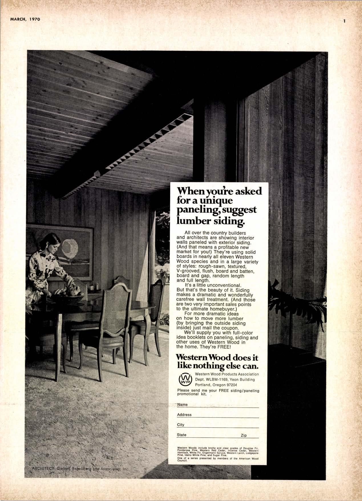 All over the country builders and architects are showing interior walls paneled with exterior siding. (And that means a profitable new market for you!) They're using solid boards in nearly all eleven Western Wood. species and in a large variety of styles: rough-sawn, textured, V-grooved, flush, board and batten. board and gap, random length and full length.