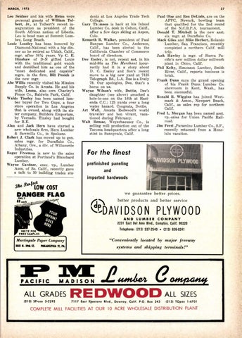 Ar. pErRcE co. .........-....-........---.--...............--..-....... 9 AMERICAN TOREST PRODUCTS CORP.. BUIDING MATERTAT.S DrV. ....-.-.-.........COVER I AT ERTCAN tUtiEER SPECTES ..........-.............20 & 2l BEr.-ArR DOOR CO. ...-........-.....................-.....r3 & 33 EERKOT MANUFACTURTNG CO. ..-...-,...-............. 36 BEVERTY l{ANUFACTURTNG CO. ...,........-............. 3l cAt cusToM Mil.t ........................--.........--..,...-.-.. 33 CATIFORNIA I.UMBER INSPECTION SERVICE.......- 35 cAsEil.A TRANSPORTATTON CO. ._.,_...............-... 35 COI.ONY PAINTS tNtAND LUMBER CO. ............-...-"..............COVER lll JOHNSON PET-DOR ....-..-.....-................-............-... 3l TAMON t UMSER CO. ......,-.-...-....-.,-......-.............--.- 25 LOOP TUMBER & l,tll.t CO. .--.-........,,...-................ 32 MARTf NGATE PAPER CO. ......--...-...-...-....-......... 27 T ARQUART-WOf,FE f,Ul,lBER CO. -.-....-.................. 21 t uTuAt Aouf.Df NG & tUMBER CO. ......--.....-..-.,. 22 NETH TUAABER sAtES, A. W. -............................... 36 NrcotET oF cAUFORNtA ....-...........-.....-..,.......... 32 oscooD, rNc., R. s. .,.,.-........ 2 pActFfc MADrsoN IUMBER co. ...-.,-.,.-.-...........-. 27 pAN AStATTC TRADTNG CO. ....,,.--,.-.-.,-.-.,..-........ l8 PAUt BUNYAN tUri,tBER CO. .....--....-.-.---....-..-. 29 PENBERTHY LUT BER CO. ................-......-....COVER rl PHTUPS tUMSER SAtE5,...........-.--..--.-..--.,........... 3l PI,ACERVlLtE lUl,tBER CO. ....-..-..........-....-.......-,... 35 POPUTAR PANELS. tNC. I RODMAN |NDUSTnTES ......._..._.. 20 ROf-ANDO tUT BER CO. .,.--..-.. 26 S|ERRA PAC|FTC ......-.....-...........',14 STANDARD STRUCIURES 23 suMMtT f.uA BER CO. ...._..............-.-.--.-...-.....-.._-.-. 1 suN tUMBER CO. .....,.............................-.._..."......_-. t,t TWIN HARBORS IUl,tBER CO. .-.........,--.......-..----. 29 uNloN PACtFIC RATtROAD ...._...-_.....-_....-COVER lV wtscoNstN-cAilFoRNtA FoREST pRoDucrs.-.... t9 WOODBOND, INC. Don't Just Sit Around . . Gall HEXBERG LUffIBER SALES INC. tugar pine - pondetoca pine - whita fir - douglat fit - incente cedat truck and tlrailer or direct tail chipmcnu 5855 Noplcr Plozo, long Bcoch, Colif. {2131 775-6107 l2l3l 433-2172 lTlal 826-0636 tUMBil ONilERT fiom Be*of y' EsPEctAtrY ADAPTABU to cuslomEn IGEDS y' sctENTrFrcAttY DES|GNED FOR AtI. TY'ES OF WORK y' BAtANcEo K'R EASE OF HANDII]{G Let Us Prove This ls lhe Cqrf for You ! Cqll or write for frce brochurc BERI(()I MAilUTAfiURIlIO (OI,IPAIIY THE WORLD'S BEST \^/OOD PRESER\,ATIVES Com9ry with F.d.r.r Sp.citic.tio. fr-W-62 COPPERilATE "250'' lyp. rr, comp. B l(rillrE "9" TyP. il. Cohp. A 11285 Gosr Sl., Sun Volley, Cslif. Phoner 12l3l 875-1163 A.'TV" NETH LUMBER SALES Douglas fir dimension boards & studs ue sb;p o;d Western hemlock dimension boards & studs utater and. roil. Douglas fir, white fir and redwood studs 13111 Ventura Blvd., Studio City, Calif. 91604 r (213) 783.0544 & (213) 872-l2t0 SOUTHERN CALIFORNIA REPRESENTATIVE FOR DANT & RUSSELL. INC.