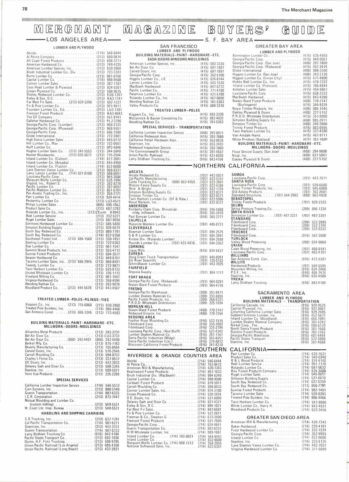 A-L!_EIECEQo ...45 AMERICAN MILL & MANUFACTURING.INC.. . . . . . . 66 BEAVERLUMBERCO.. . . ., ., 66 BEL.AIR DOOR CO.. CO\/ER II BERKOTMANUFACTURING. 24 BEVERLY MANUFACTURING CO. 24 BROWNLUMBERCO, ........64 CAL-PACIFICMANUFACTURING 46 CAPITALLUMBER CO.. . . .COVERIV CARDWELL FOREST PRODUCTS . . .72 CHA8.LEY'SFENCECO.. 32 COASTWOODPRESERVING. . , . : :68 qQLUMBTACALTFORNTA. . sO qoosHEADLUMBERCO.. . ar qR4,NEMrLLS. ........36 qRoWNPLYWOOD ......42 DA,NT&RUSSELL,INC.. . 53 DIS-DEROLUMBER CO..AL. 38 EssLEl_&soN,D.C. .....37 FARWESTFIRSALES ....44 FEATHER RIVER MOULDING CO. 49 ErR&PTNELUMBERCO. . zz GEARMORE,INC.. . .COVERIII GEORGIA-PACIFIC, :. . . :li qlqo.. .......bl GITTINGSLUMBERCO.. . . : 30 HARWOODPRODUCTS . .7 4I.I-LIIUMBERCO.,MAX . ., . 24 IIODBSWALLLUMBERCO.. . 23 IIUFFLUMBERCO... ....49 HUNTER WOODWORKS. INC.. . . . . 29 TMBERTALWHOLESALE. . . . .9 JUSTUSLUMBERSALES ., 54 KELLEHERLUMBERCO.. 55 KTNZUACORP. ........35 KOPPERSCO. ........21 LAMONLUMBERCO. 34 LEWIS&CO.,PALMER G.. 27 MARQUART-WOLFE LUMBER CO. . 48 MASONITECORP.. ......33 MUTUALMOULDINGCO.. . . . 68 NEISEN.WARD .. ..6 NIKKELCORP.,THE .19 NORTH SIERRA FORESTPRODUCTS ....72 NOYOTIMBERPRODUCTS 77 osGooDINC.R.S. ......69 PACIFICFORESTPRODUCTS 52 PACIFICLUMBERCO.. . . .25 &26 PACIFICMADISON .....75 PANASIATICTRADINGCO. 74 PARRLUMBERCO... ....7O PAULBUNYANLUMBER CO.. 70 PHILIPSLUMBERSALES .. . . . .71 P.R.O.D.WHOLESALE ...7L PRODUCTSALES CO, 4 &2OI P,S.F. INC.. .....40 QUIRINTRUCKING.FRI?2. .. .72 REDWOODEMPIRE. INC. .. .2A REID & WRIGHT. ROCKLINFORESTPRODUCTS., 39 ROUNDS LUMBER CO.. , COVER I ROYFORESTPRODUCTSCO. ., . 48 SAN ANTONIO POLECONSTRUCTION ...41 SELMAPRESSURE TREATING., 70 SEQUOIASUPPLY. .......61 SIERRAPACIFIC INDUSTRIES. 79 SIMPSONBUILDINGSUPPLY. 56 SIMPSON TTMBER CO. . . . . . .3 SOUTHBAYREDWOODCO. .. . . . .5 STANDARDSTRUCTURES 4L STARLUMBERCO... .67 TRINITYFORESTPRODUCTS. . 65 TWEEDYLUMBERCO.. . . . 80 UNITEDLUMBERSALES ., .67 VALLEYWOODPRESERVING 43 WHITELUMBERCO..HARRY . . 69 YAWKINNEYCO.... ....62 I'