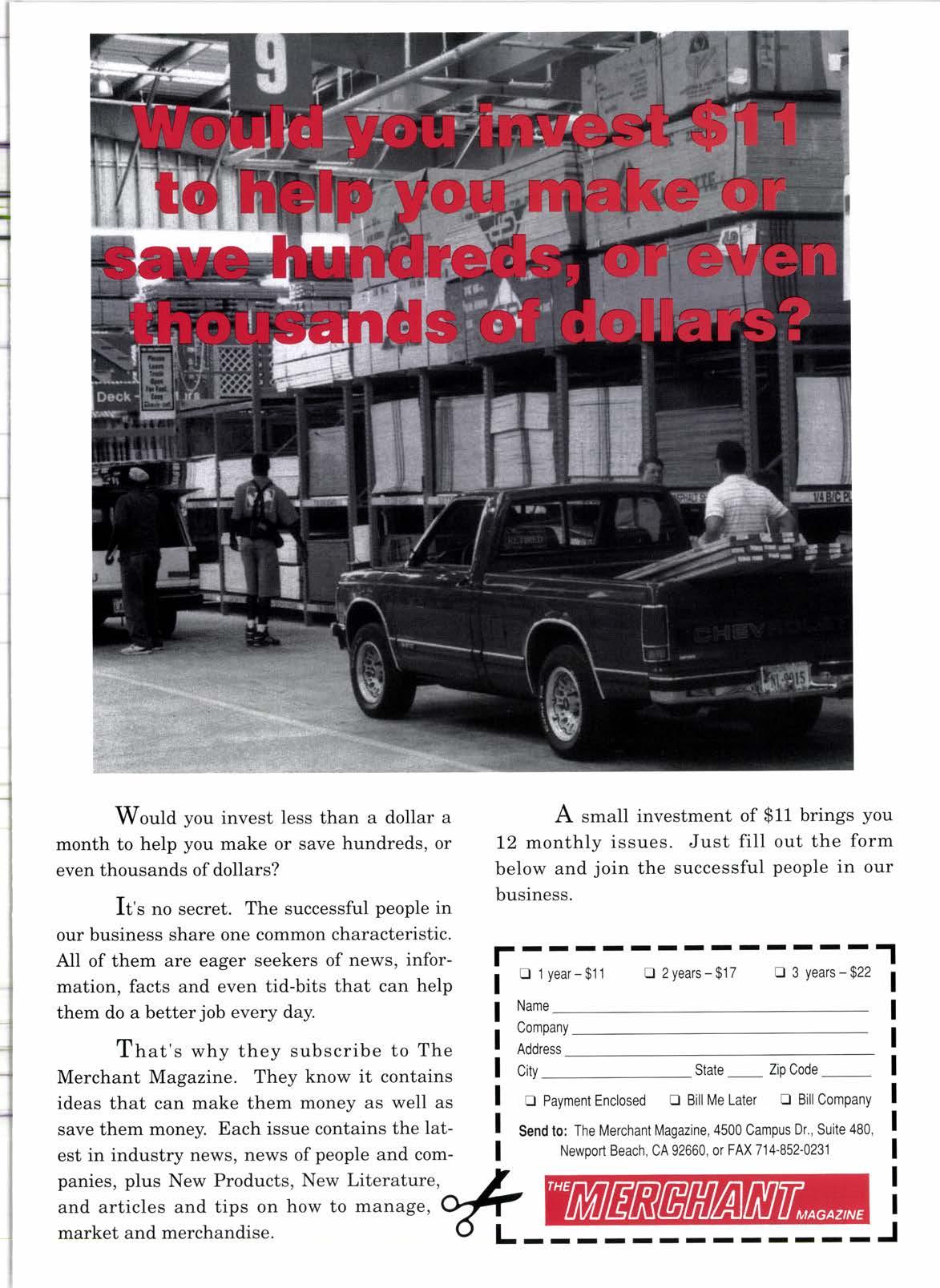 rrmance, serviw tl It'$ t}le of*isus )nahip bctween all of rhrse. Bur roor.n ro ewl$afid slrdurd Fy"bnri. {i* sptlmun rr\F ii s rhalbnr. nFr'. eh.rc Wlll.scttG c&n icl!. wr ms{uLciu.e ilshsi, ljaisr6.nd olfc rhe (oorbiaarbaarrF{dud DOOLEYLUMBER COMPANY PHONE FAX 7t4-675-9690 714-675-9691 Circle No. 156 on o. 54 52 THE' MrncxlNr Mlcazrnn Mnncr '1997 Get a copy of any New Literature item by contacting each company directly. Mention you saw it in The Merchant! 'fA\ l P. O. Box 5866 BALBOA ISLAND, CALIFORNIA 92662 USA
