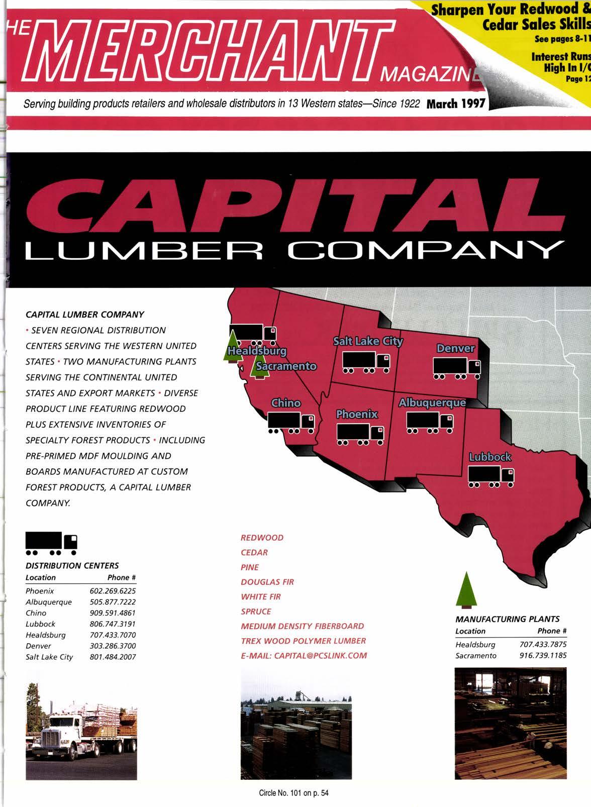 . SEVEN REGIONAL DISTRIBUTION CENTERS SERVING THE WESTERN UNITED STATES. TWO MANUFACTURING PLANTS SERVING THE CONTINENTAL UNITED STATES AND EXPORT MARKETS. DIVERSE PRODUCT LINE FEATURING REDWOOD PLUS EXTENSIVE INVENTORIES OF SPECIALTY FOREST PRODUCTS INCLUDING PRE-PRIMED MDF MOULDING AND BOARDS MANUFACTURED AT CUSTOM FOREST PRODUCTS. A CAPITAL LUMBER COMPANY.