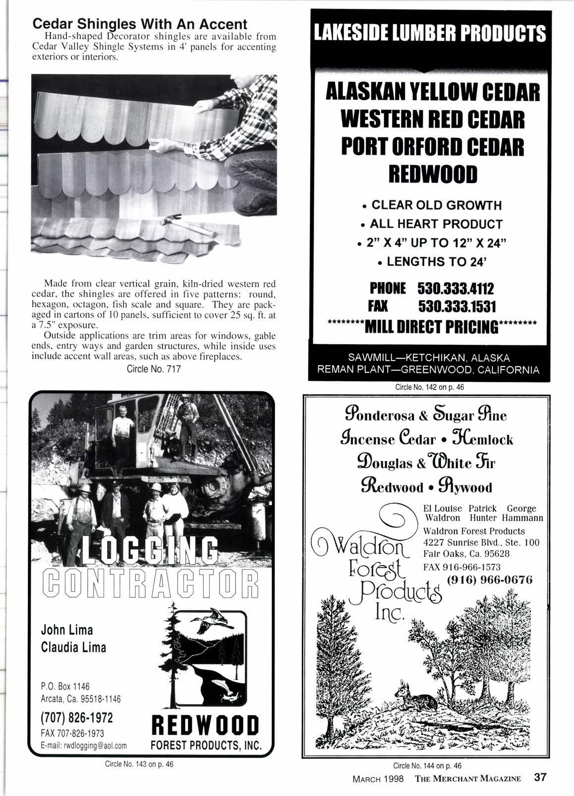 a complete line of Redwood, Sunwood'and CCA pressure treated Doug-Fir and Hem-Fir lumber, timbers and specialty items, California Cascade gives customers peace-of-mind knowing they can rely on a steady supply of quality products. "@"rffiiK crnqil #Oedication to innouatiae seruice {ft Sra tu -of- the - art facilities # Uodern incisor te chnology *g*panded coaered storage #AWPA Standards for quality #Fort turnaround #?SO Auailable 7512 l4th Avenue Sacramento, CA 95820 Phone (916) 736-3353 Fax (916) 736-2348 http ://www. californiacascade. com ( E-Mair) l0 437 7 .3355@compuserve. com Circle No. 107 on D. 46